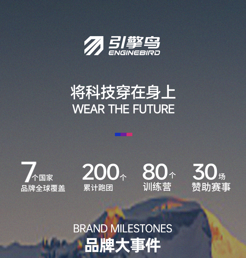 - 始创于2012年,引擎鸟户外(深圳)有限公司旗下的中国原创专业跑步服装品牌,以国际一线专业标准设计、研发、生 面世以来,引擎鸟不断追求产品的轻量化革命和特种运动的专业性,持续推出符合运动科学和大众需求