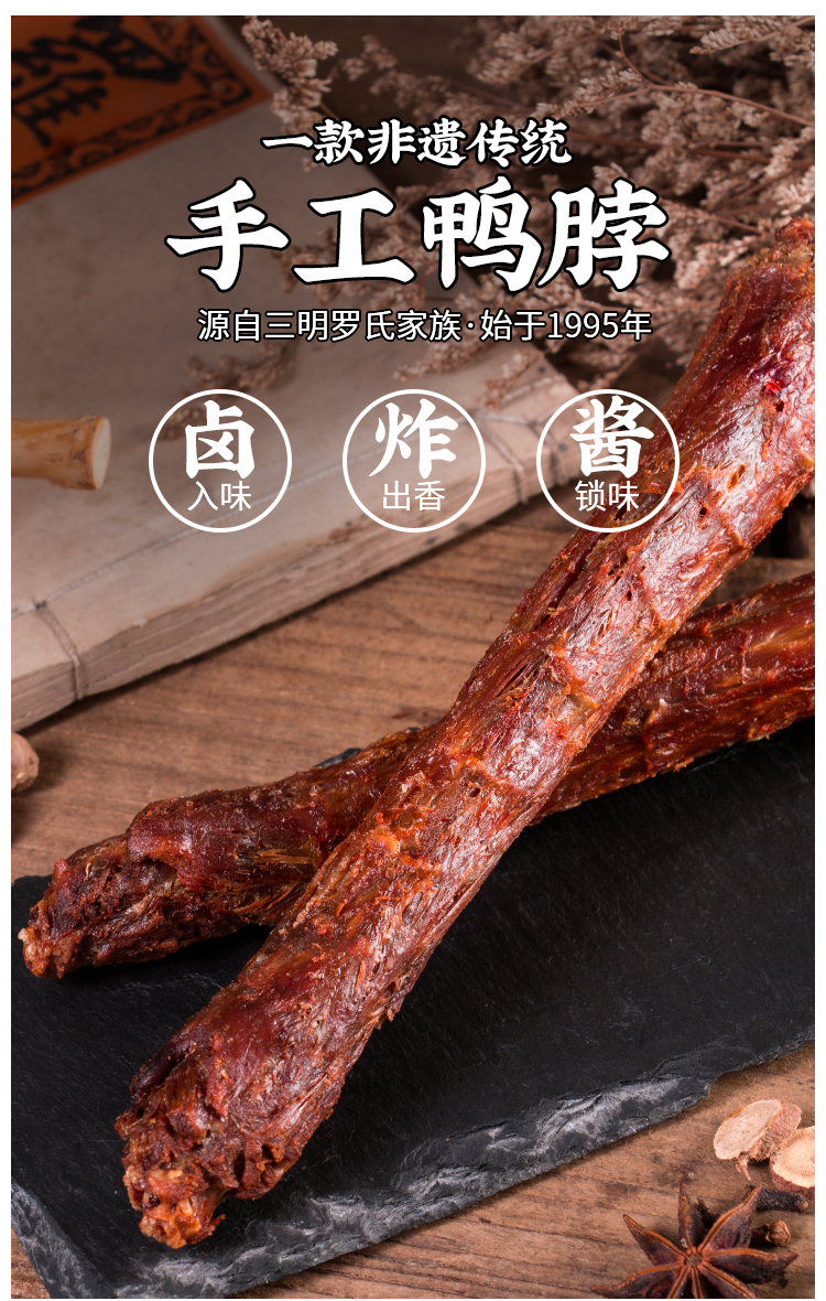 熏鸭之于三明,犹如烤鸭之于京城、烧鹅之于广州。“罗大胡子”熏鸭始创于1995年,是三明熏鸭创始品牌。