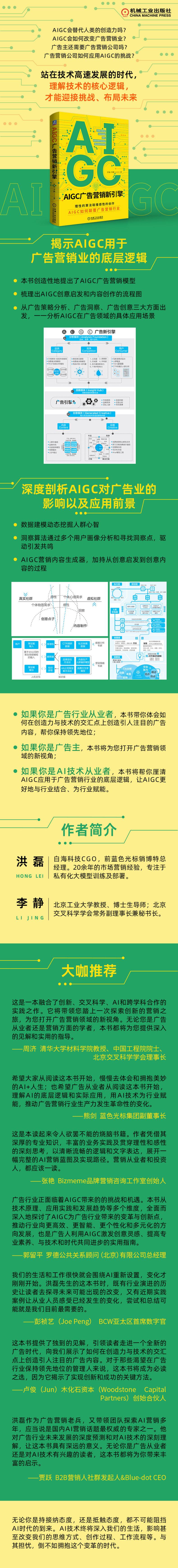 AIGC会替代人类的创造力吗?AIGC会如何改变广告营销业?广告主还需要广告营销公司吗?广告营销公司如何应用AIGC的挑战?站在技术高速发展的时代,理解技术的核心逻辑,才能迎接挑战、布局未来。如果你是广告行业从业者,本书带你体会如何在创造力与技术的交汇点上创造引人注目的广告内容,帮你保持领先地位;如果你是广告主,本书将为您打开广告营销领域的新视角;如果你是AI技术从业者,本书将帮你厘清AIGC应用于广告营销行业的底层逻辑,让AIGC更好地与行业结合、为行业赋能。