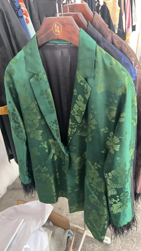 盛唐牡丹| 民国真丝老面料配鸵鸟毛西装外套-深绿