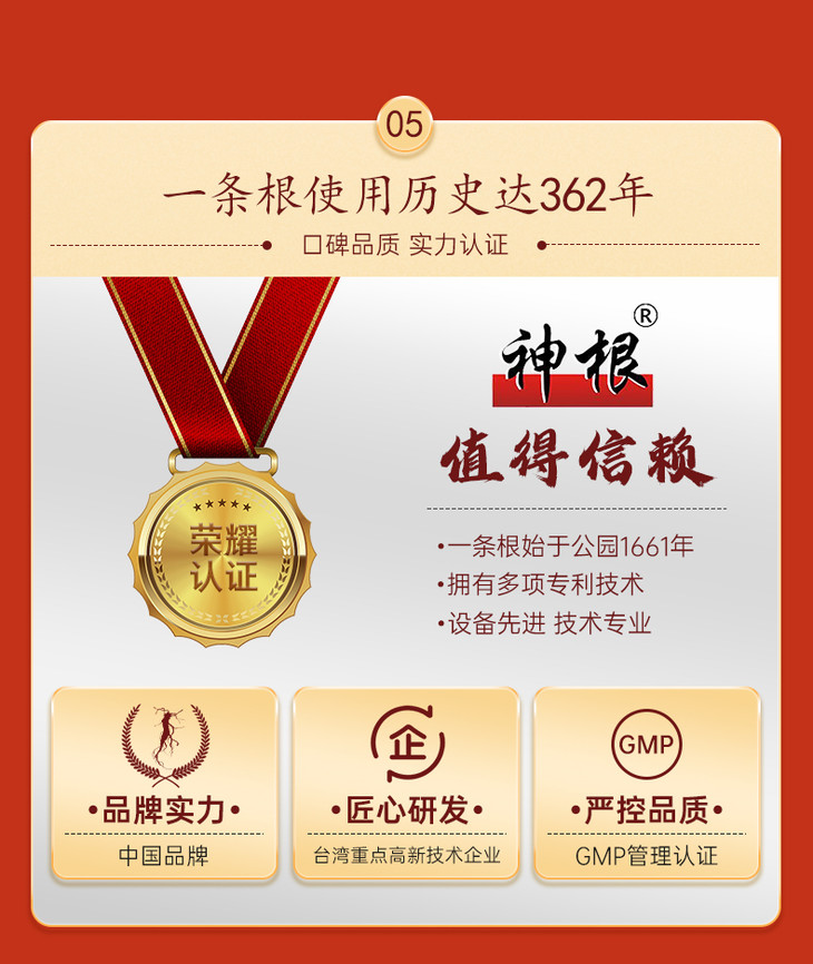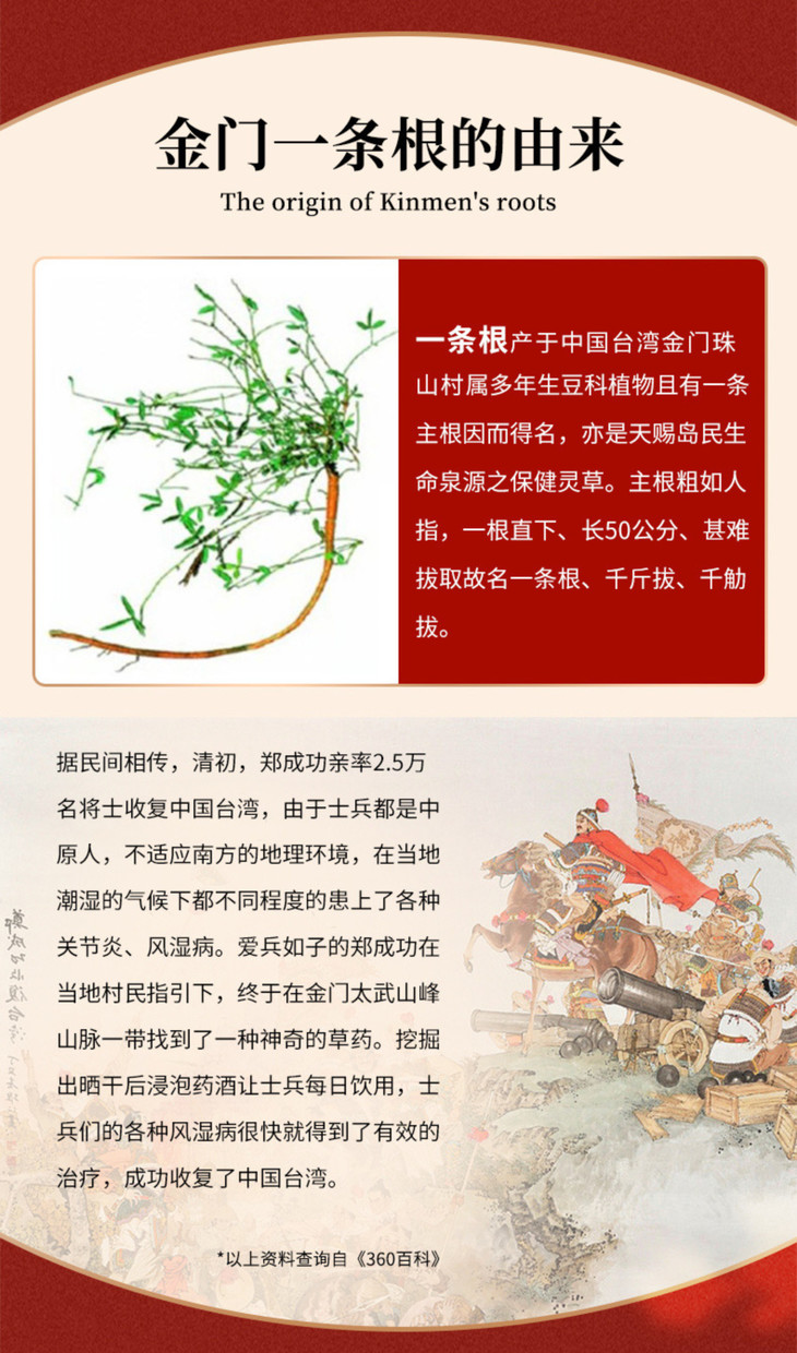 一条根是一种生长在金门的天然植物,属多年豆科植物,主根粗如人指,一根直下,长约50公分甚难拔取,故名“一条根”,属珍贵植物,因此又有“金门一条根更胜韩国高丽参”的美誉!根据《本草纲目》的记载,一条根具有辛味,温性,可以舒筋活血,祛风去湿,解热镇痛等功效。