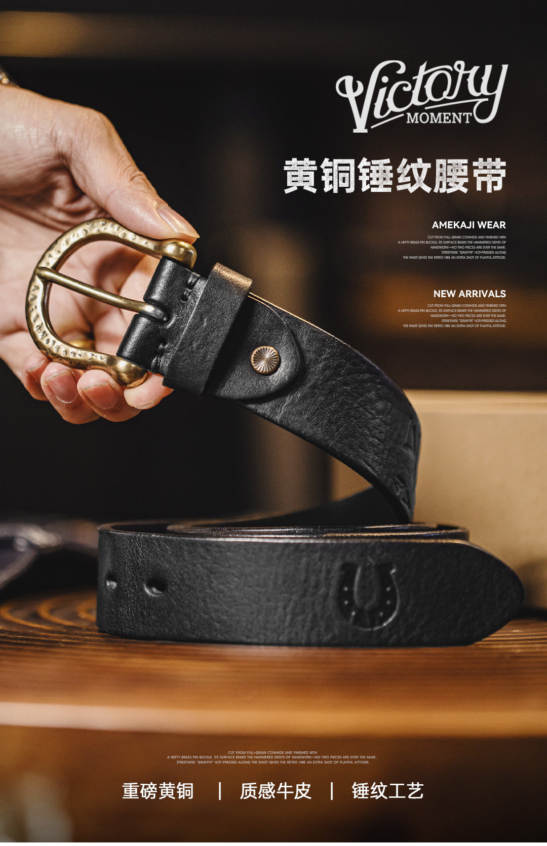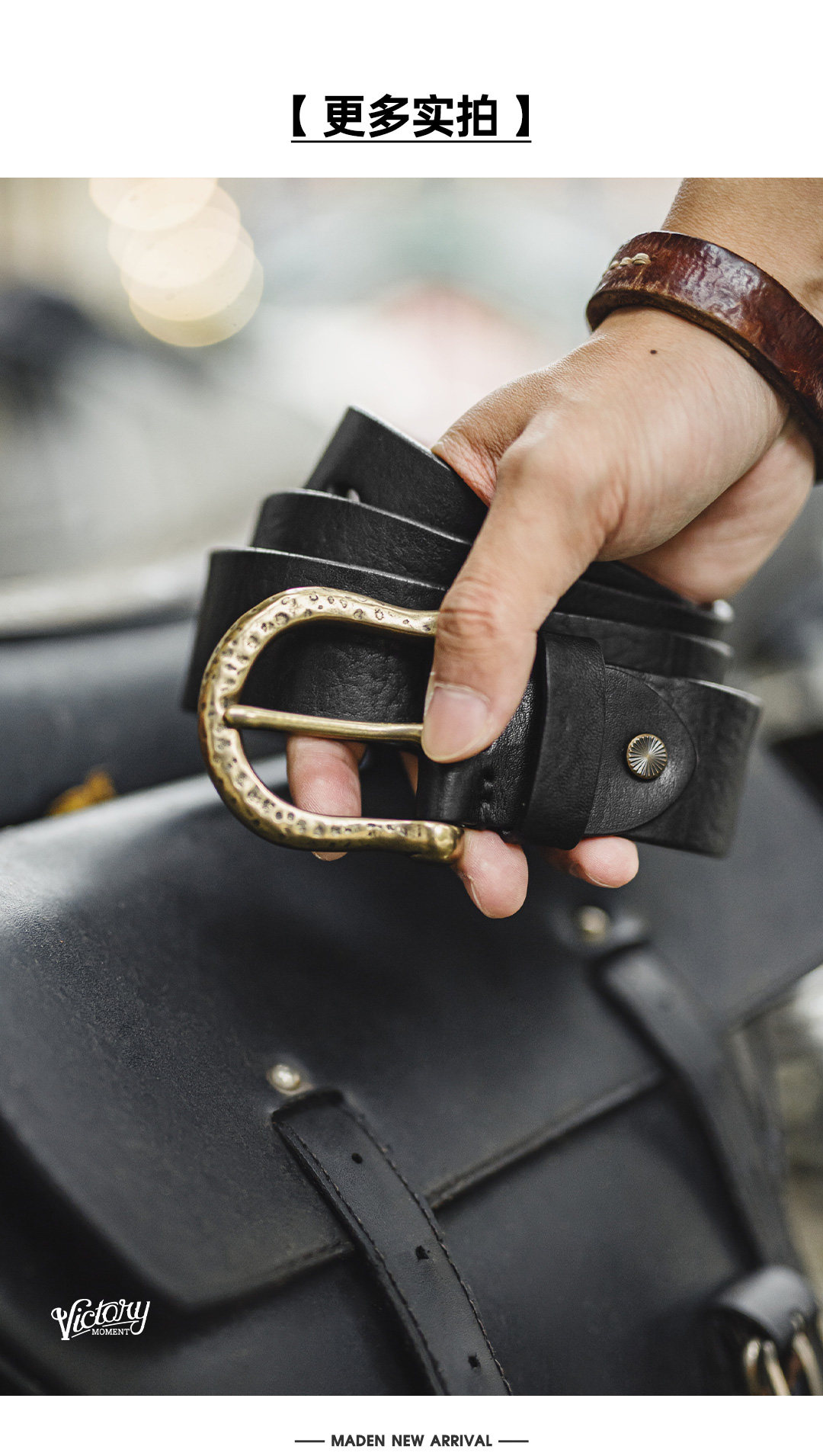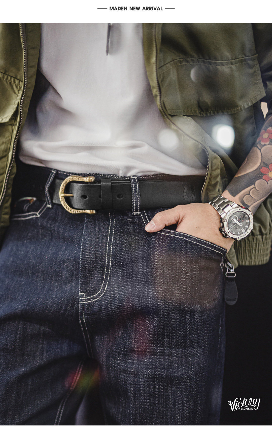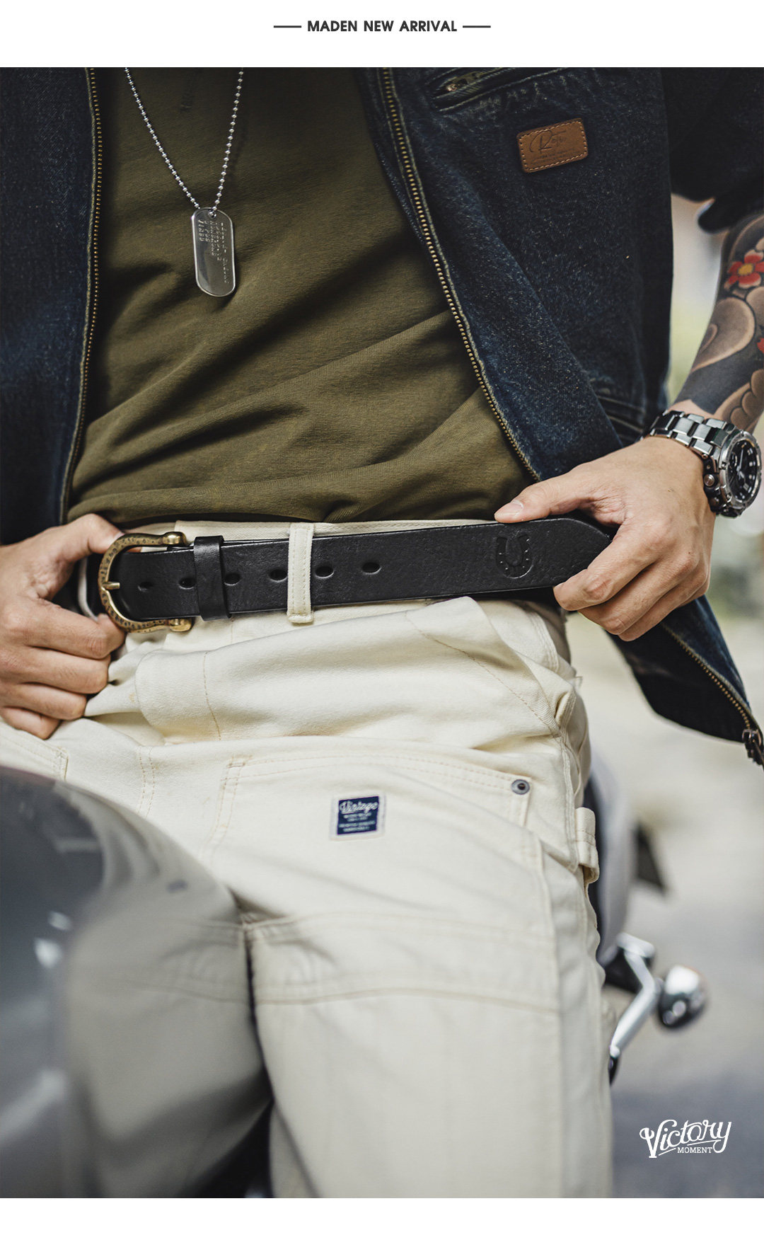 马登工装美式复古黄铜扣头皮带头层牛皮腰带单针真皮裤腰带男款