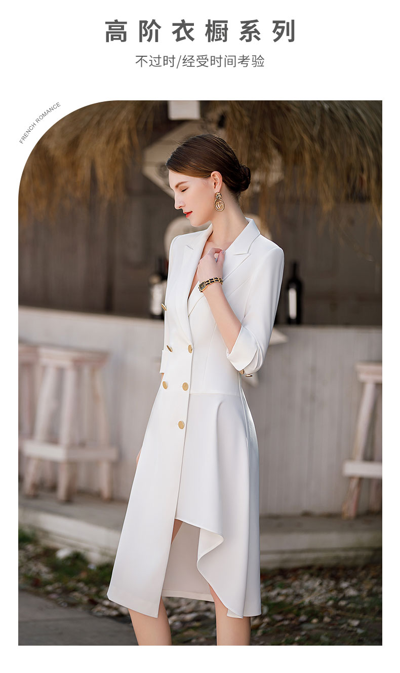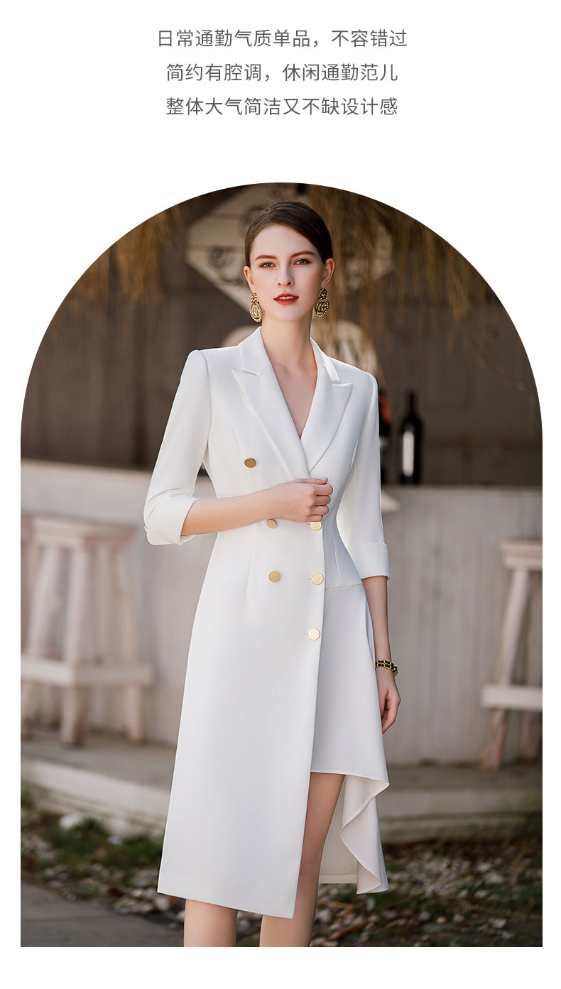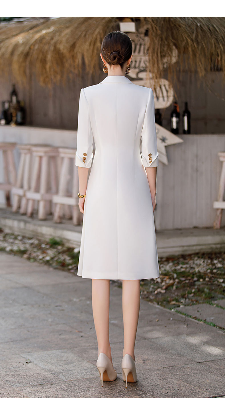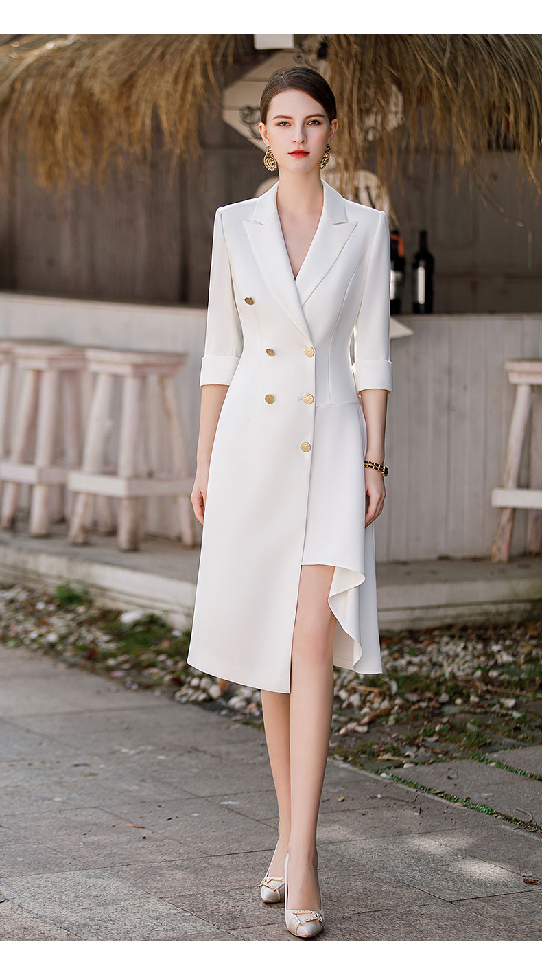 白色双排扣连衣裙女2023春夏七分袖不规则中长裙职业装a字裙子