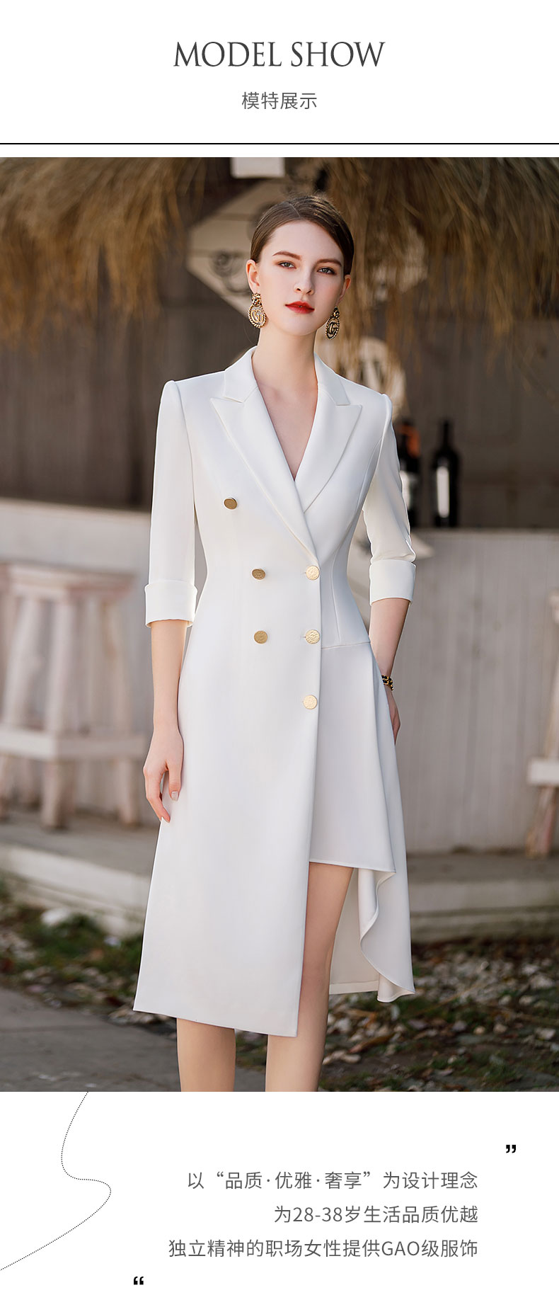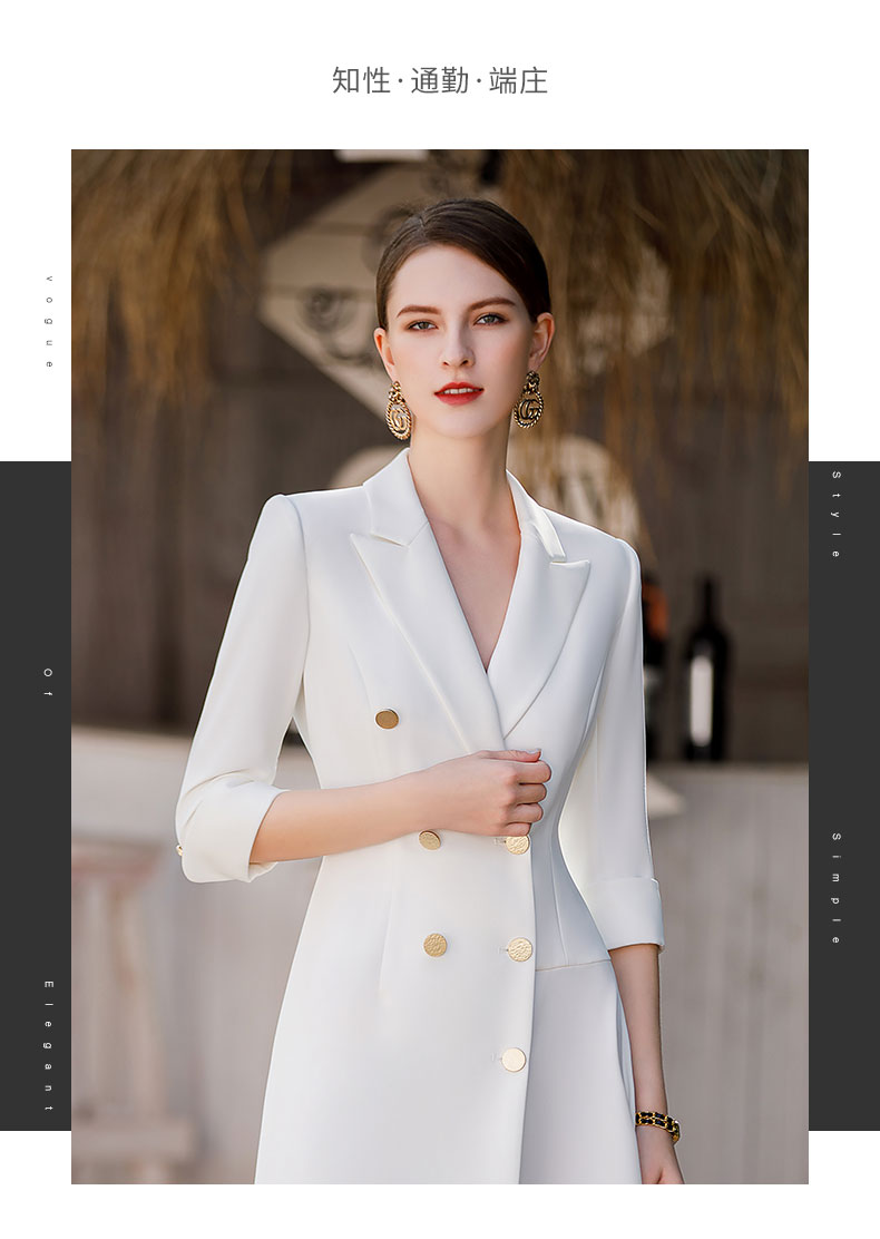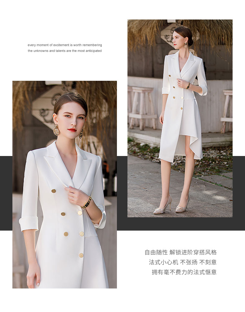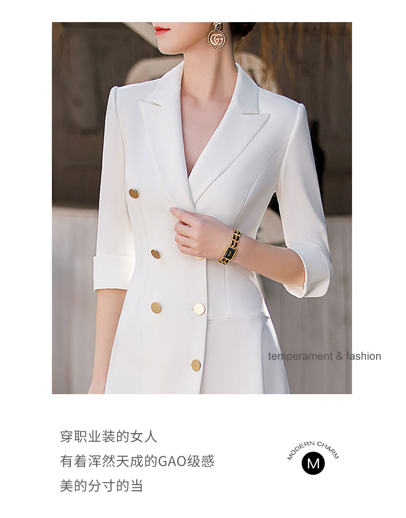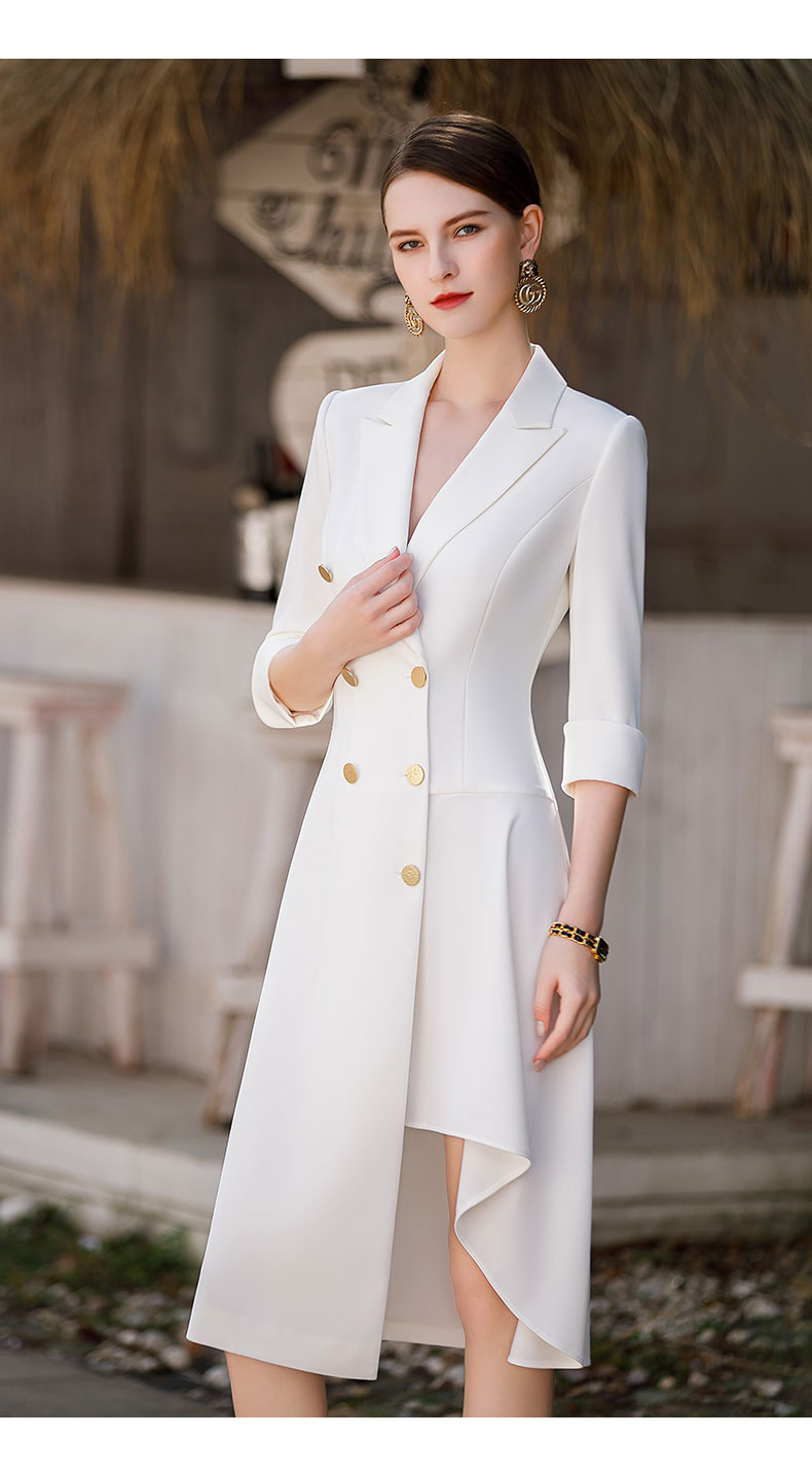 白色双排扣连衣裙女2023春夏七分袖不规则中长裙职业装a字裙子