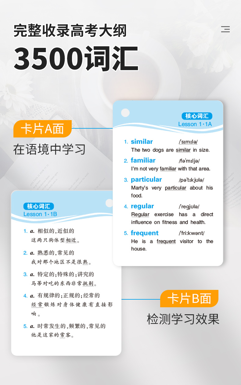5. 核心词汇讲解详细:卡片A面有单词、音标和经典例句,B面为词性、释义和例句译文;