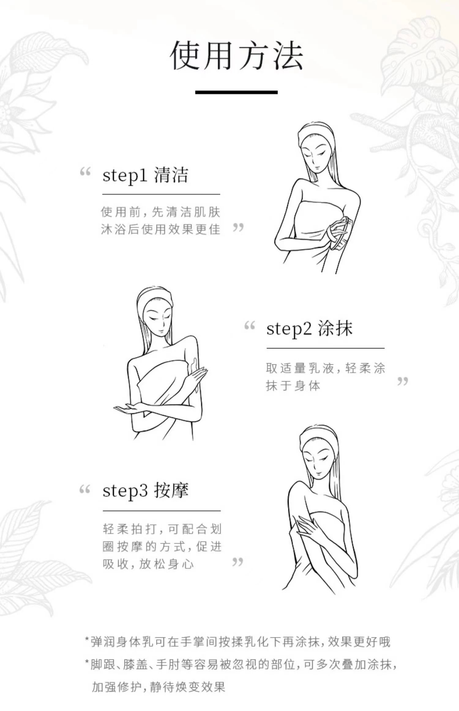 【针对人群】①身体肌肤有干纹、细纹、粗糙缺乏弹性、暗沉的人群