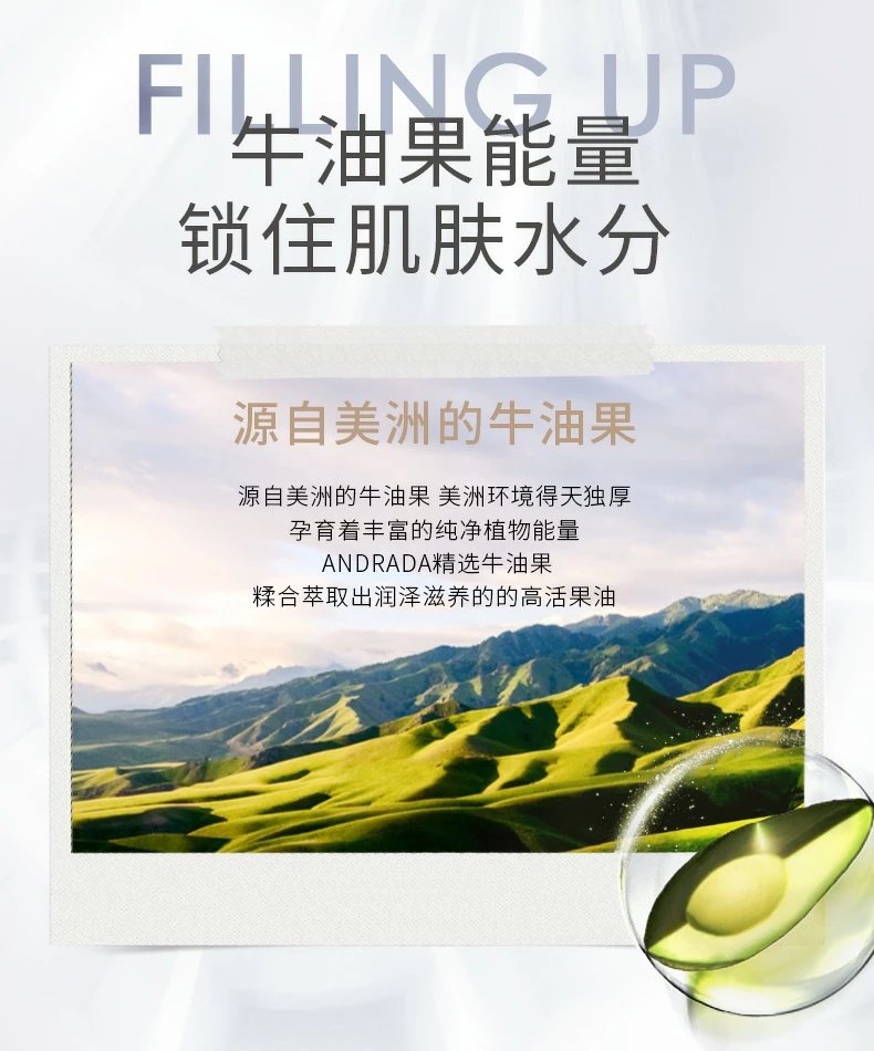 ANDRADA精选源自美洲的牛油果,精萃出润泽滋养的高活果油,亲肤的植物油脂高滋润、强锁水,相比工业油脂,更清爽不黏腻~