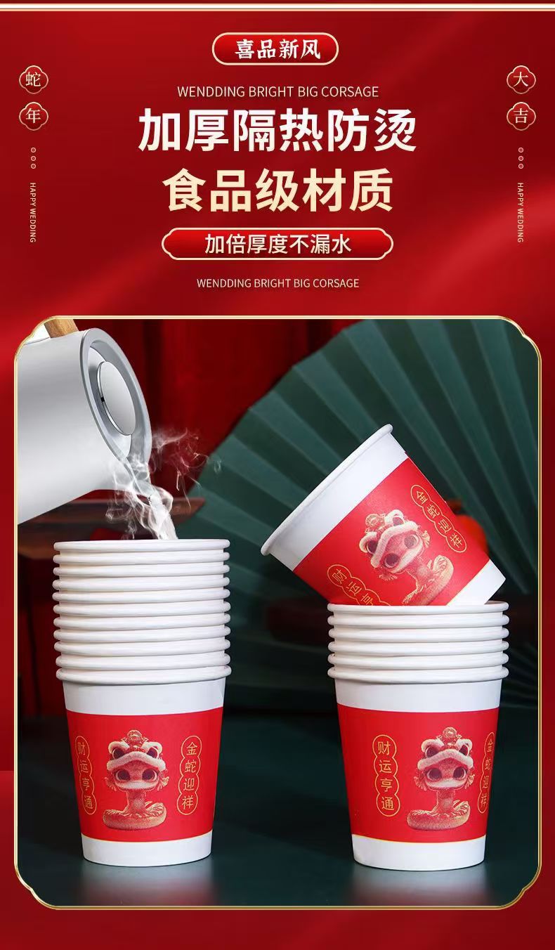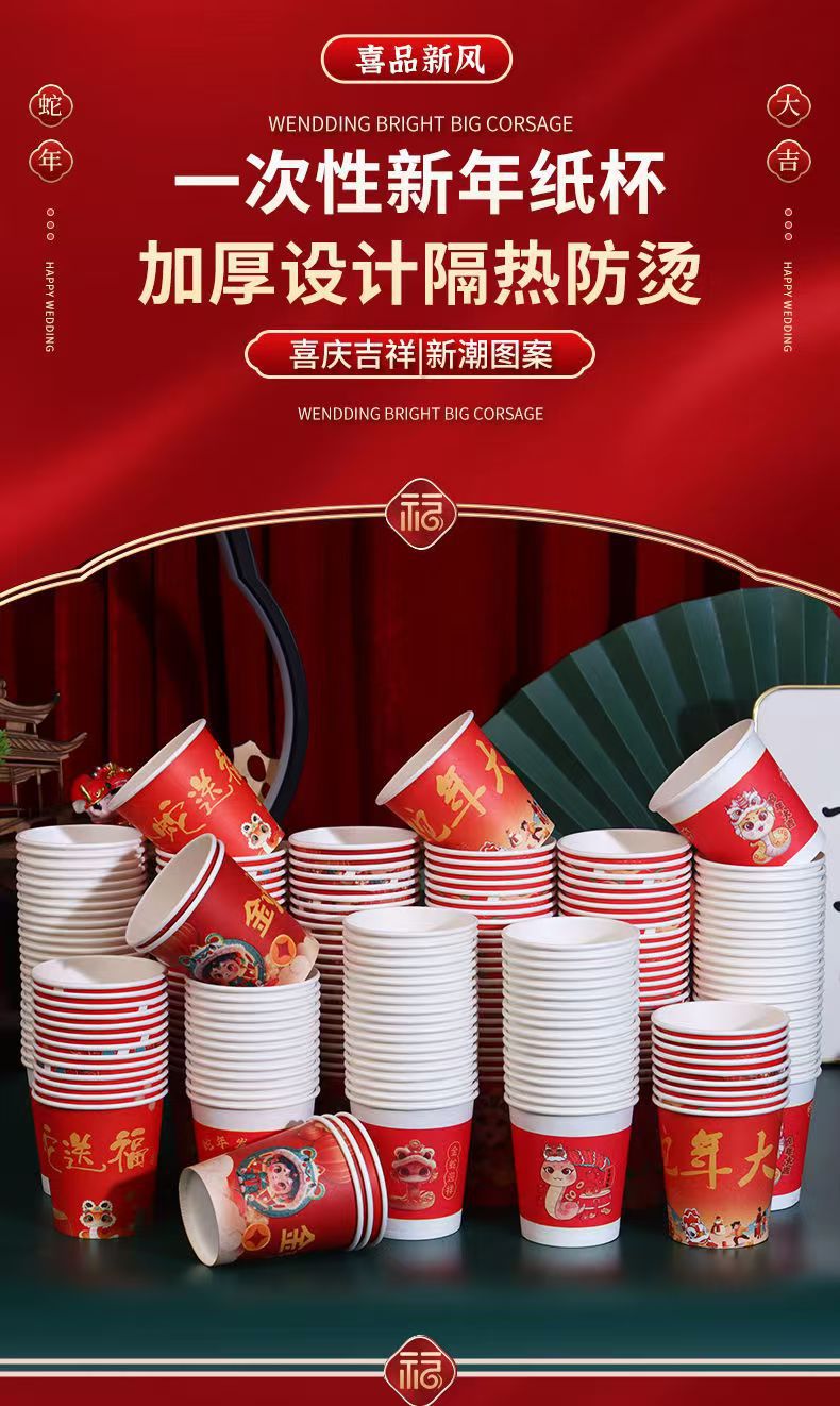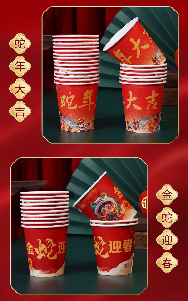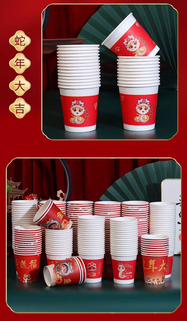 「新年纸杯!100只装」2025蛇年大吉纸杯 蛇年发财加厚纸杯 一次性喜庆纸杯居家日用餐饮用具
