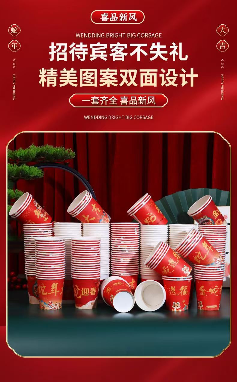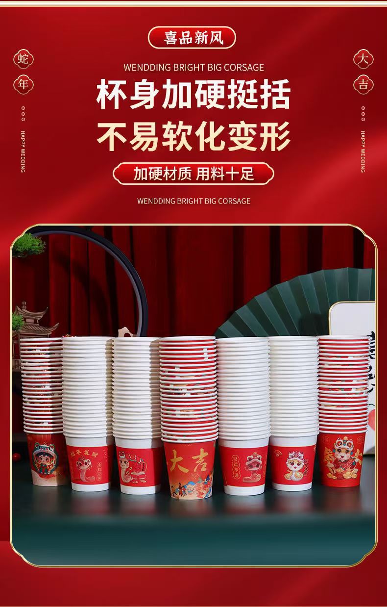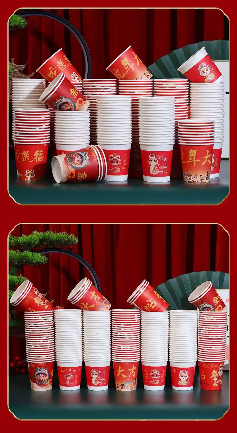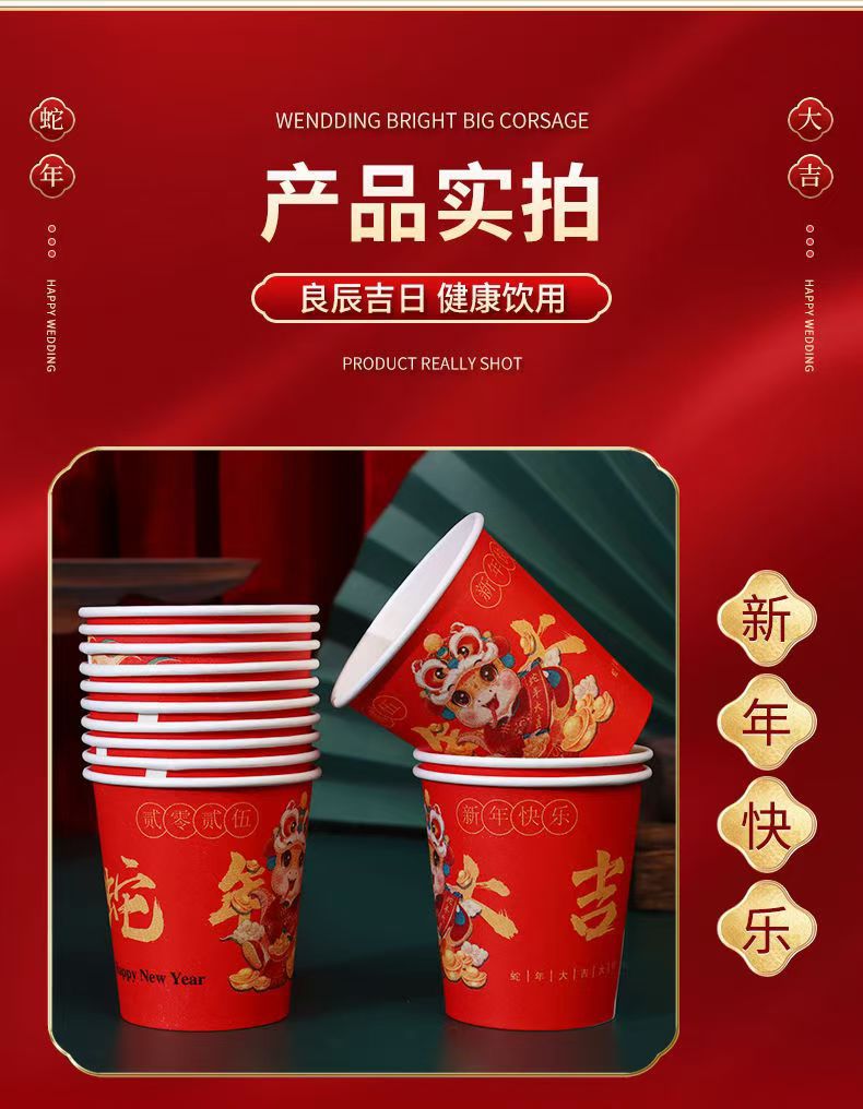 「新年纸杯!100只装」2025蛇年大吉纸杯 蛇年发财加厚纸杯 一次性喜庆纸杯居家日用餐饮用具
