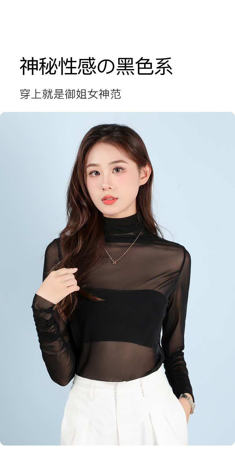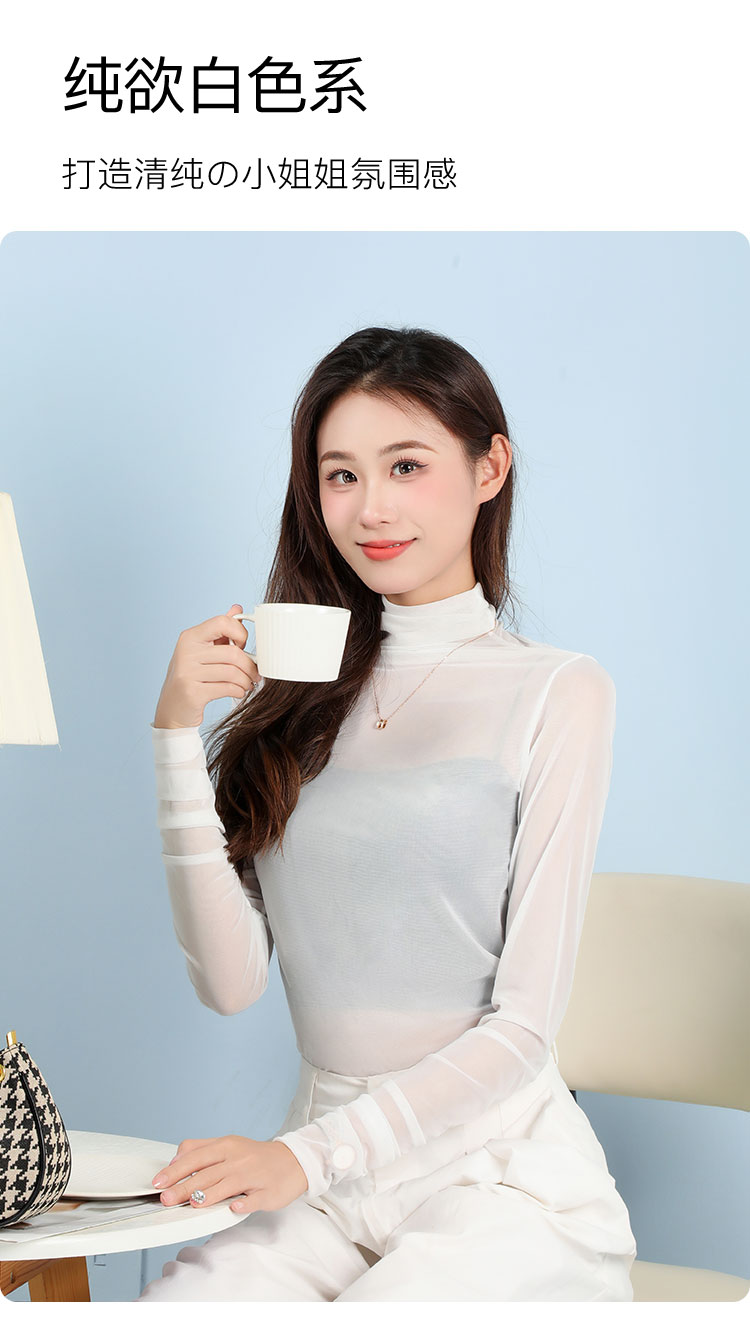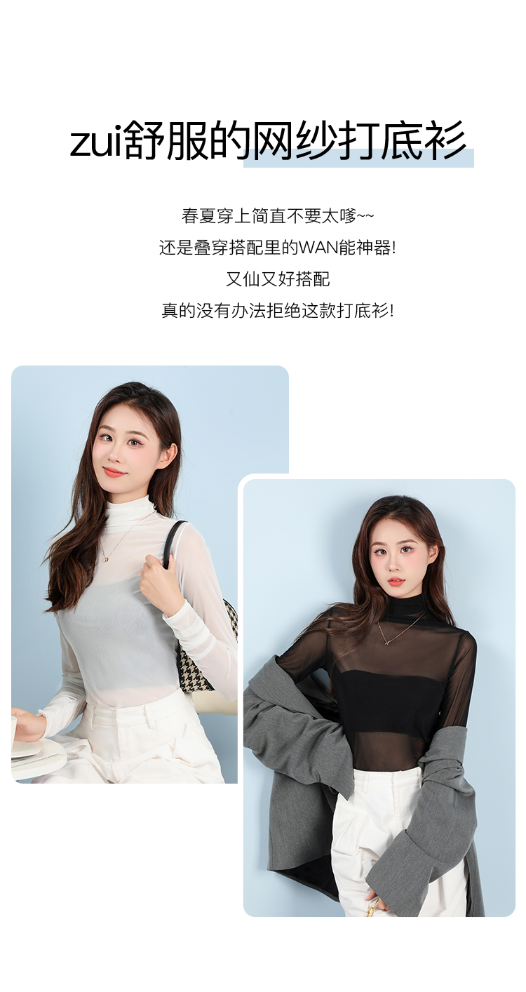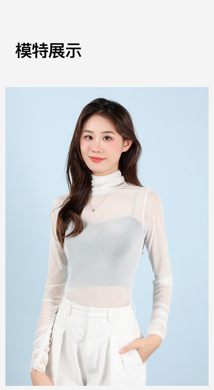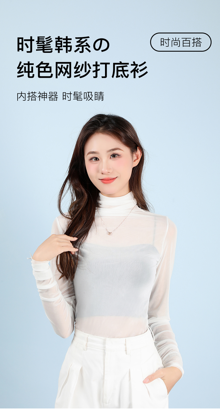 春夏薄款内搭堆堆领半透网纱打底衫时尚百搭可外穿纯色网纱打底衫