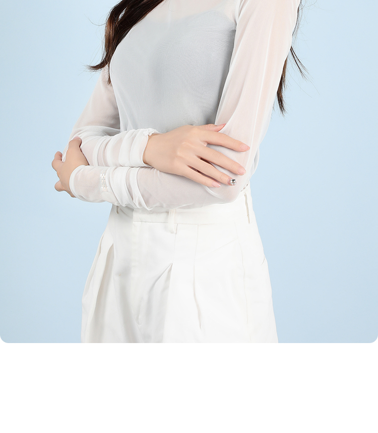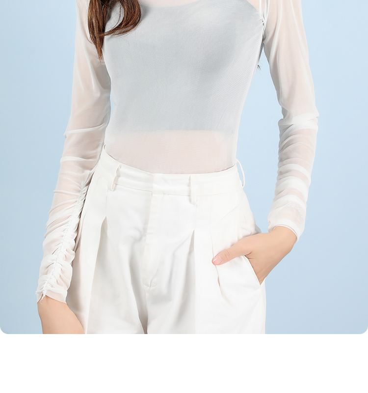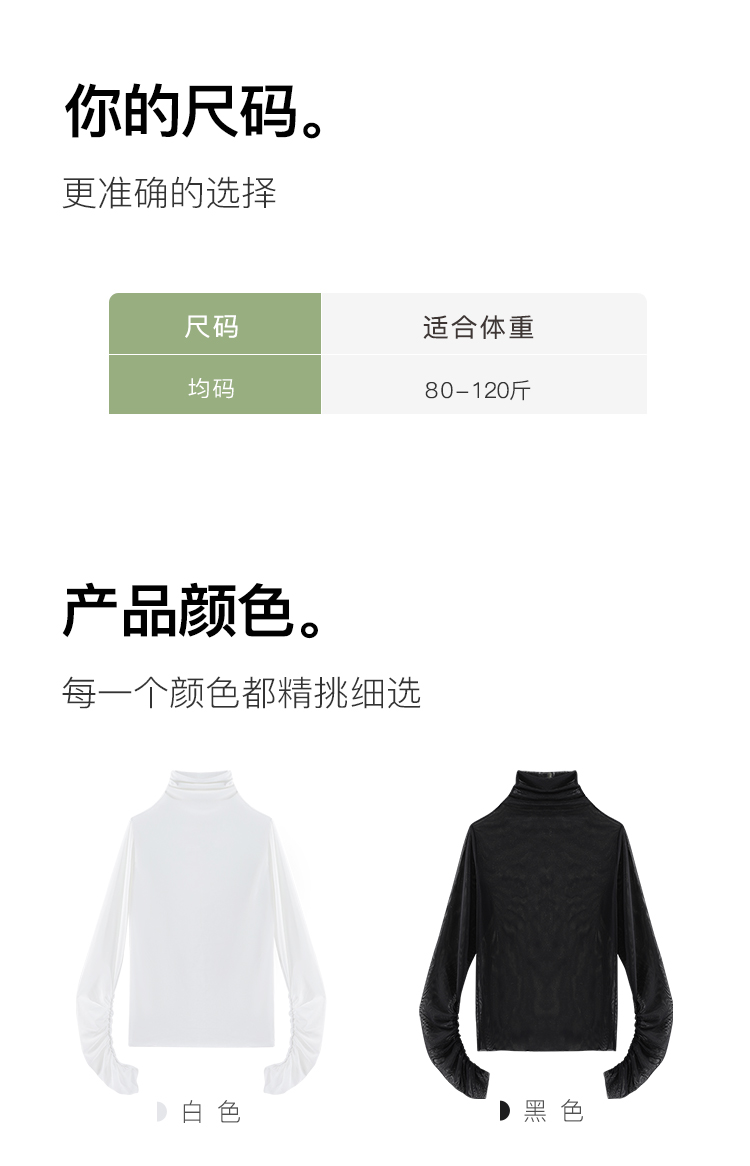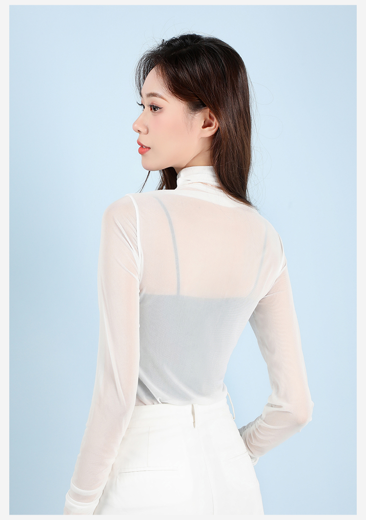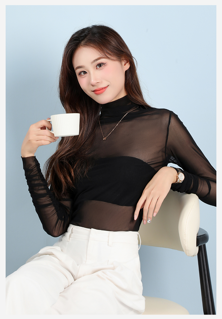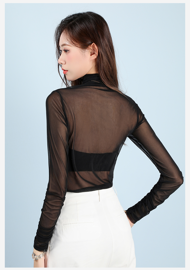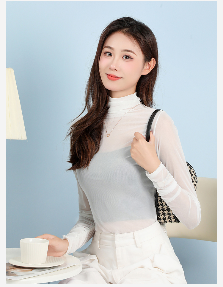 春夏薄款内搭堆堆领半透网纱打底衫时尚百搭可外穿纯色网纱打底衫