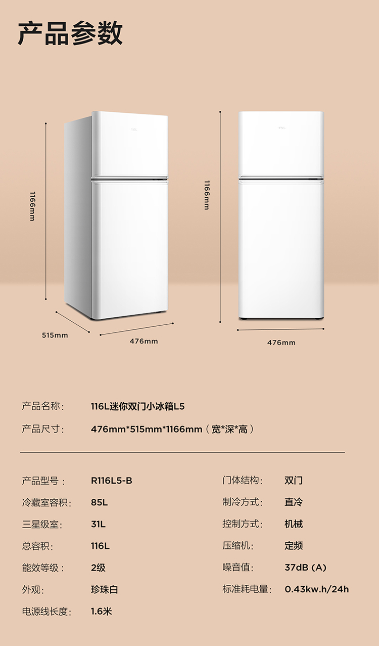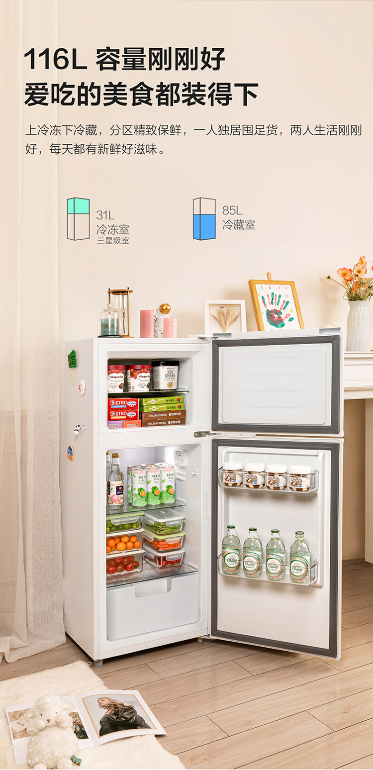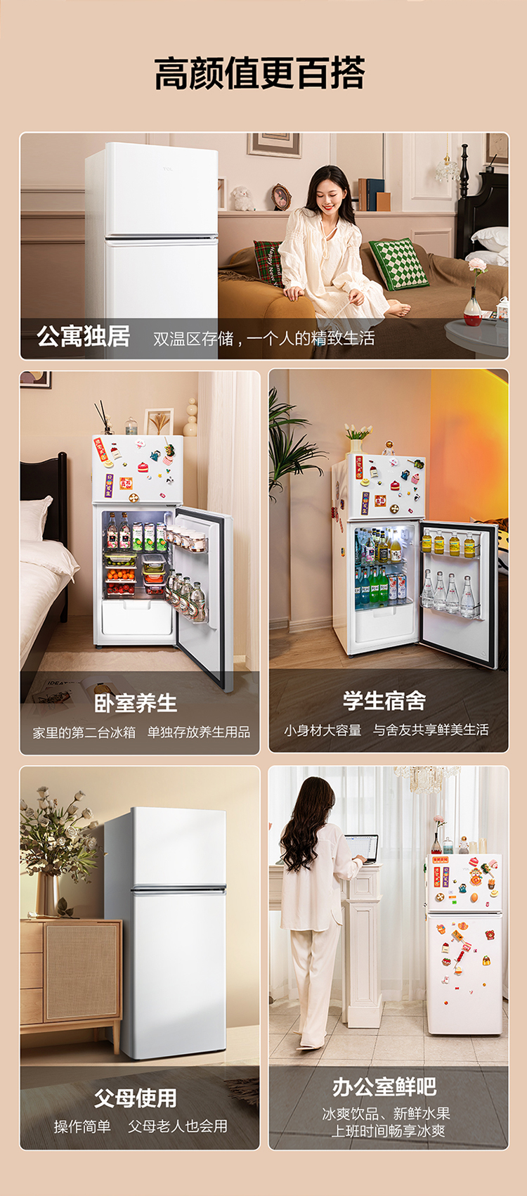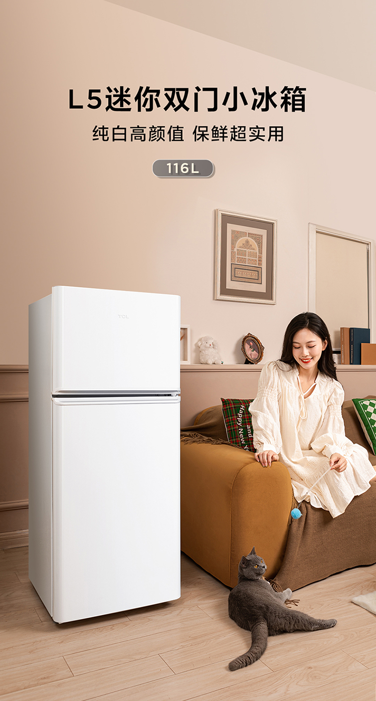 TCL 116升迷你双门白色小冰箱 二级能效 节能低音 宿舍租房 R116L5-B
