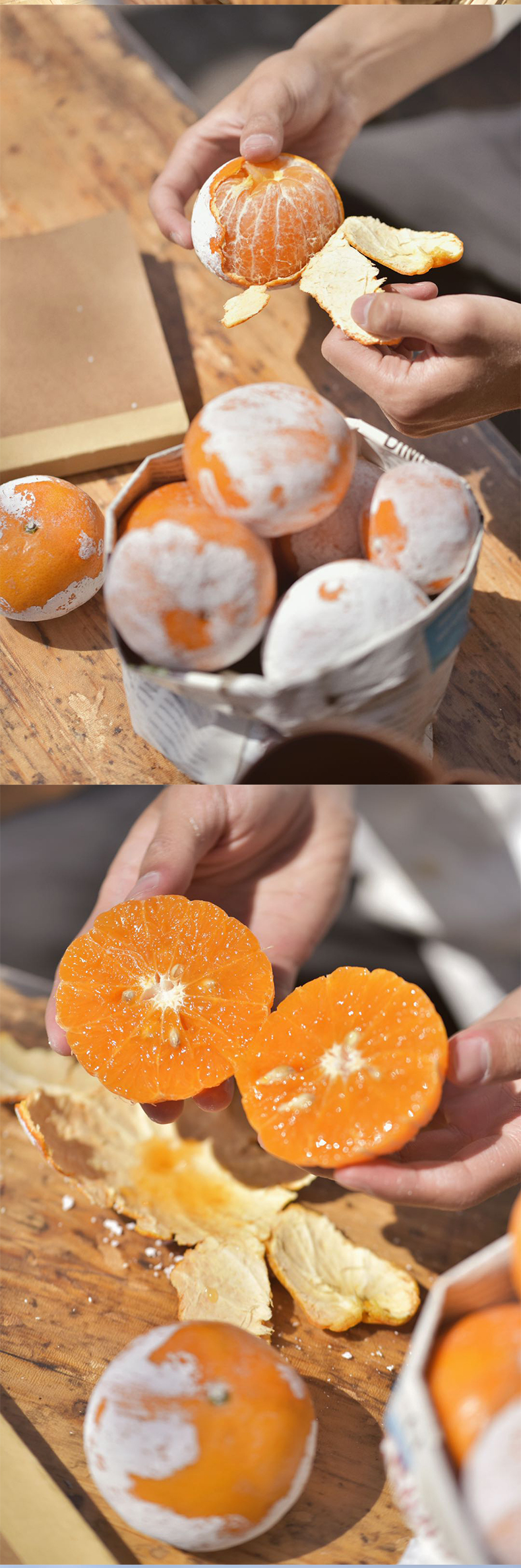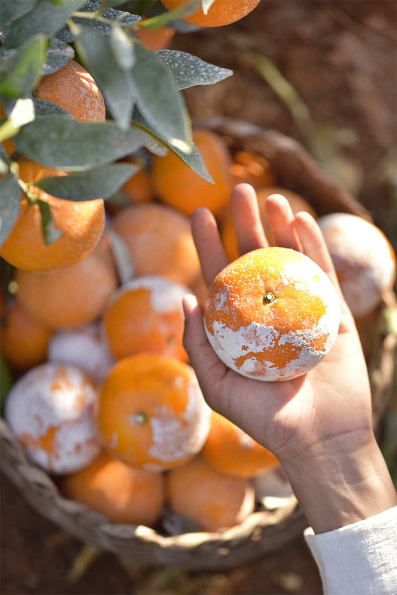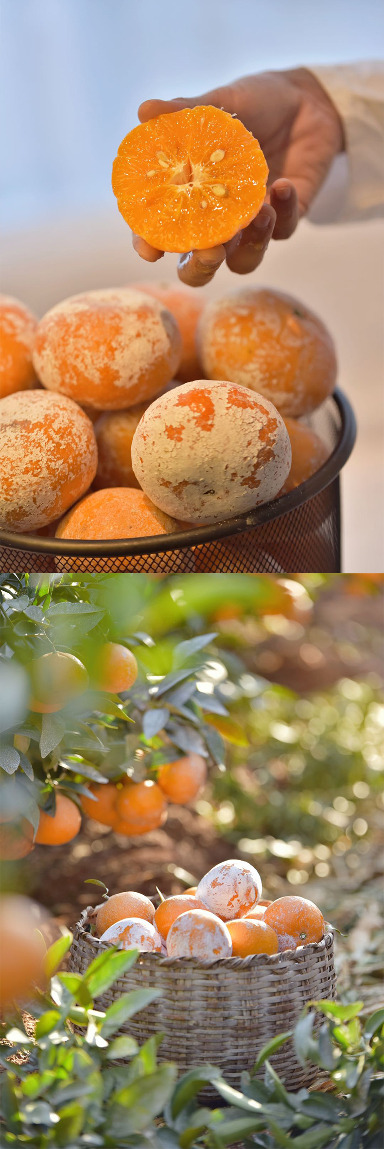 1.脏脏柑表面的白色粉末是石灰粉,在种植过程中具有物理防晒、防虫效果,脏脏柑皮薄容易晒伤,石灰粉可以保护果子,锁住水分