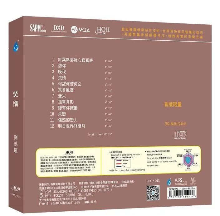 刘德丽2025新专辑《焚情》HQCDII限量版接受预订,专辑以352.8kHz/24bit格式制作,收录12首脍炙人口经典金曲,包括《红叶斜落我心寂寞时》、《想你》、《晚秋》等。更以俏皮的方式演绎草蜢乐队经典歌曲《失恋》,非常值得期待!