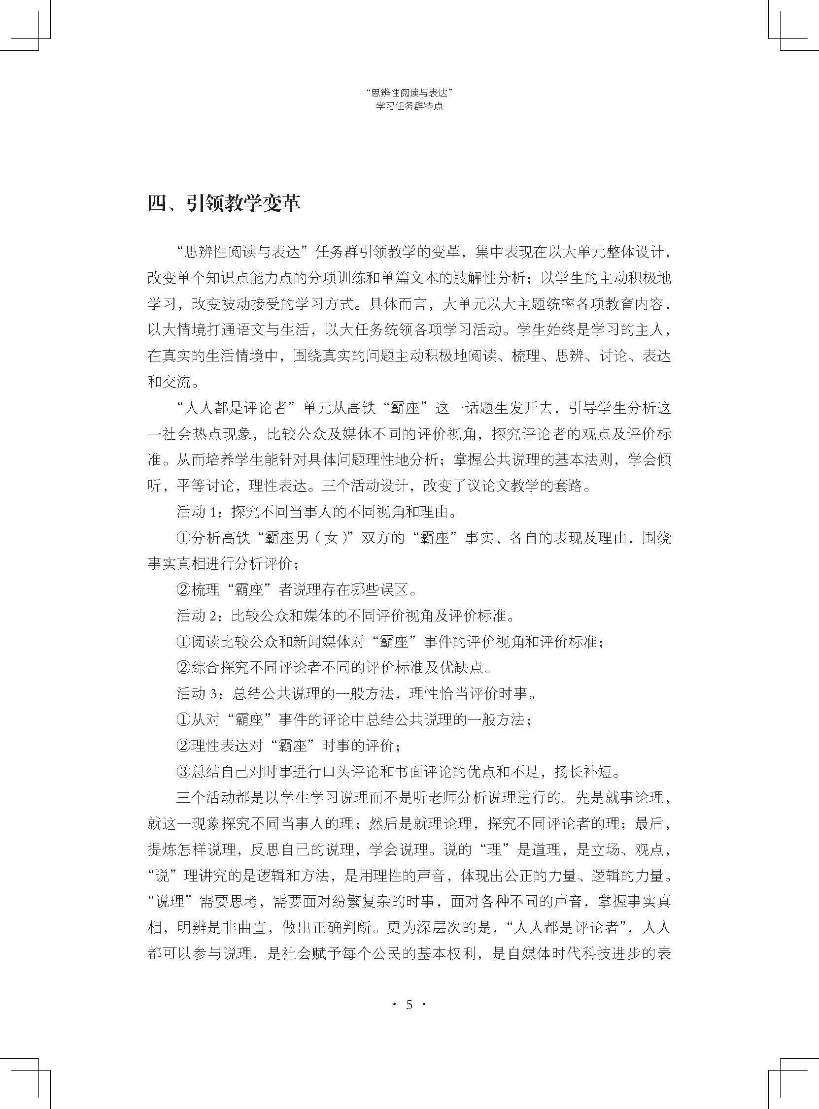 本任务群旨在引导学生学习思辨性阅读和表达,发展实证、 推理、批判与发现的能力,增强思维的逻辑性和深刻性,认清 事物的本质,辨别是非、善恶、美丑,提高理性思维水平。