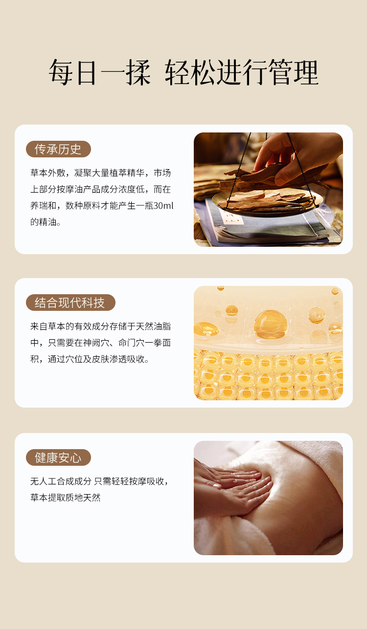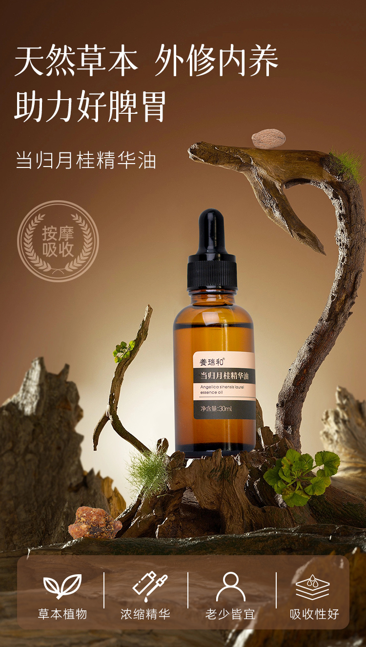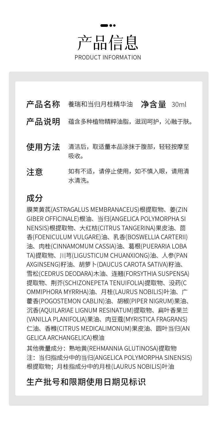 养瑞和·当归月桂精华油·30ml揉腹油中焦油·姜根油提取物·当归根提取物·茴香油·肉桂油·葛根·川芎油·人参籽油·月桂叶油·沉香提取物