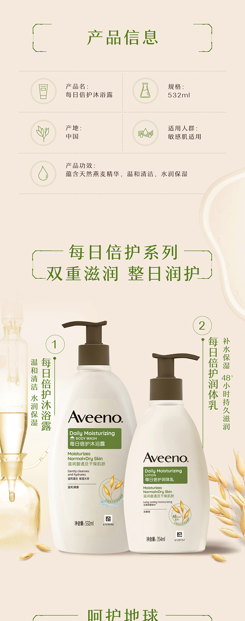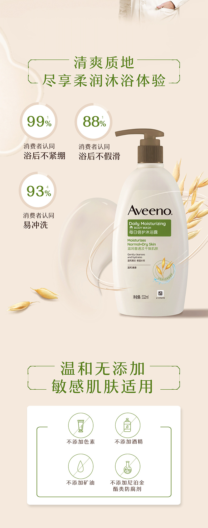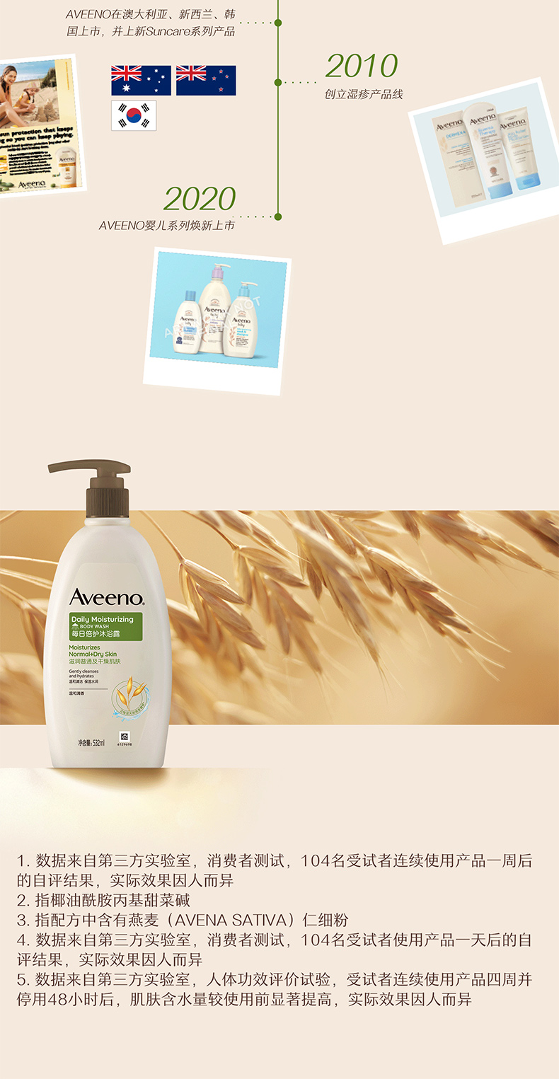 【1:1送水凝保湿霜10g】Aveeno艾惟诺成人每日倍护沐浴露532ml(温和清香)长效保湿天然燕麦
