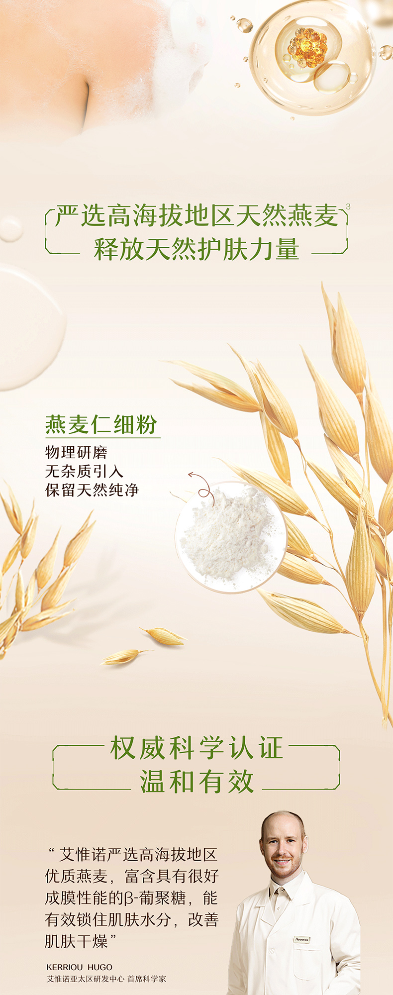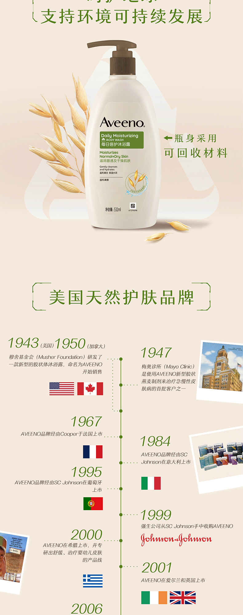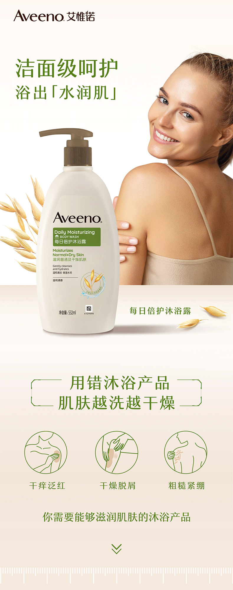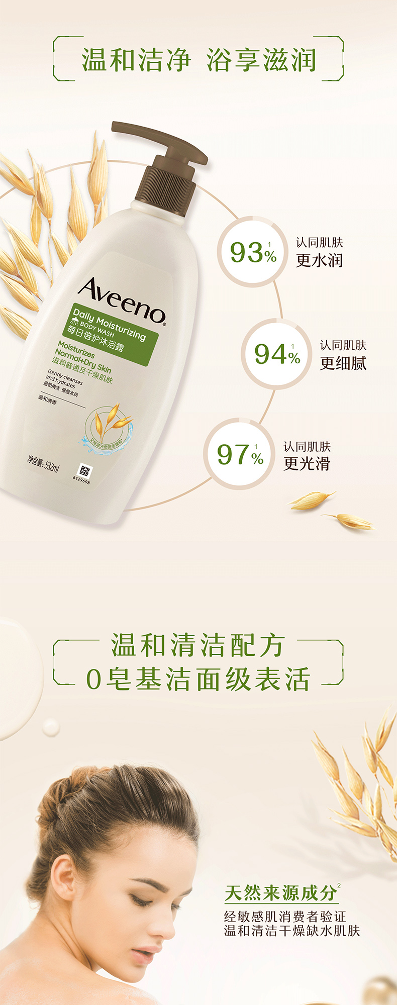 【1:1送水凝保湿霜10g】Aveeno艾惟诺成人每日倍护沐浴露532ml(温和清香)长效保湿天然燕麦