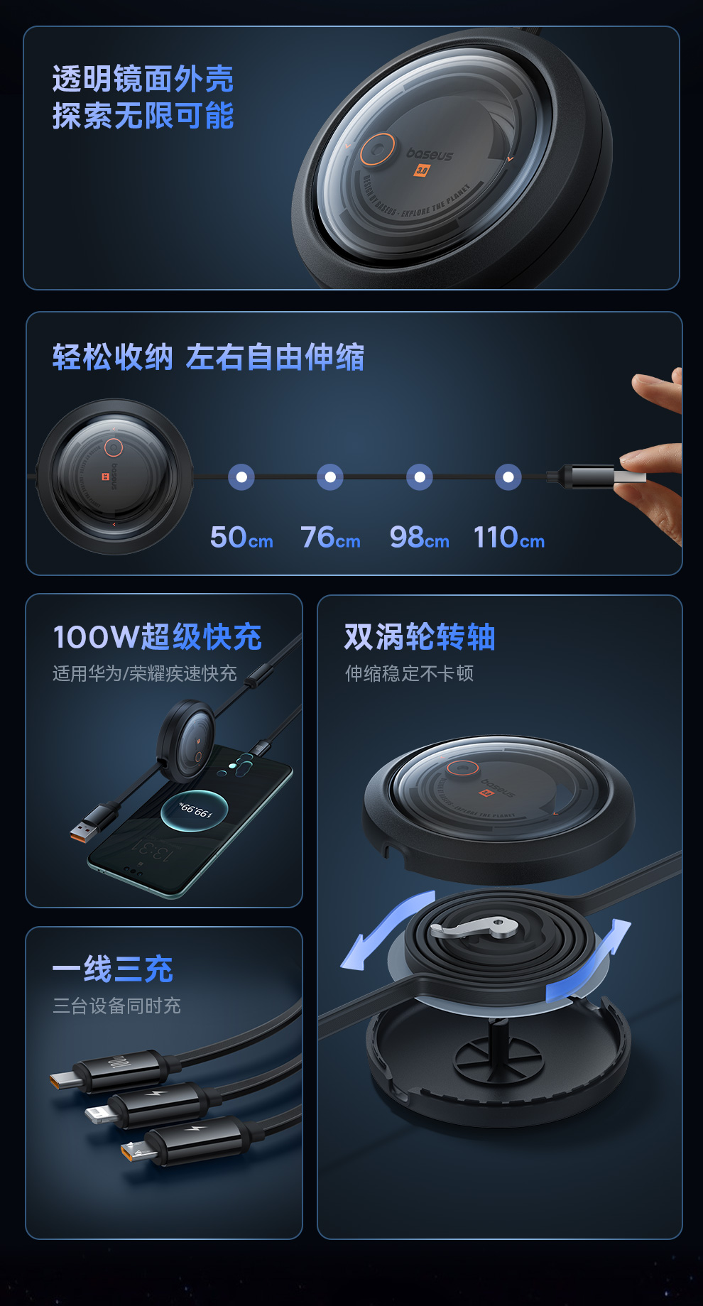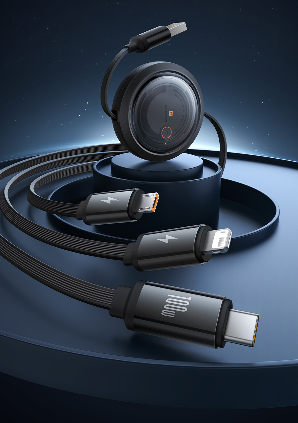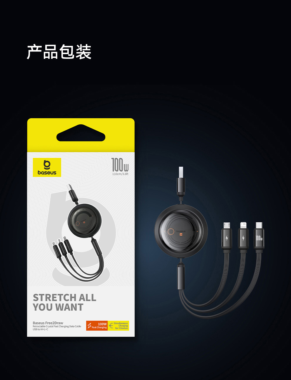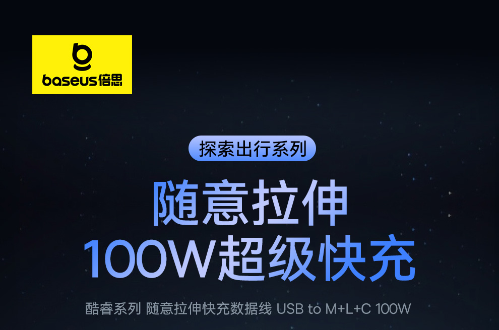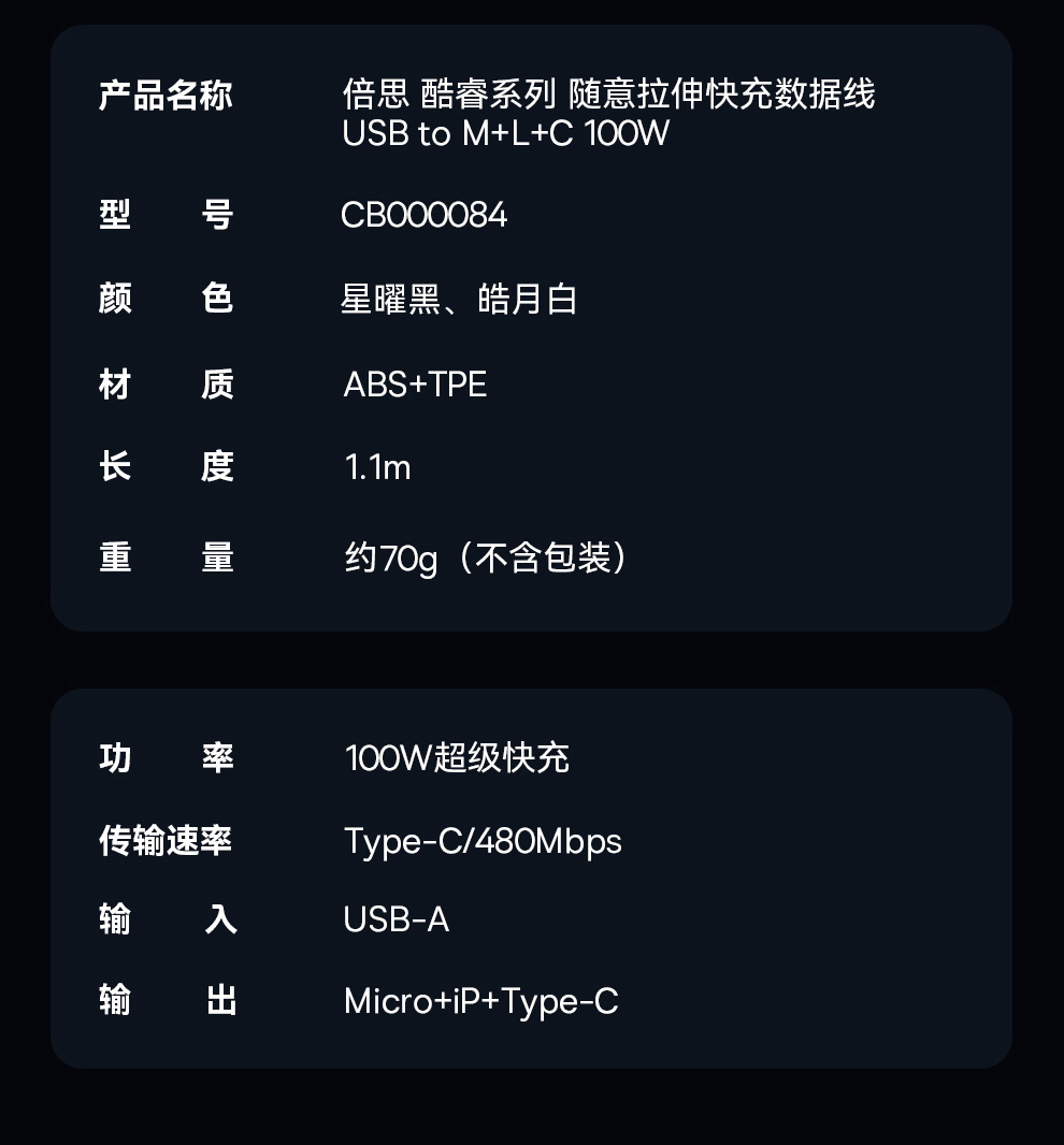倍思 酷睿系列 随意拉伸快充数据线 USB to M+L+C 100W 1.1m
