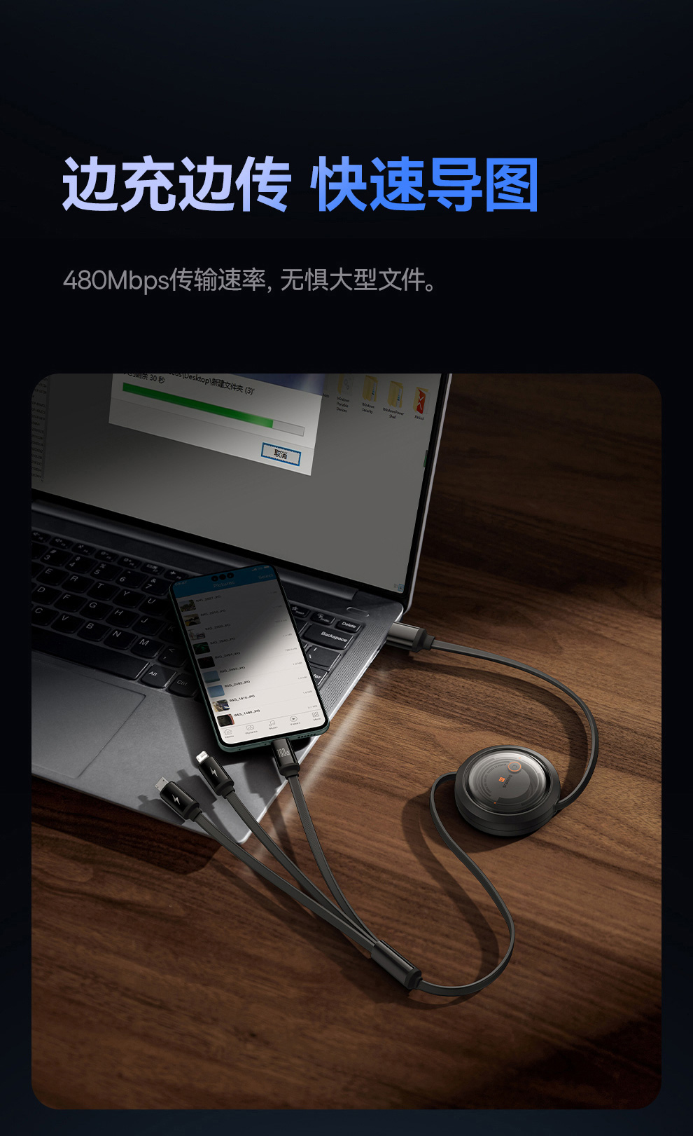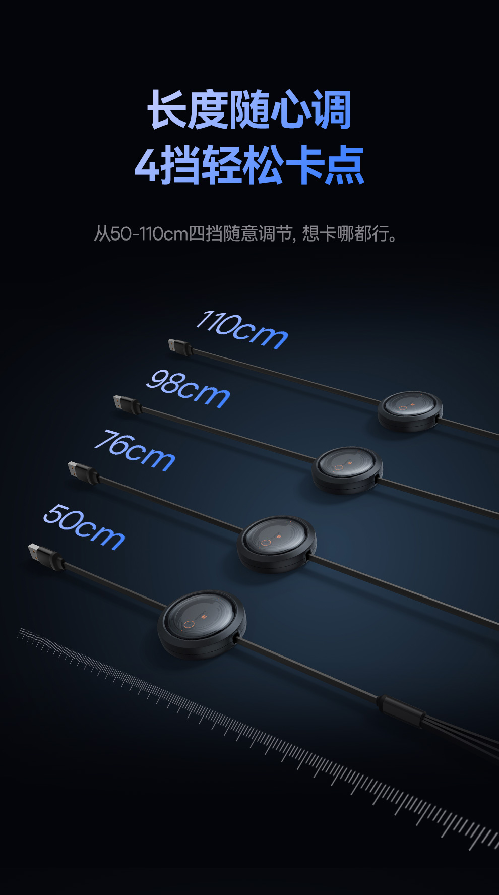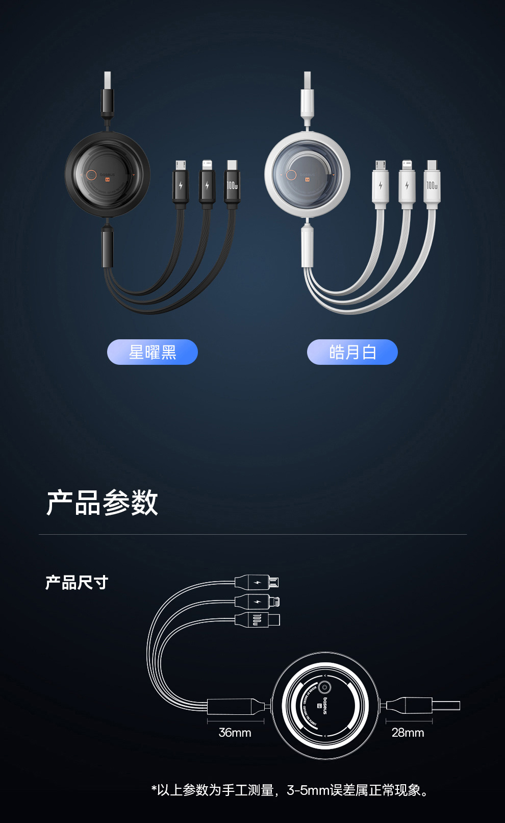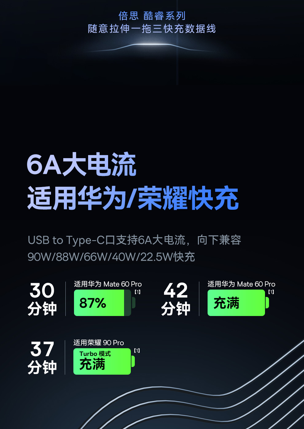 倍思 酷睿系列 随意拉伸快充数据线 USB to M+L+C 100W 1.1m