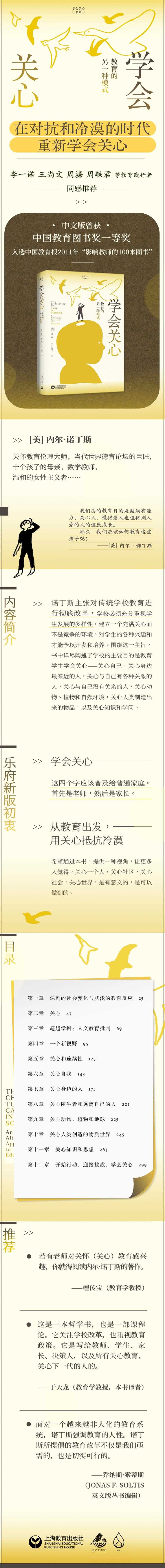 诺丁斯的《学会关心》在过去的十几年里,已经作为教育学术图书重版过几次,为什么此次要重新打造呢?本书的策划者说:;我的企图心在于,让家长读一读这本书。首先是老师,然后是家长。;学会关心这四个字应该普及给普通家庭。无论;关心理论在当下的中国教育能否落地,我们希望它能让从事教育的人教师和家长多一个视角看待教育。
