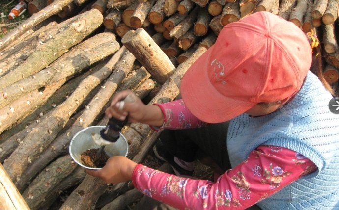 晾晒过两三个月过后,就要开始给段木打眼接种了!