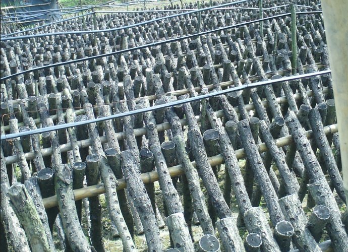 立架后的段木,顶上的是喷水设备!