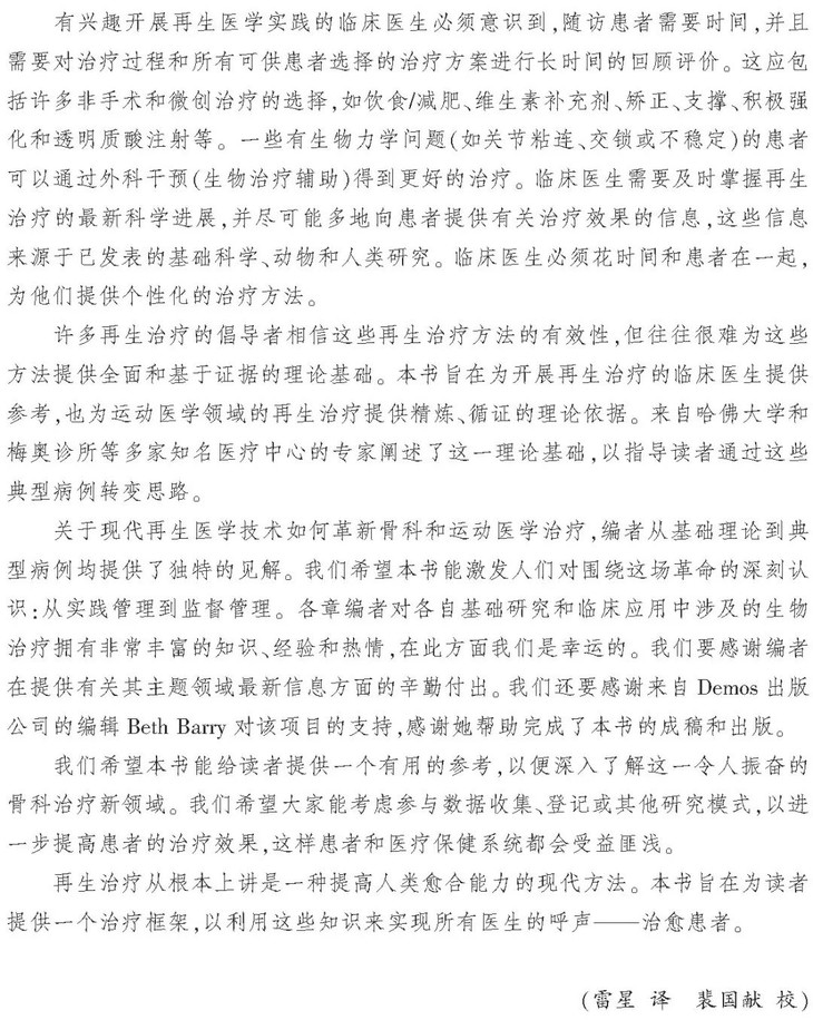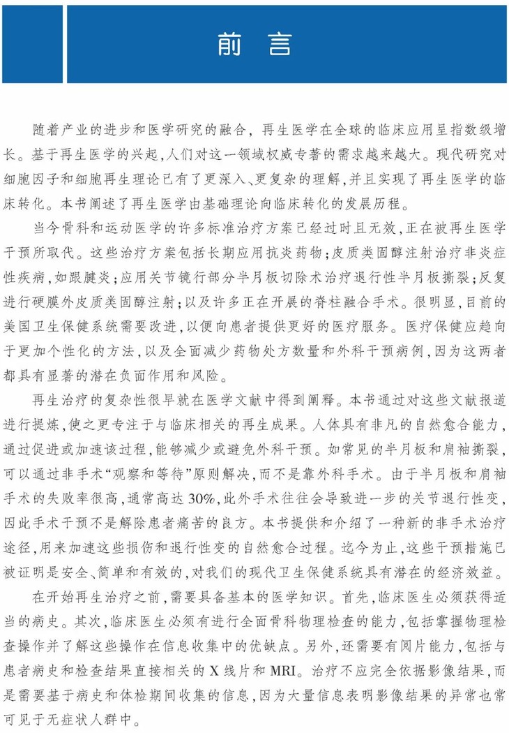 《骨科与运动损伤再生治疗》是第一部关于骨科再生治疗的综合性书籍。本书编者为骨科和运动损伤再生治疗方面的权威专家,本书内容包含了编者多年的临床经验和先进技术总结,可以帮助读者在临床实践中理解并快速掌握再生医学的相关知识。本书主要内容包括再生治疗基础知识、监管问题、人员和设备、患者营养与康复、以及针对特定临床问题的骨科生物学治疗方法,尤其是针对运动员或其他患有肌肉骨骼系统疾病的患者,以帮助其恢复功能。