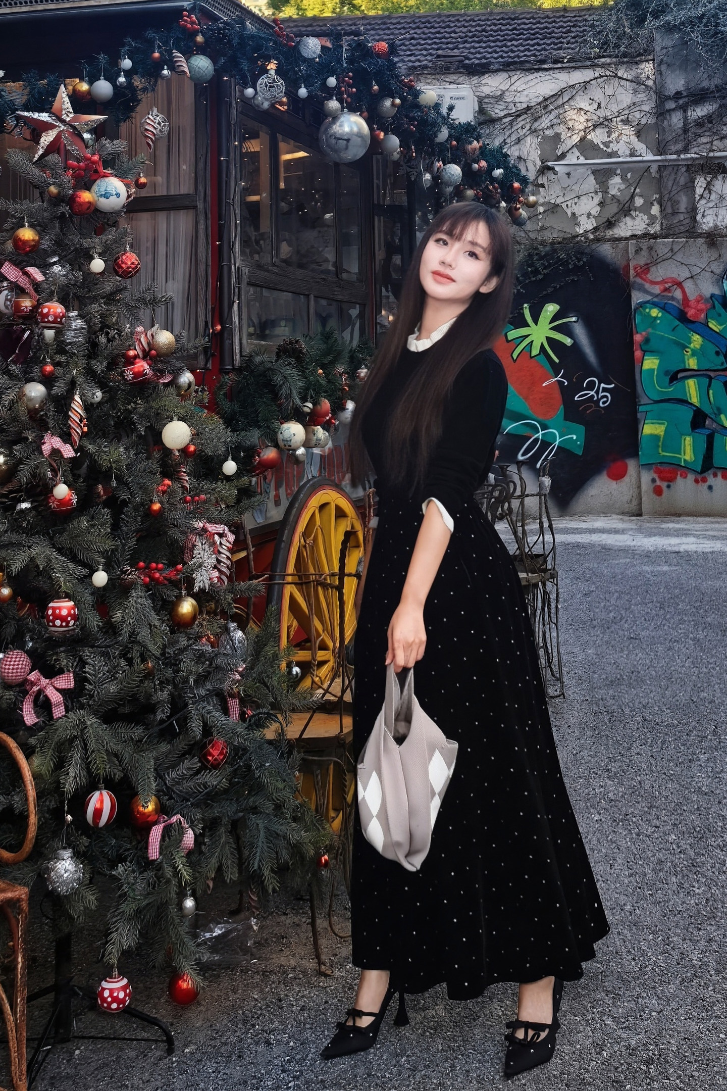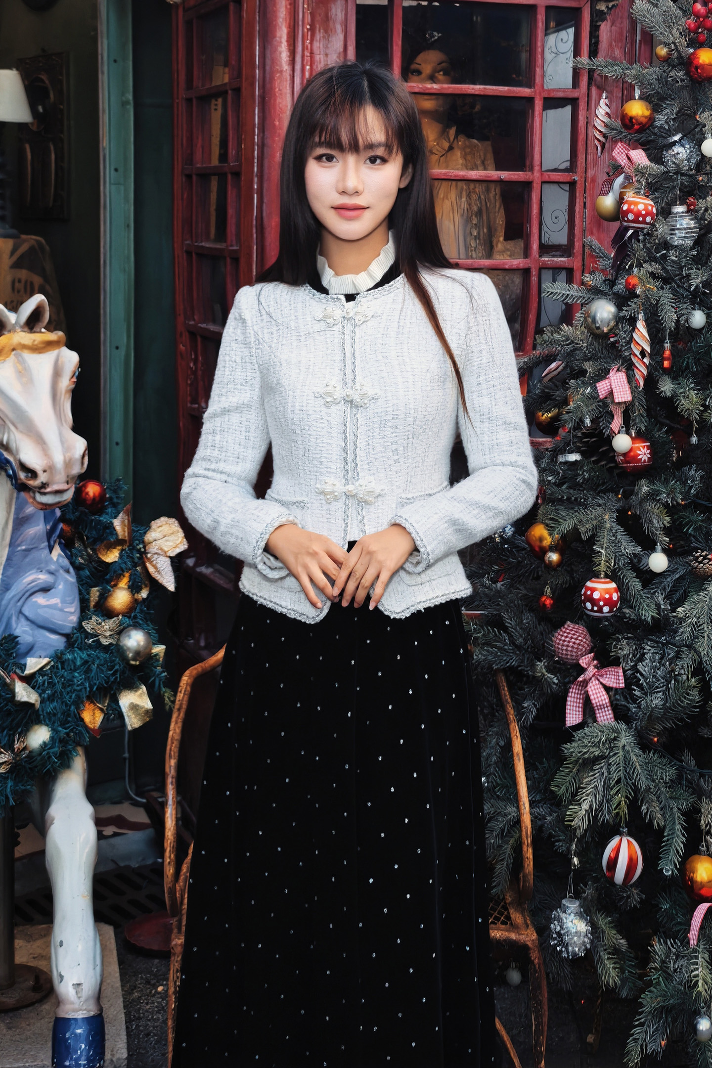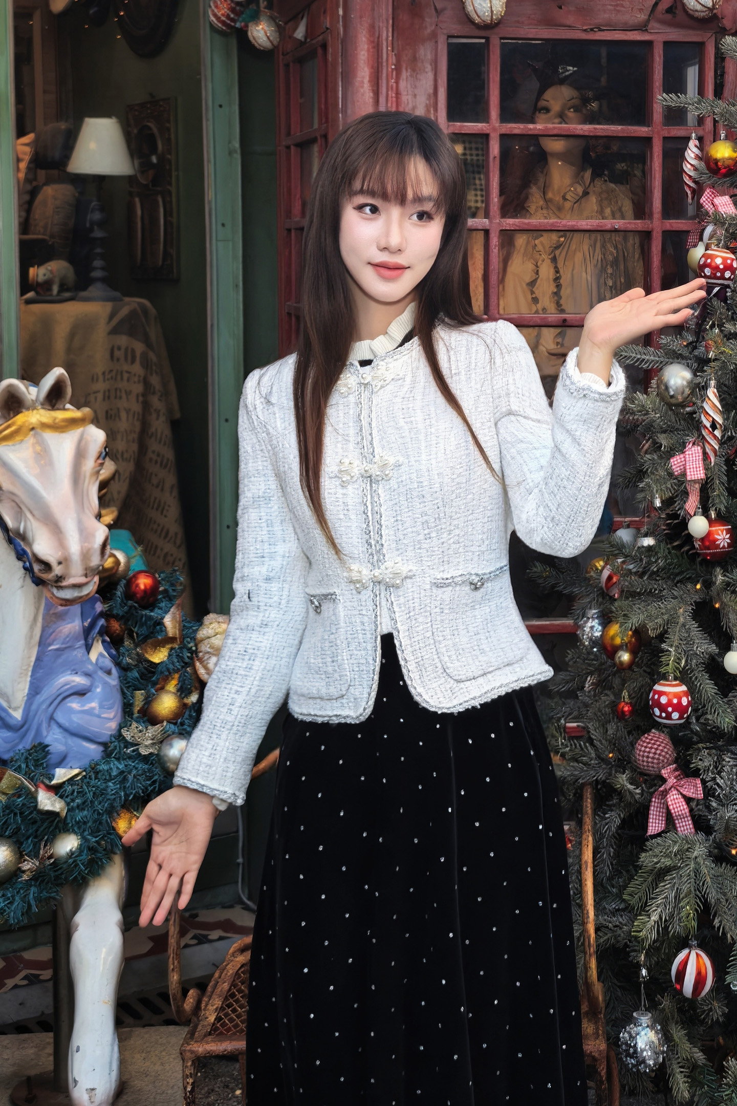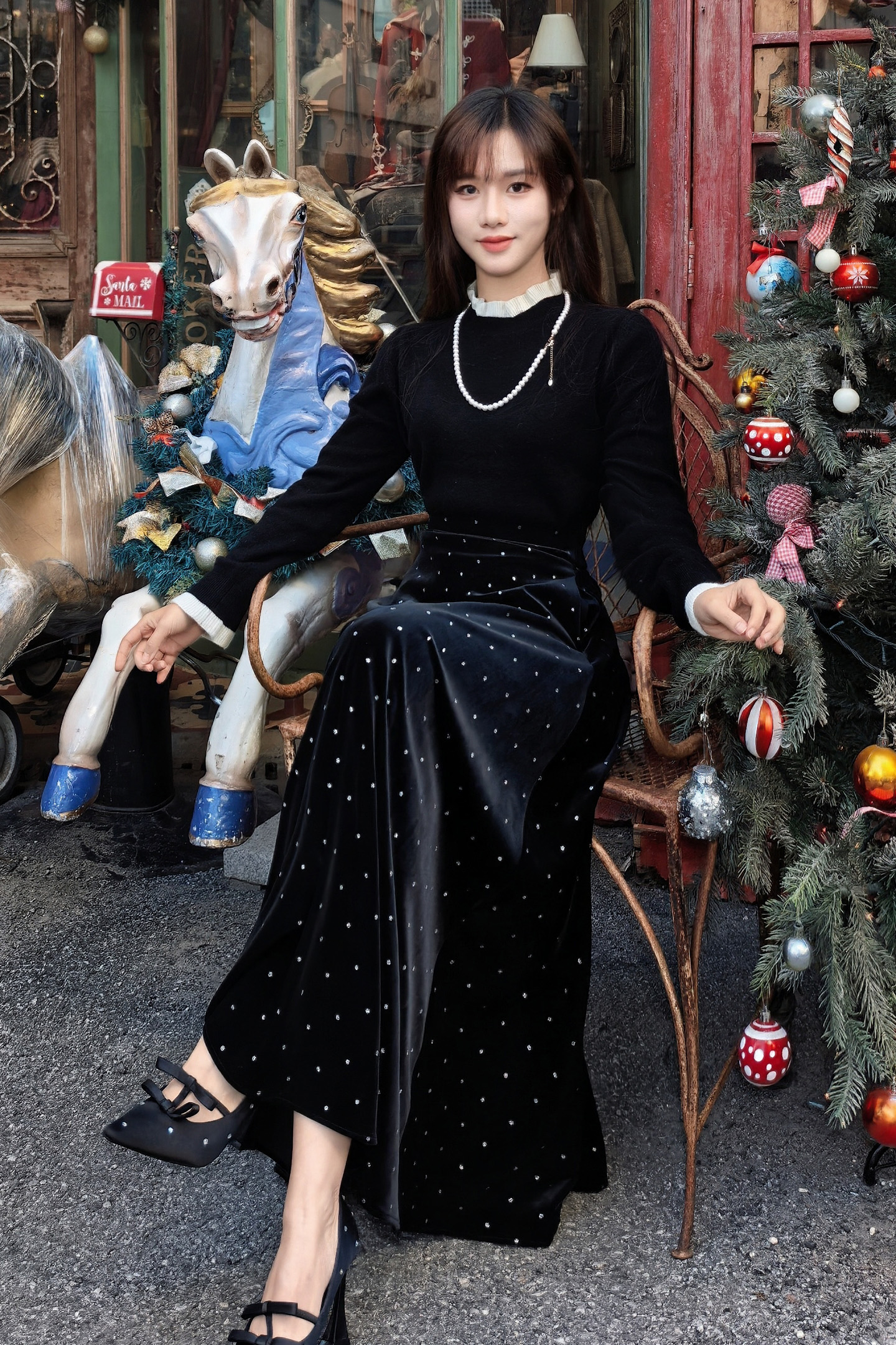 🎄沉稳的黑白配色,巧妙平衡圣诞节那种"红绿金"的喧闹,静坐于铃铛木马与圣诞树之间,搭配一条丝绒半裙,复古氛围拉满~~