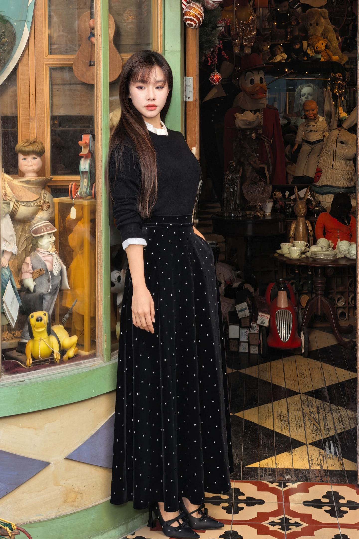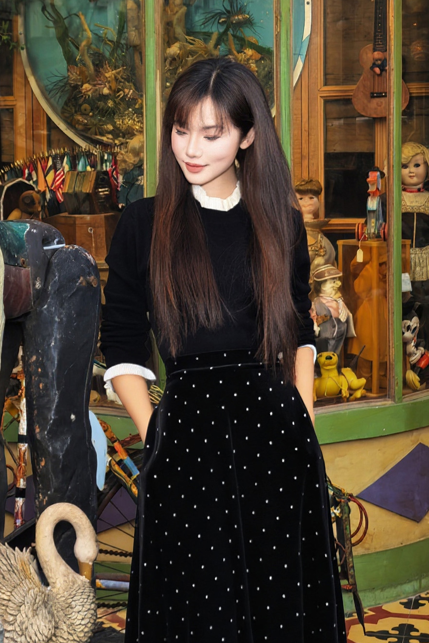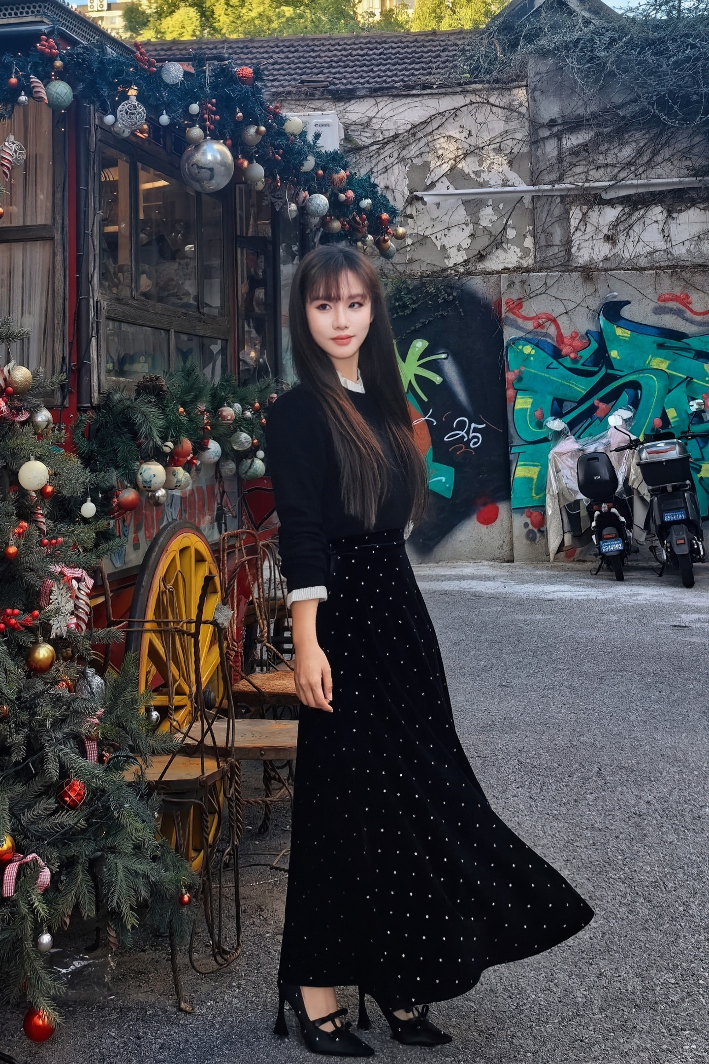 🎄沉稳的黑白配色,巧妙平衡圣诞节那种"红绿金"的喧闹,静坐于铃铛木马与圣诞树之间,搭配一条丝绒半裙,复古氛围拉满~~