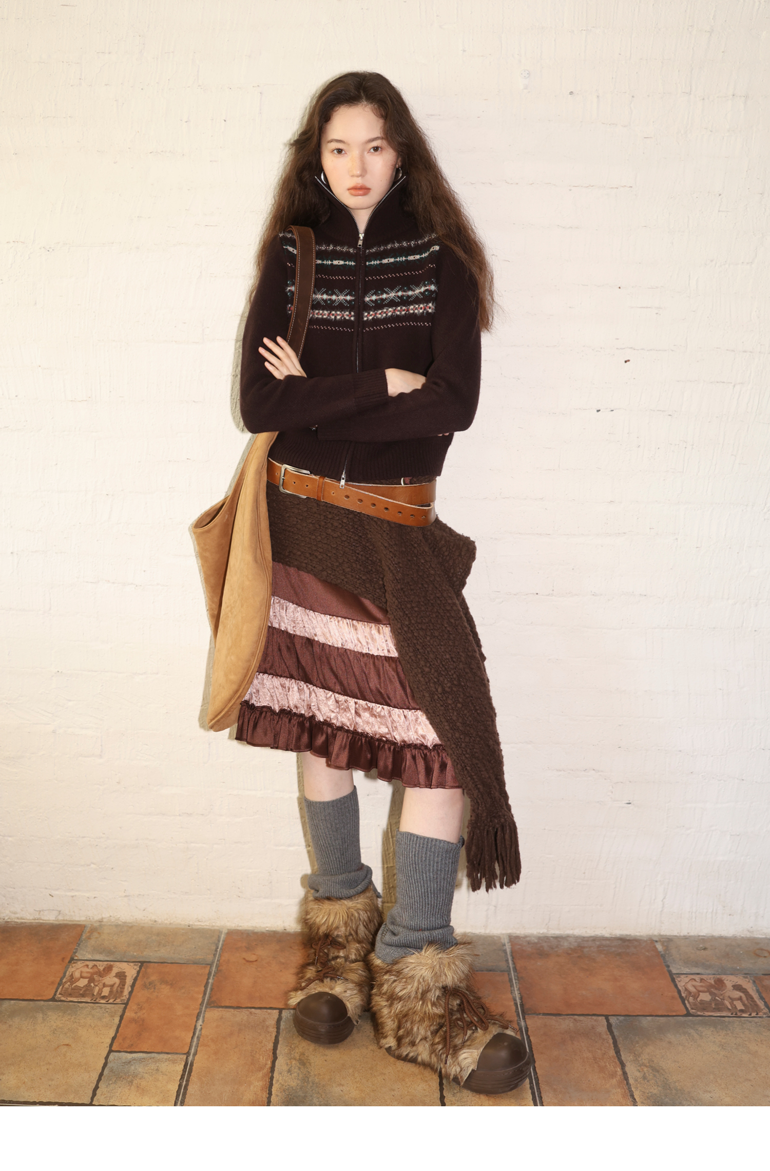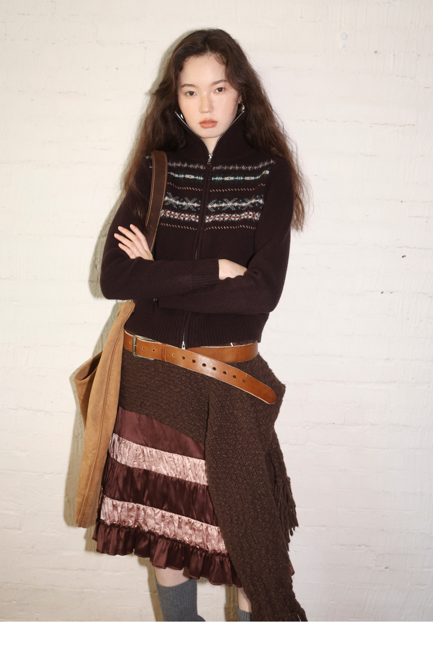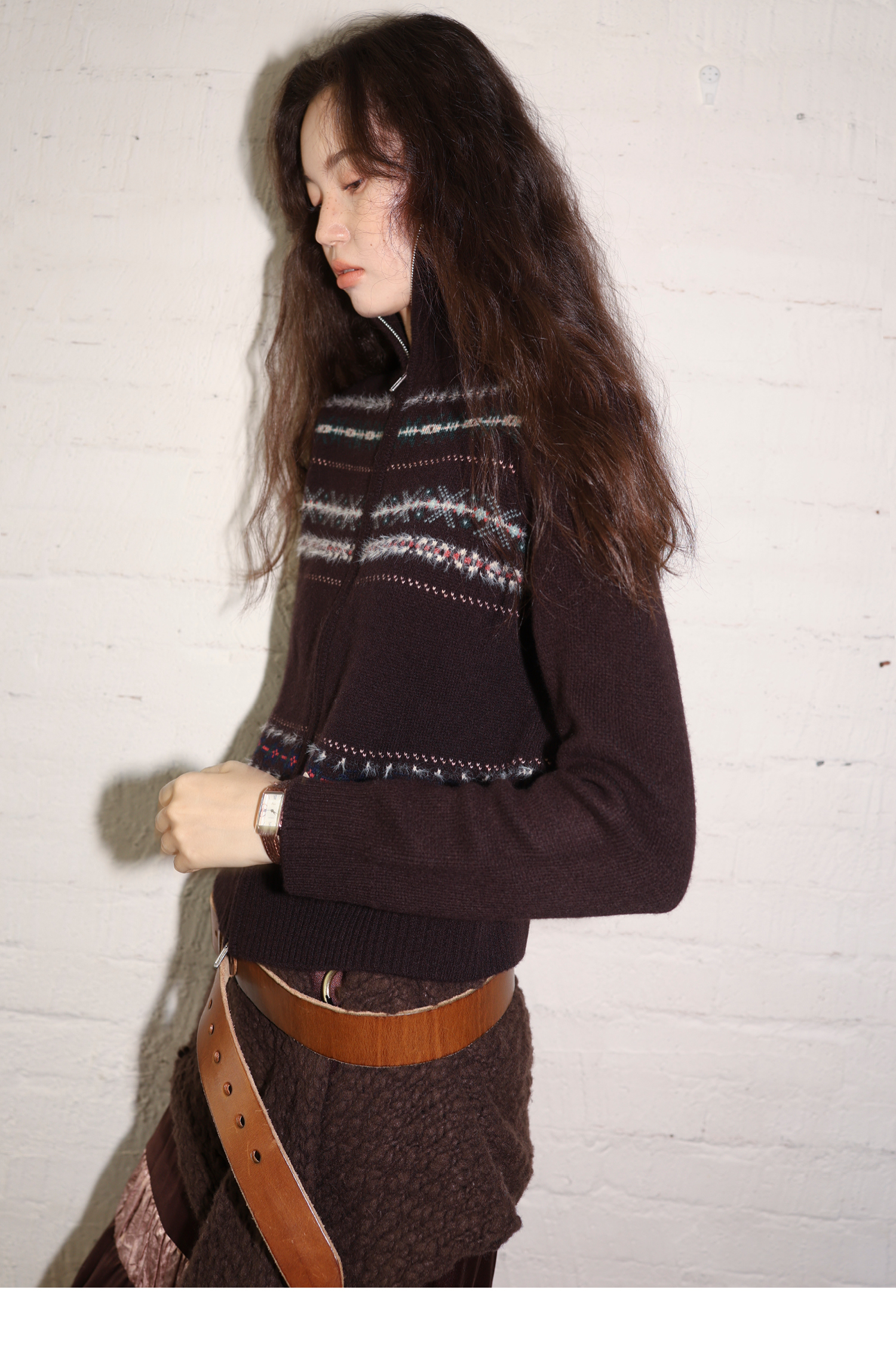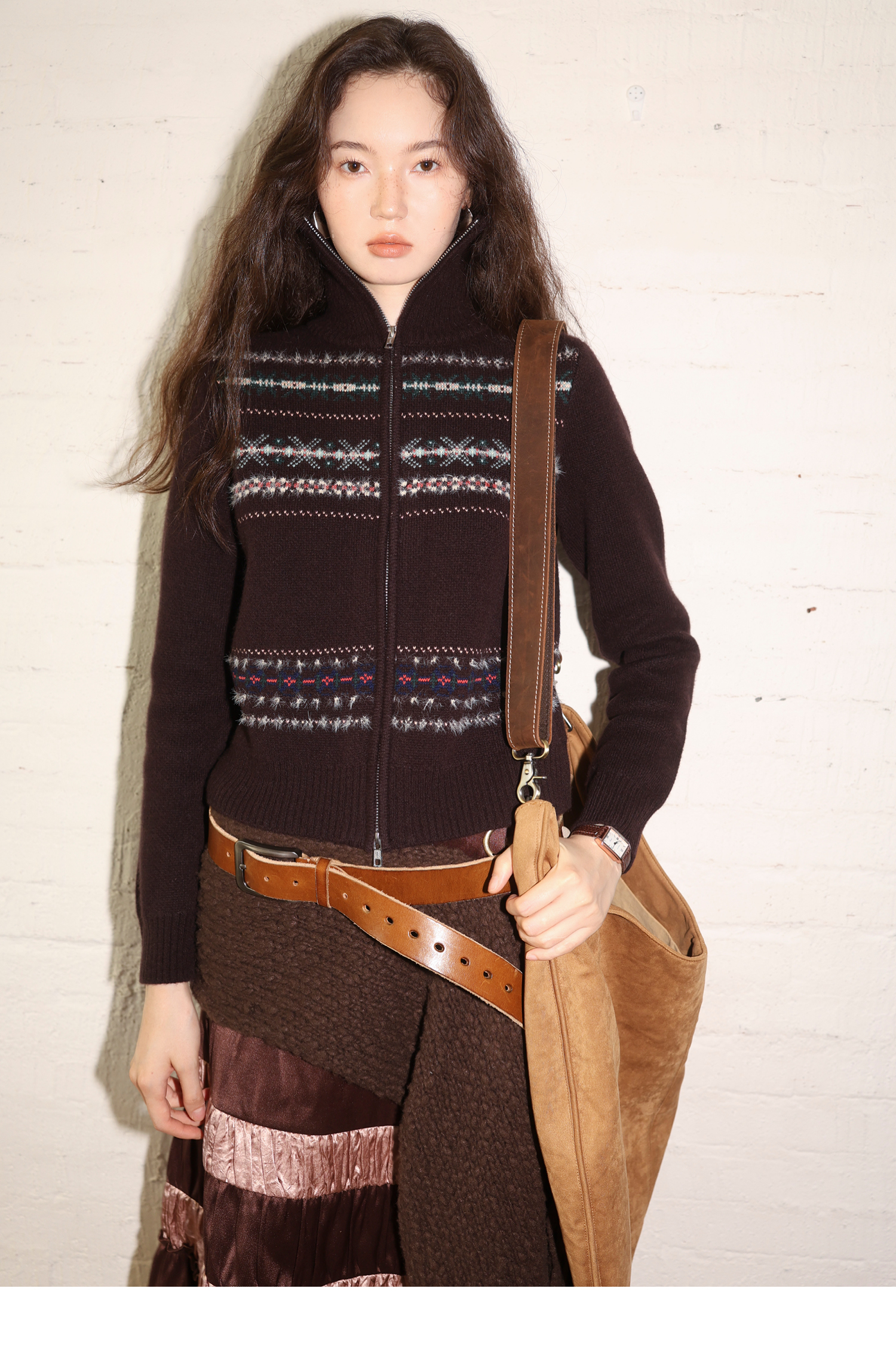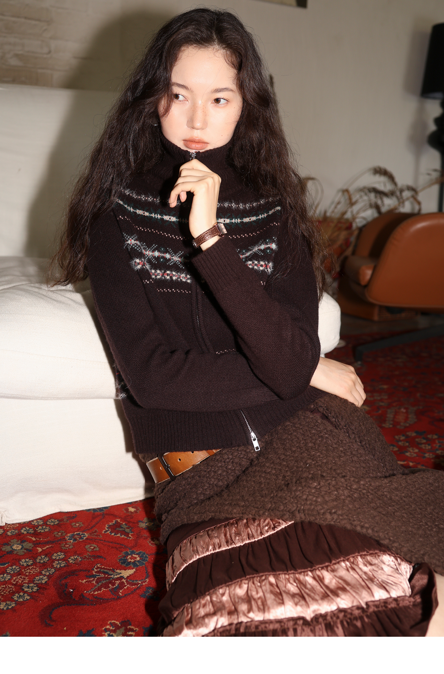 素舶 澳洲美利奴羊毛光泽细腻雪花费尔岛高领拉链短款针织开衫
