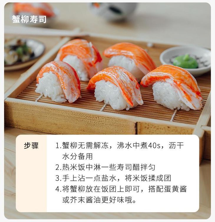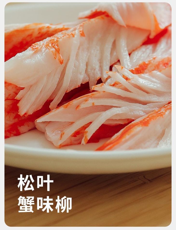 松叶蟹柳包装很简单,食用方法却很多样!无需解冻,直接开水烫个40秒,配上醋饭就是高级日料店的蟹柳寿司;加个鸡蛋和面面就是中式暖胃快手餐;各种蔬菜切切拌拌再撒点蒜盐就是西式蟹柳沙拉;蛋液里煎煎就成了蟹柳滑蛋;甚至直接空气炸锅180度烤个5分钟就是蟹柳小零嘴了。。。一包蟹柳,一周都能整出不重样的!而且蟹柳本身就是调过味的,完全不腥,只要它熟了就能吃,鳕鱼的鲜甜口感洽到好处,极美味,做早餐中餐晚餐加餐都是100分!