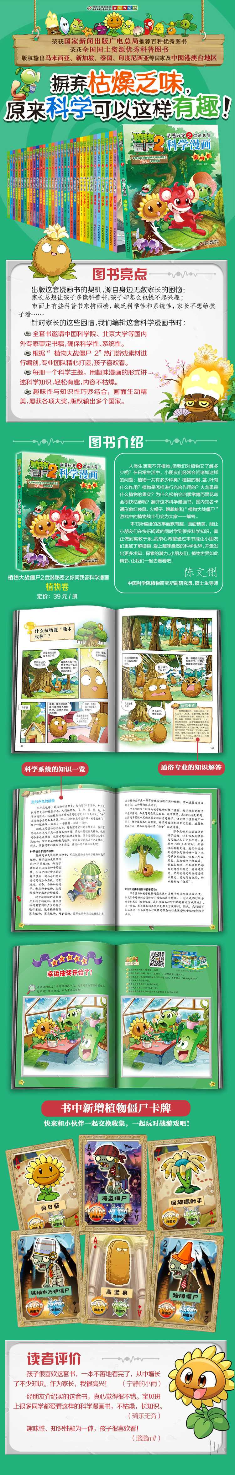 这本科学漫画书,采用了可爱的卡通形象红袋鼠、火帽子、跳跳蛙和“植物大战僵尸”游戏中的坚果、向日葵、菜问、豌豆射手等为人熟知和喜爱的角色,在一个个爆笑的故事中,将植物世界的神奇和奥秘一一揭晓。希望通过这本书,小朋友们能对植物有更多的了解并由此爱上趣味盎然的植物世界,激发出热爱科学、积极探索的精神。
