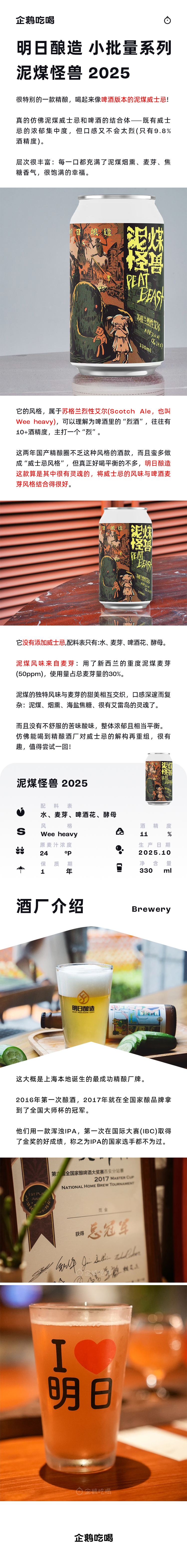 【积分兑换】上海 明日酿造 小批量系列 泥煤怪兽2025 苏格兰烈性艾尔 精酿啤酒 烟熏泥煤香气 酒体饱满