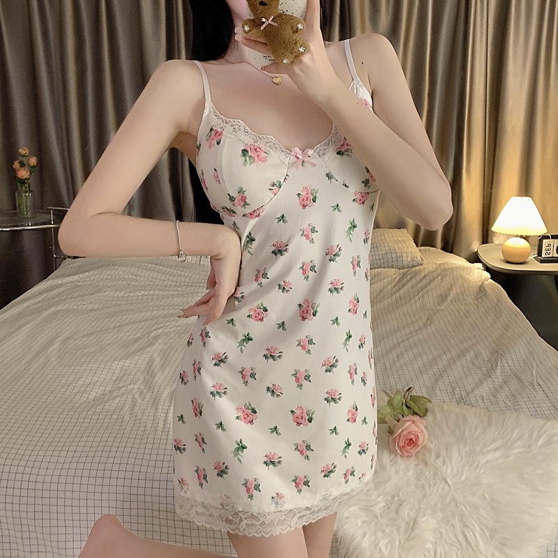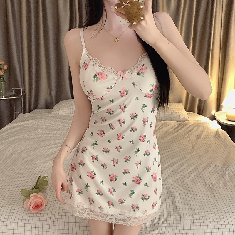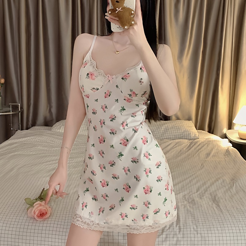【纯欲风❗性感碎花修身短裙】面料柔软,紧身不紧绷,缝胸垫口,新款吊带睡裙碎花短裙修身仿棉蕾丝家居服睡衣QQ