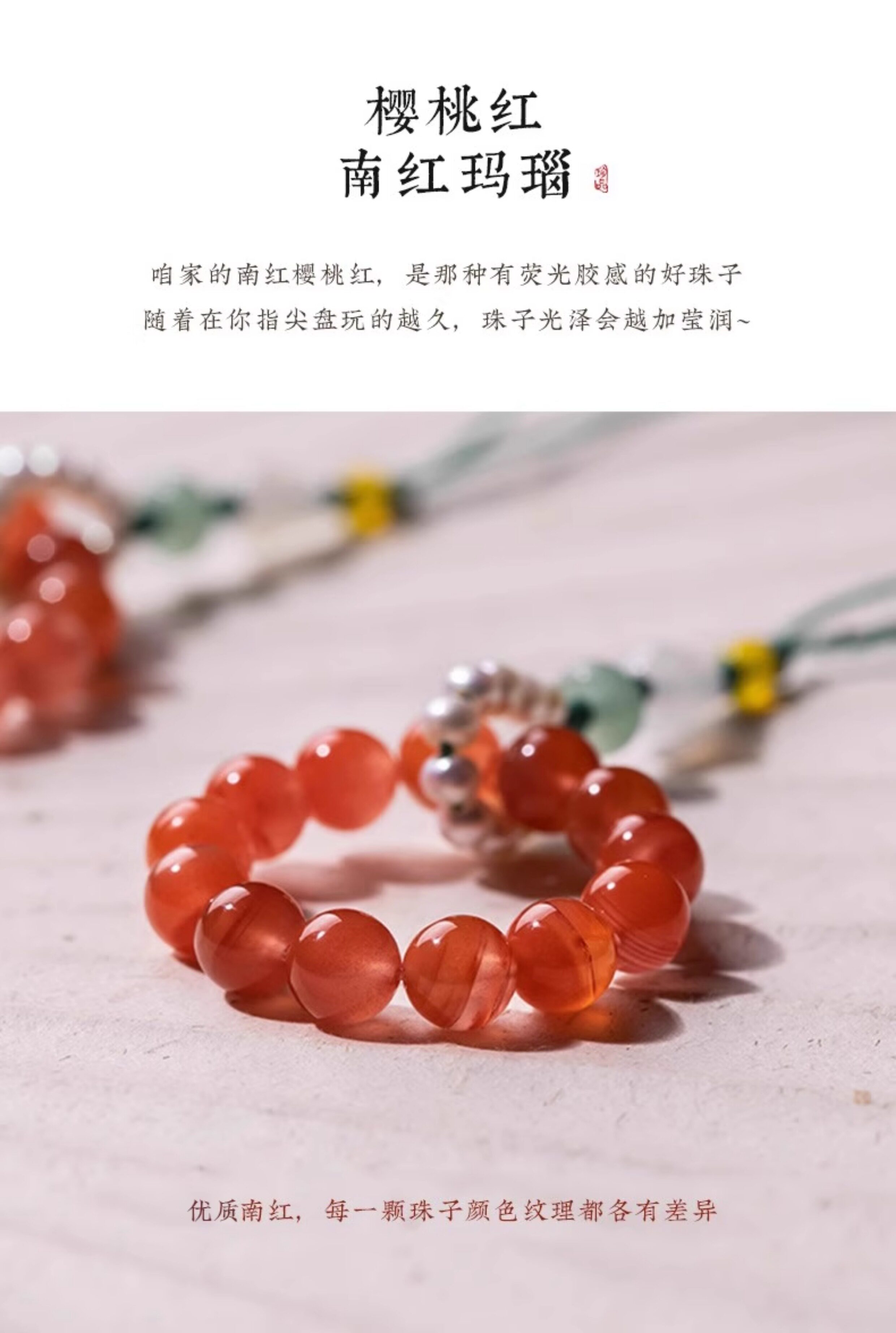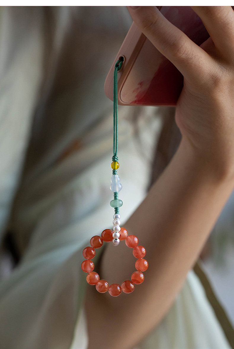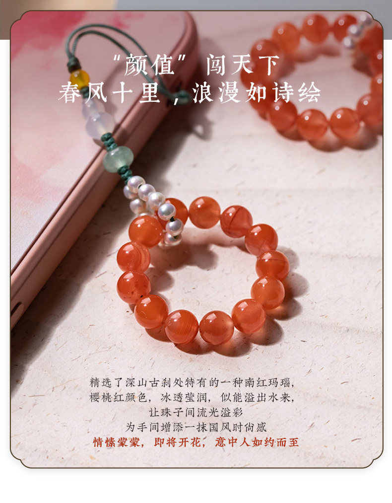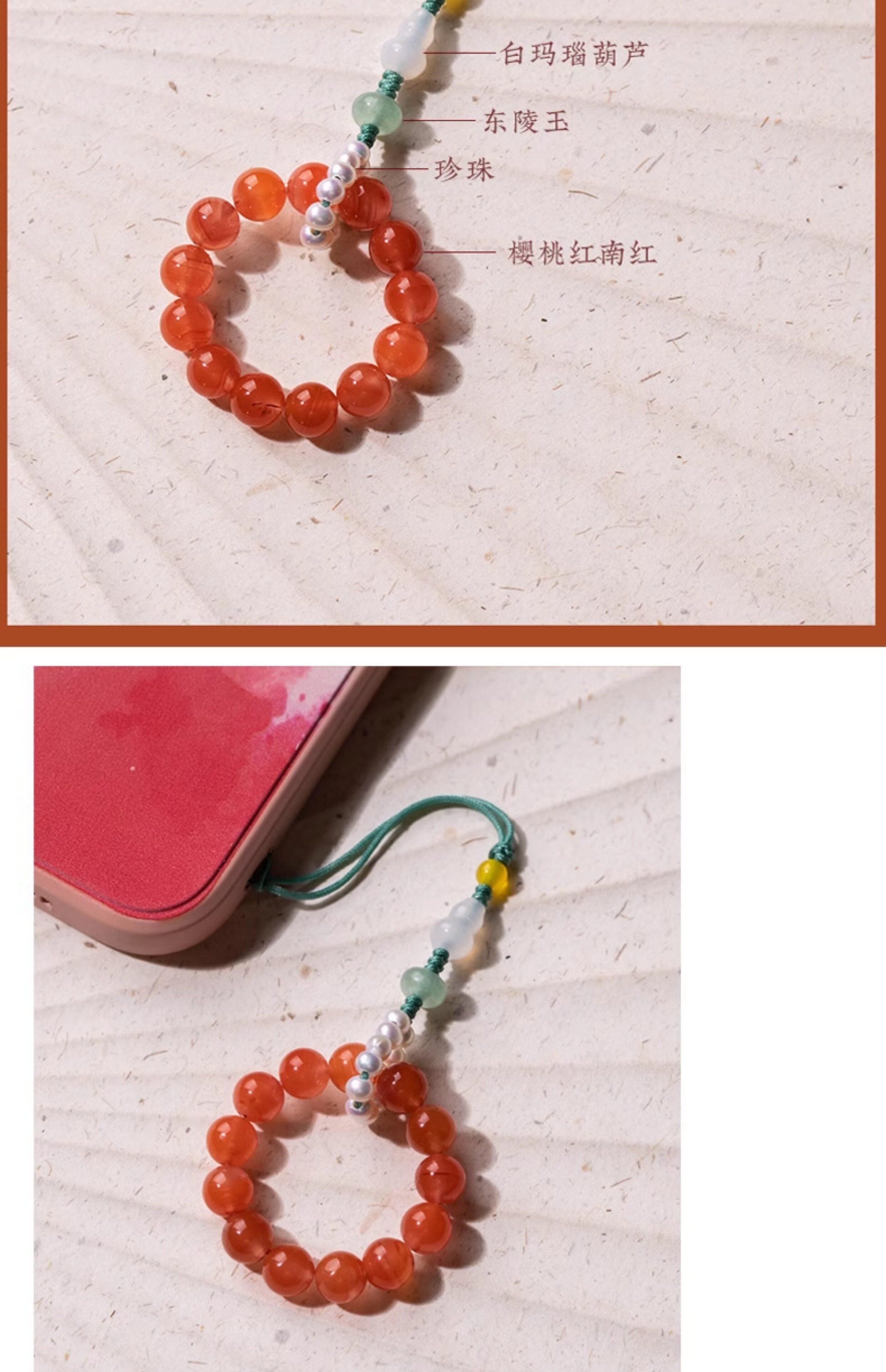 【祈愿吉品】樱桃红南红玛瑙手机链玉石小手捻指环防摔挂绳挂件