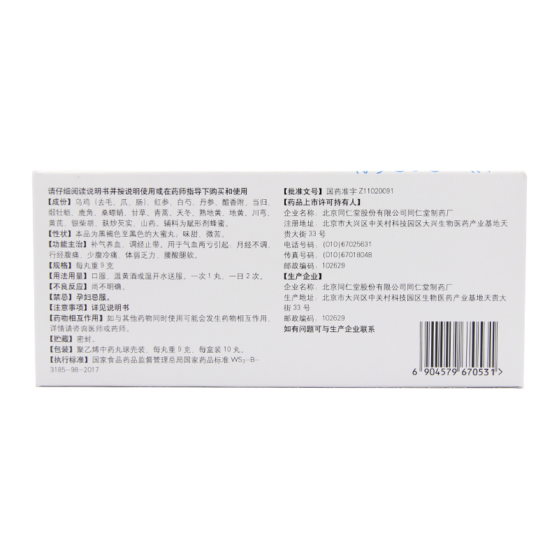 同仁堂 乌鸡白凤丸9g*10丸/盒 补气养血 调经止带 月经不调 腹痛
