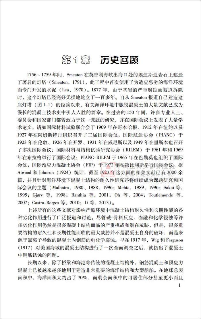 在Odd E. Gjørv教授的这本关于严酷环境下混凝土结构耐久性设计的著作中,首先进行了历史回顾;随后对混凝土结构的实际性能进行了描述,这些结构包括港口结构,桥梁结构,海洋结构和其他结构;然后详细讨论了水泥基材料中的钢筋锈蚀及其劣化过程;在第五章中作者还描述了海洋混凝土结构和陆上混凝土结构的耐久性要求;然后用概率理论对钢筋锈蚀问题进行了分析,这一点特别重要,因为结构的服役寿命预测永远不可能是确定性的,所以概率方法是唯一可行的方法;随后详细讲解了钢筋的防护策略和措施,如阴极保护和表面防护等;在第十章中,探讨了如何控制氯离子向已有结构中的渗透,介绍了用于提高混凝土耐久性的防护措施;在前述基本理论基础上,作者挑选了三个实际工程对结构耐久性设计进行了详细说明;最后讨论了钢筋混凝土结构全寿命成本问题以及服役寿命的评估问题。在这本书的最后部分附加了大量用于深入研究的参考文献和更详细的资料信息。