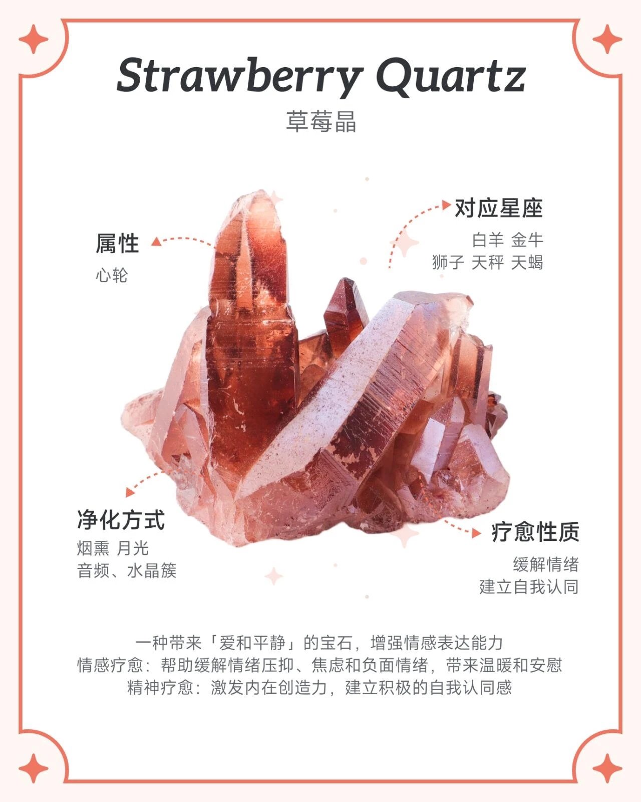 心轮和爱、情感平衡、自我接纳有关,草莓晶对应心轮,能够帮助人们更好地感受爱,实现内在和谐。