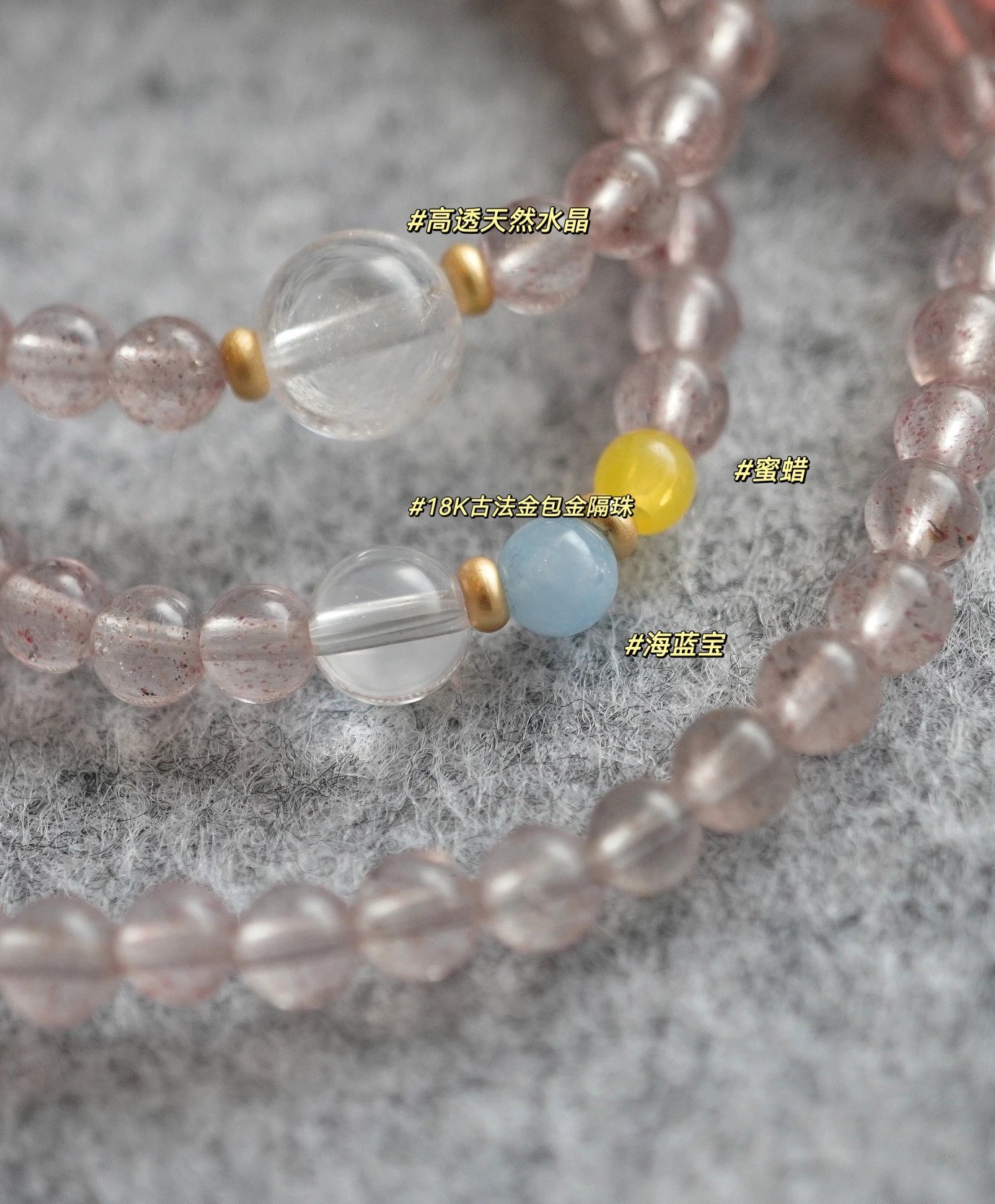 天然高透草莓晶+白水晶+海蓝宝+翡翠+蜜蜡+南红+18K古法金