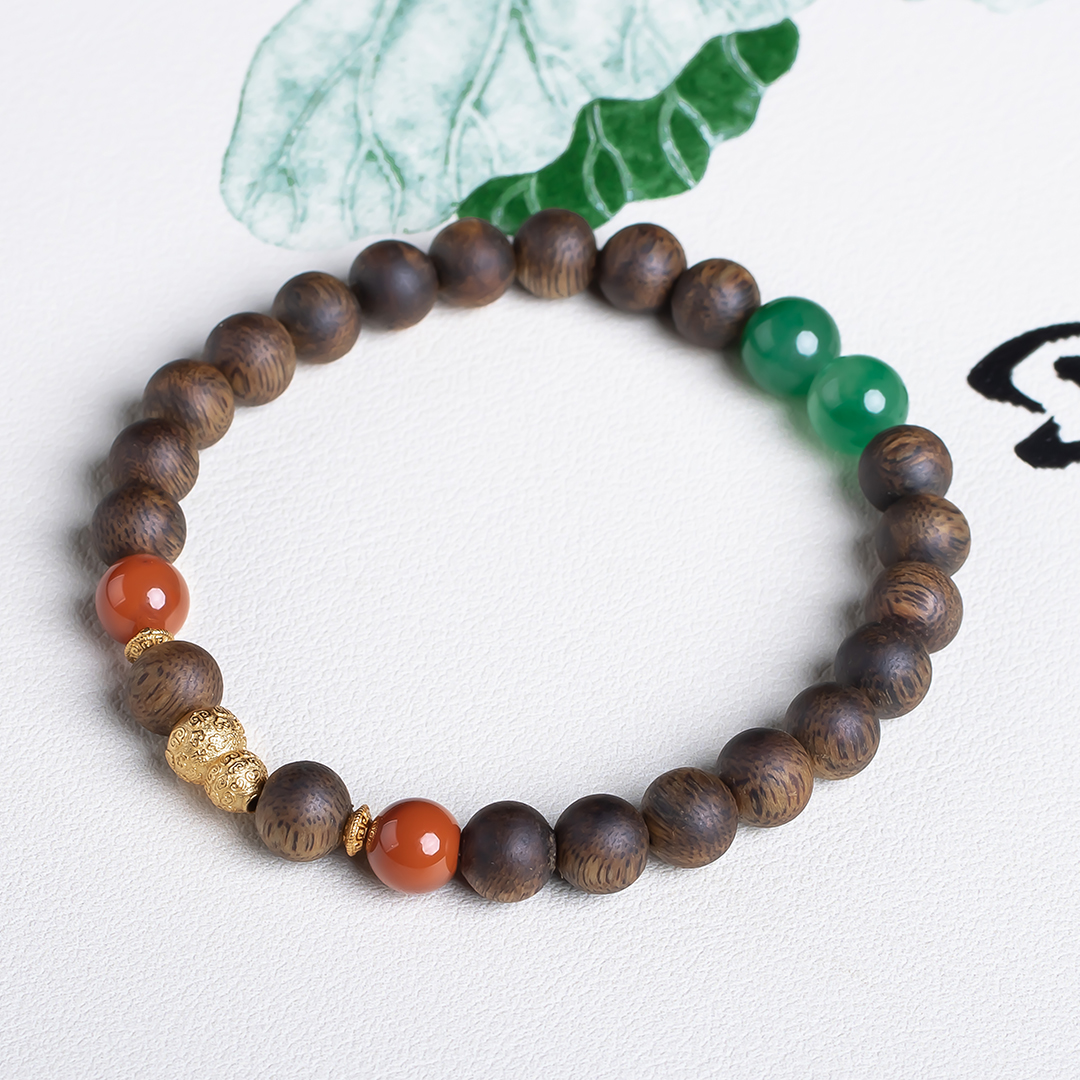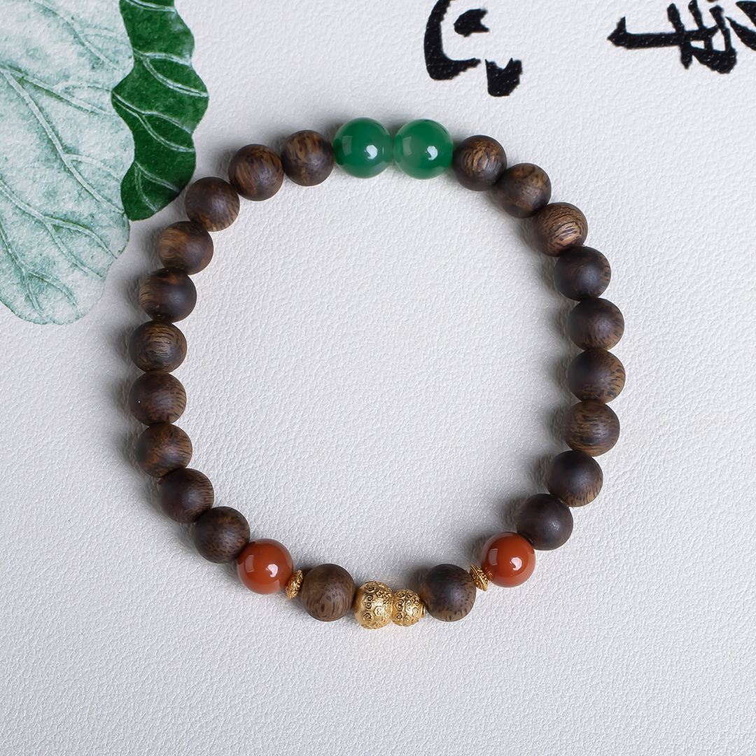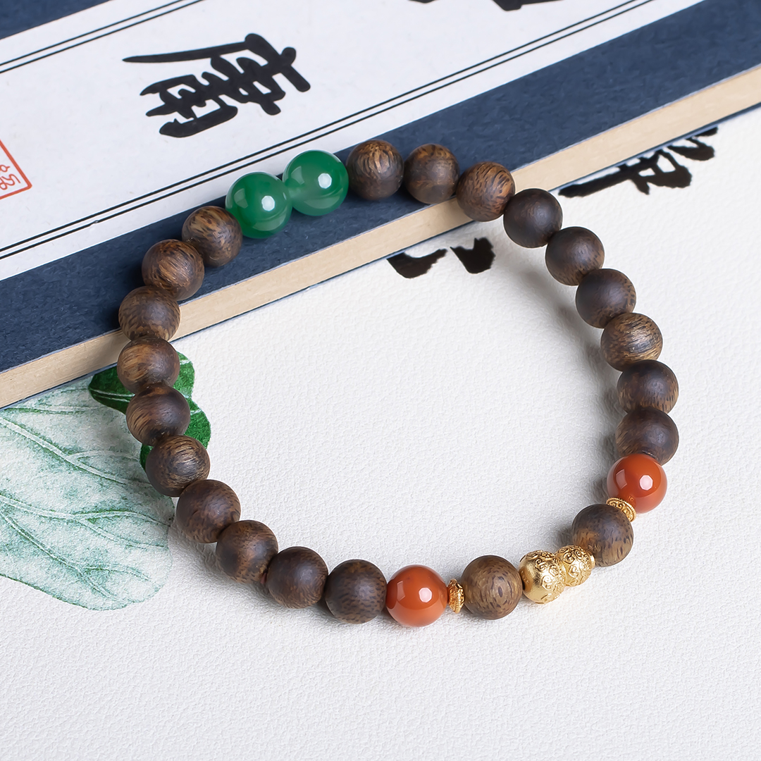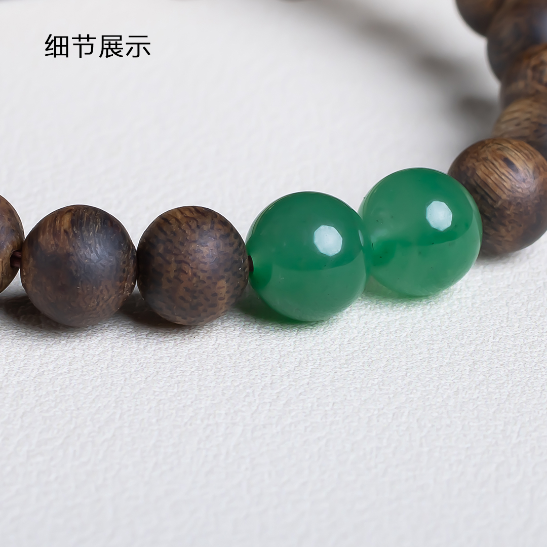 xy0554沉香+南红非洲翠手串,天然沉香约7.4mm,原色原味,香味自然清甜,南红非洲翠红绿相映,简约时尚,搭一枚银葫芦,吉祥、护主,有福禄相伴,上手大方优雅。