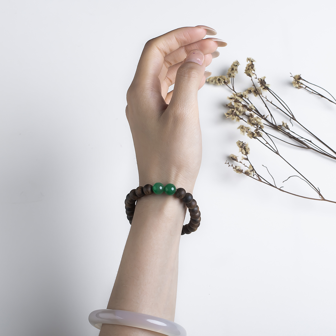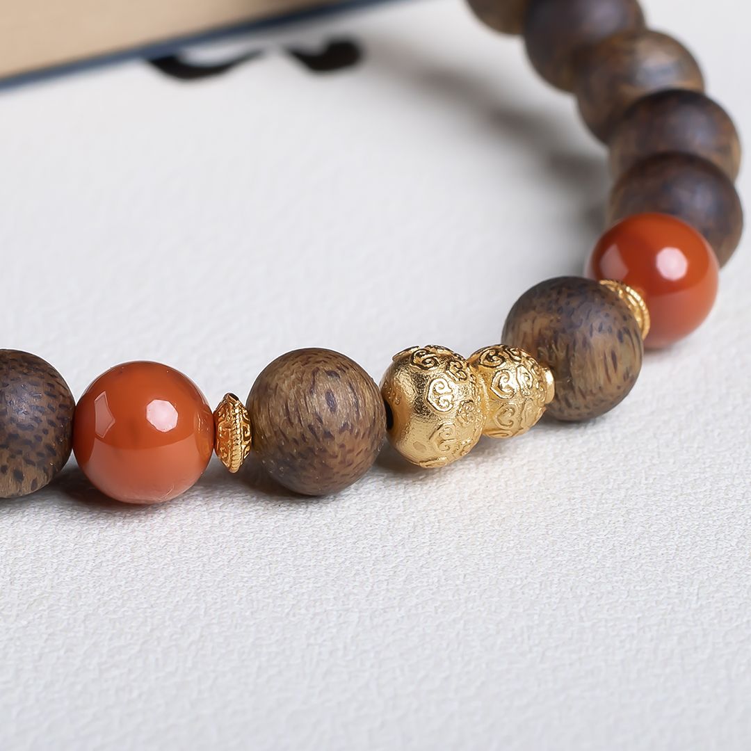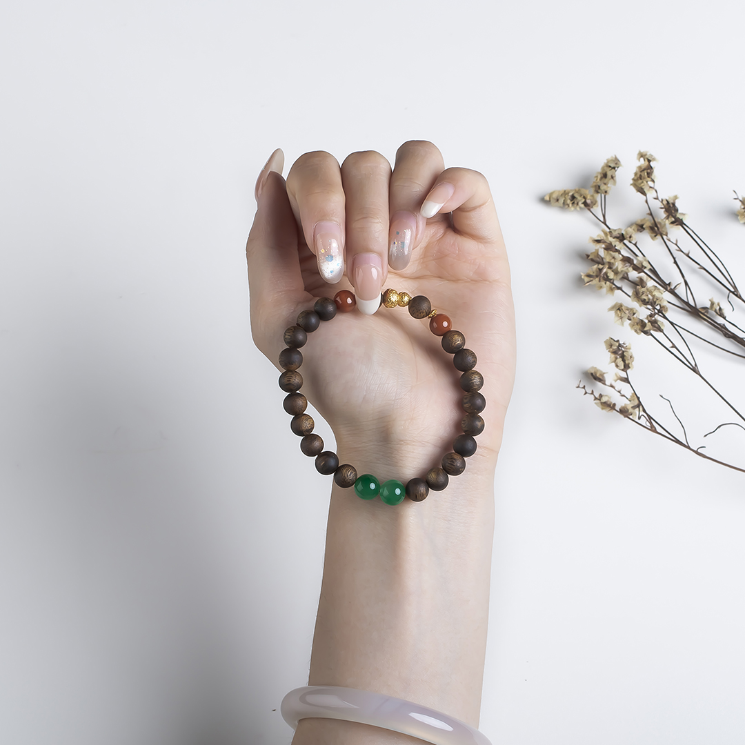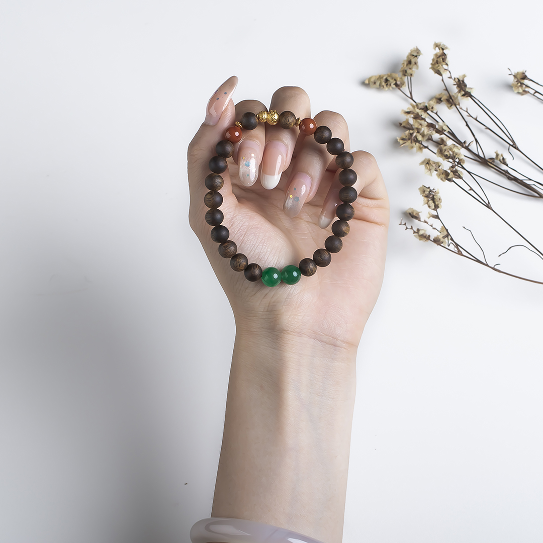xy0554沉香+南红非洲翠手串,天然沉香约7.4mm,原色原味,香味自然清甜,南红非洲翠红绿相映,简约时尚,搭一枚银葫芦,吉祥、护主,有福禄相伴,上手大方优雅。