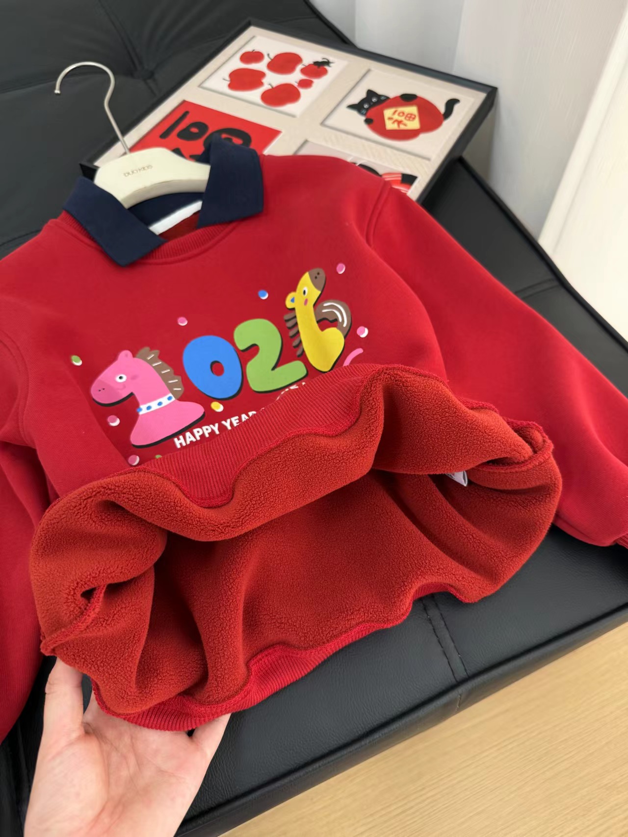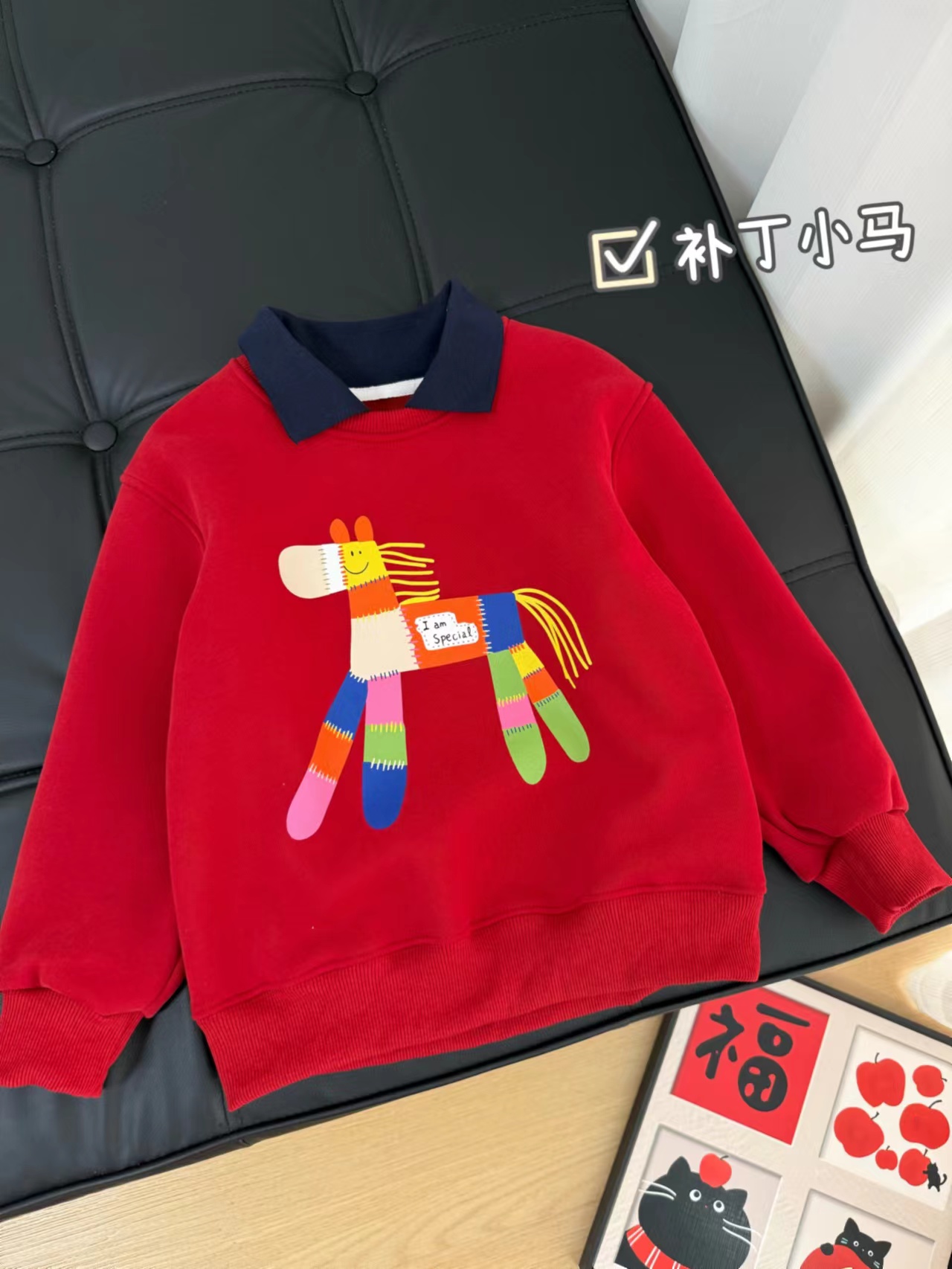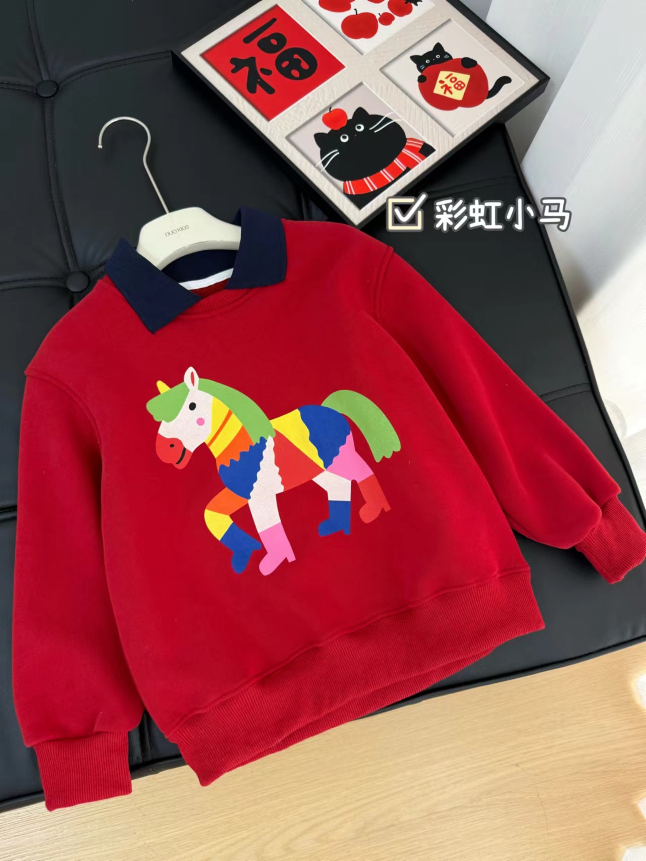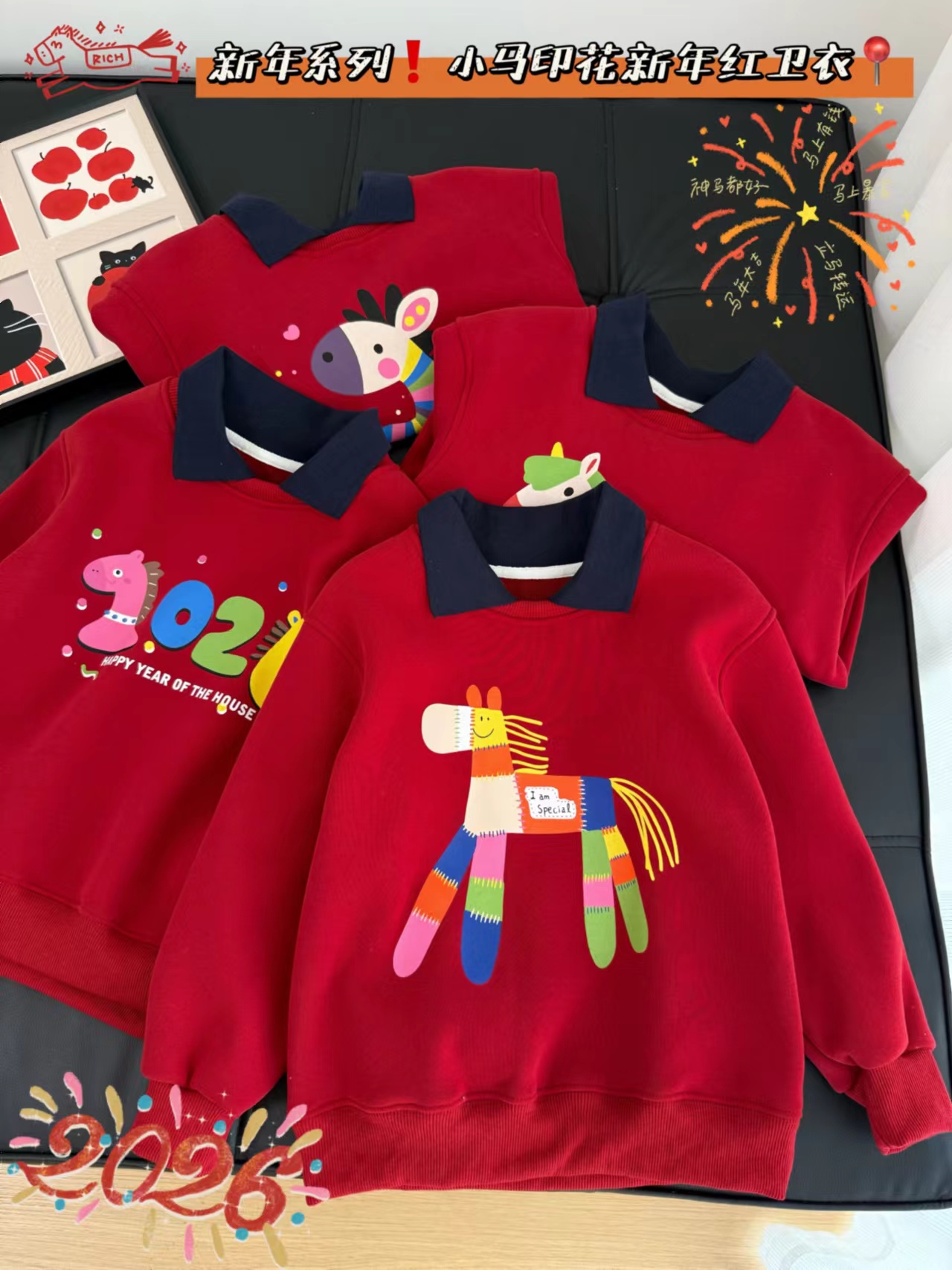 F011370浓浓中国年氛围拿捏住!小马印花内里夹绒软糯保暖儿童红色卫衣