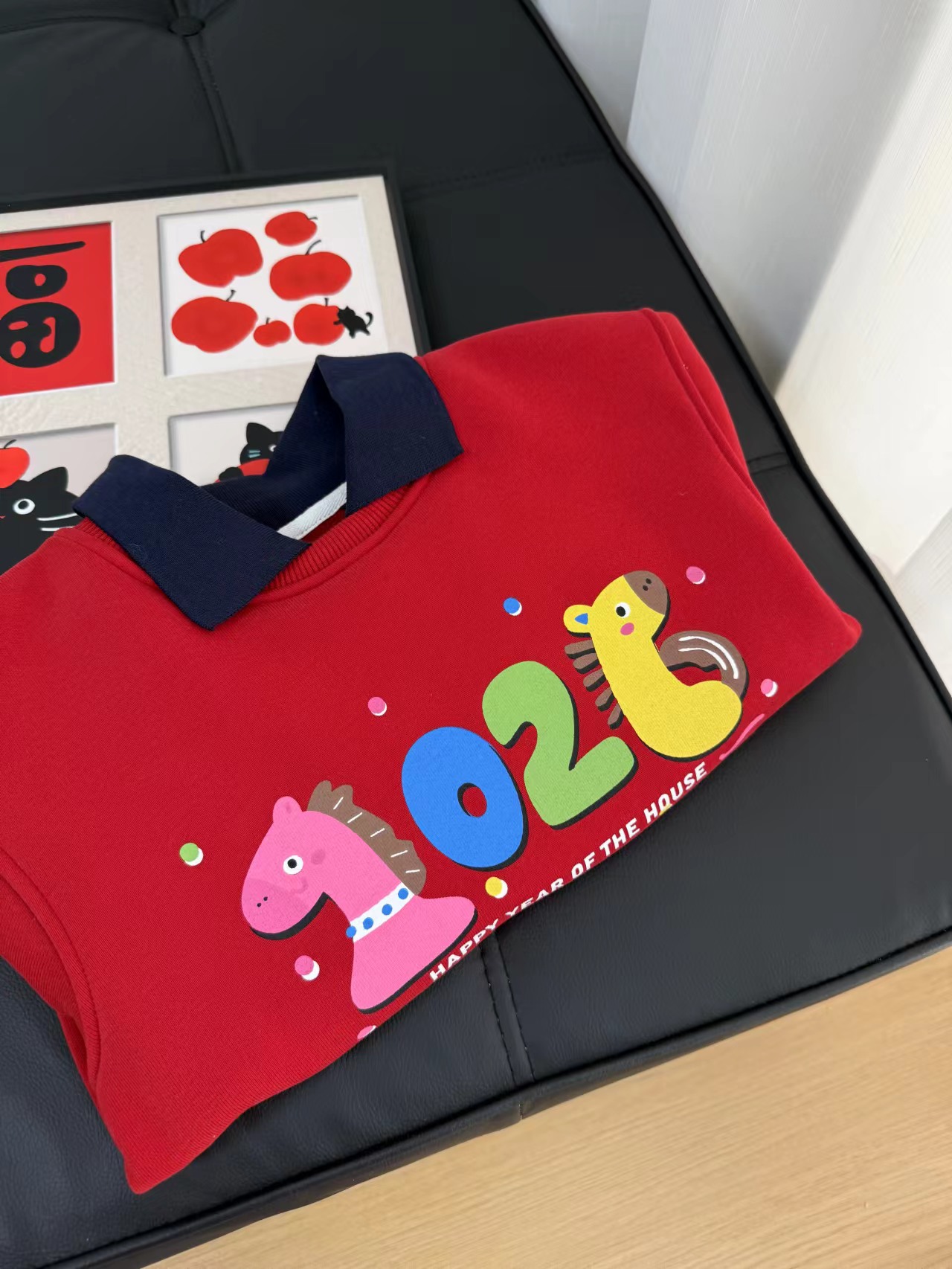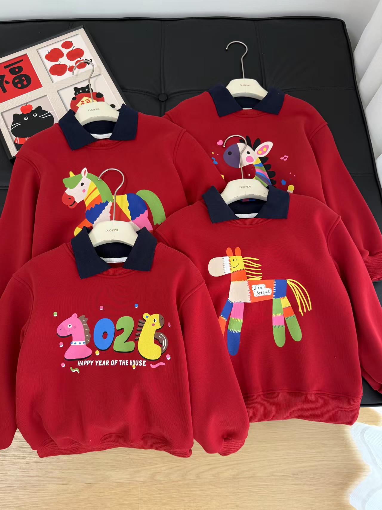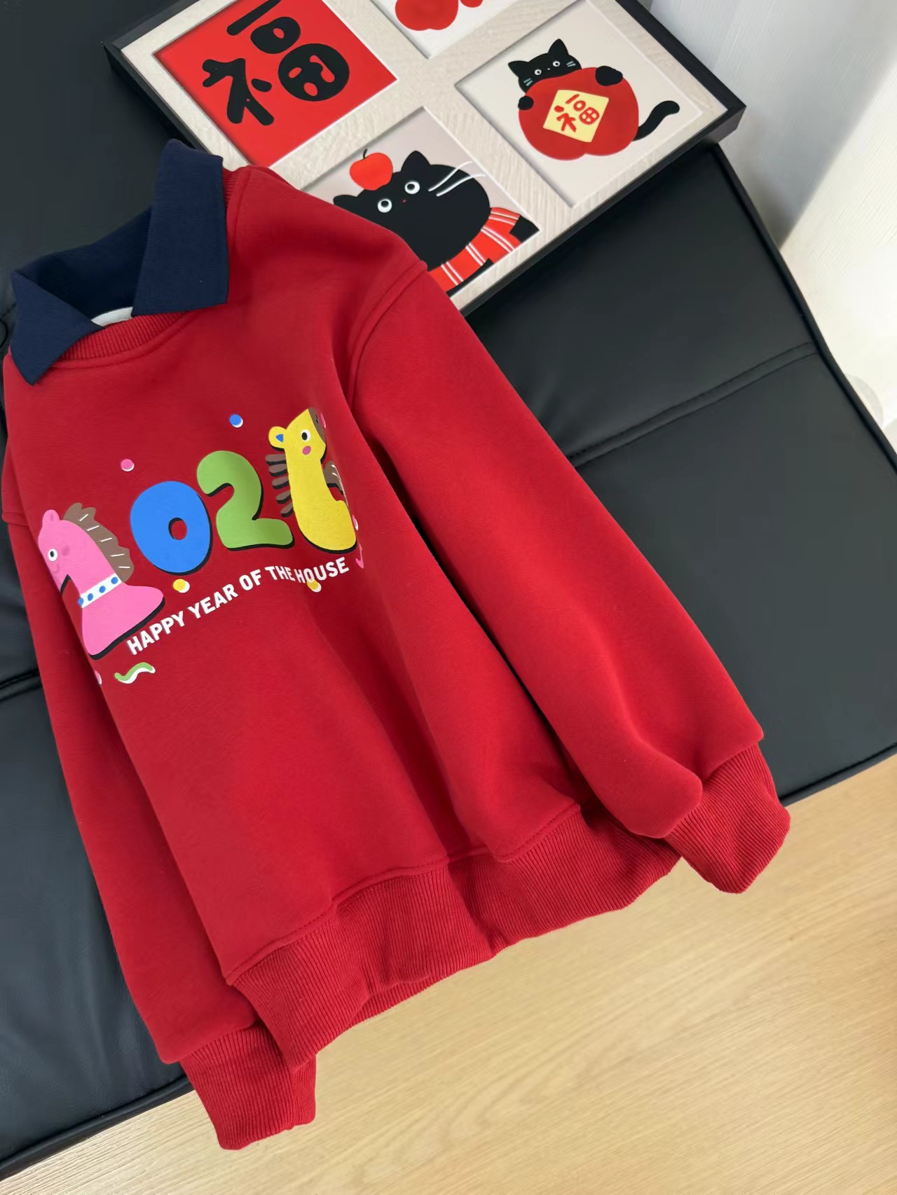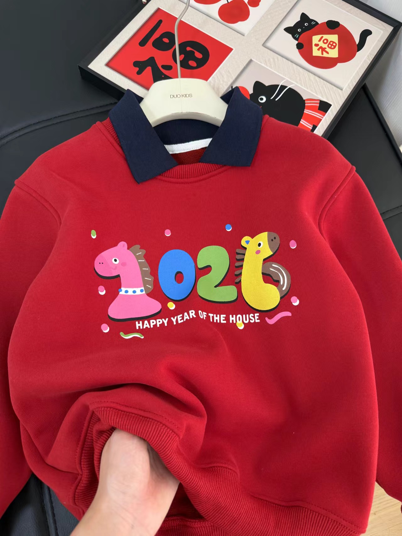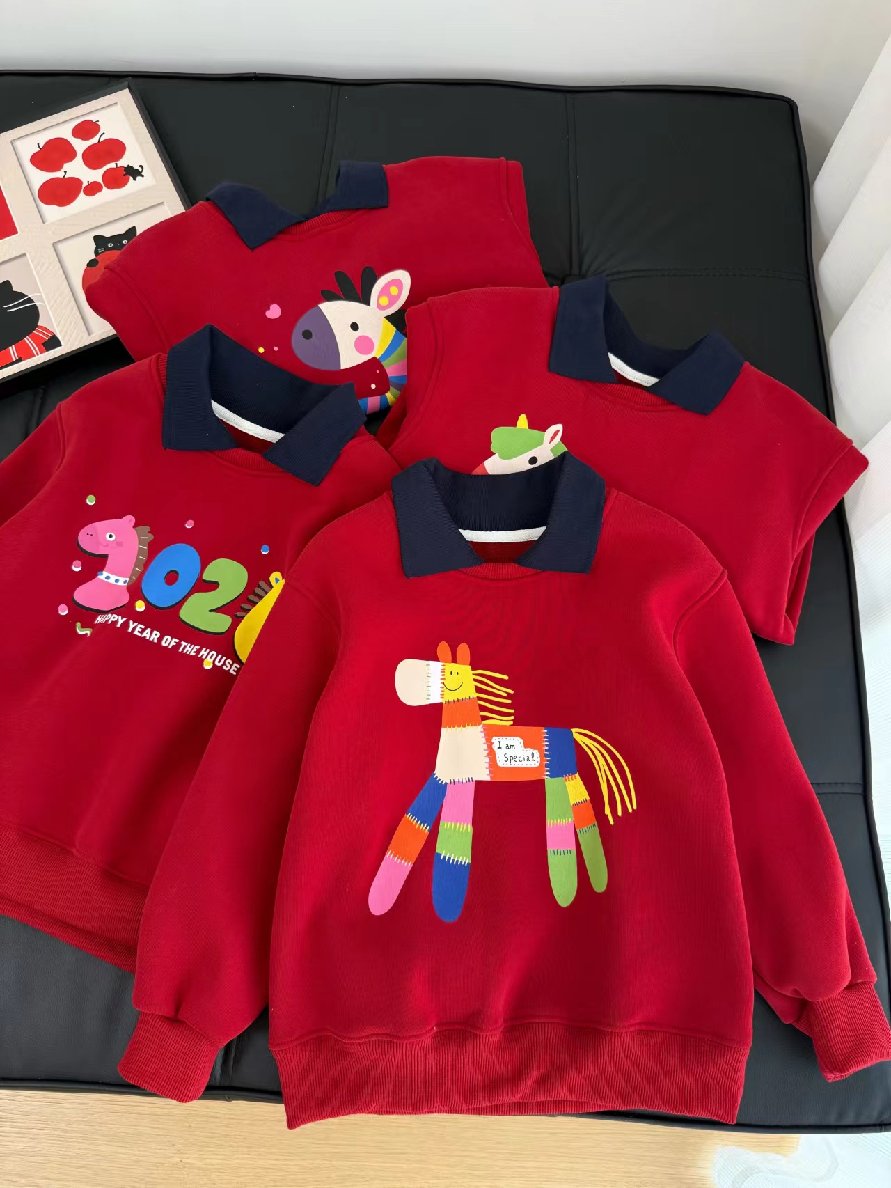 F011370浓浓中国年氛围拿捏住!小马印花内里夹绒软糯保暖儿童红色卫衣