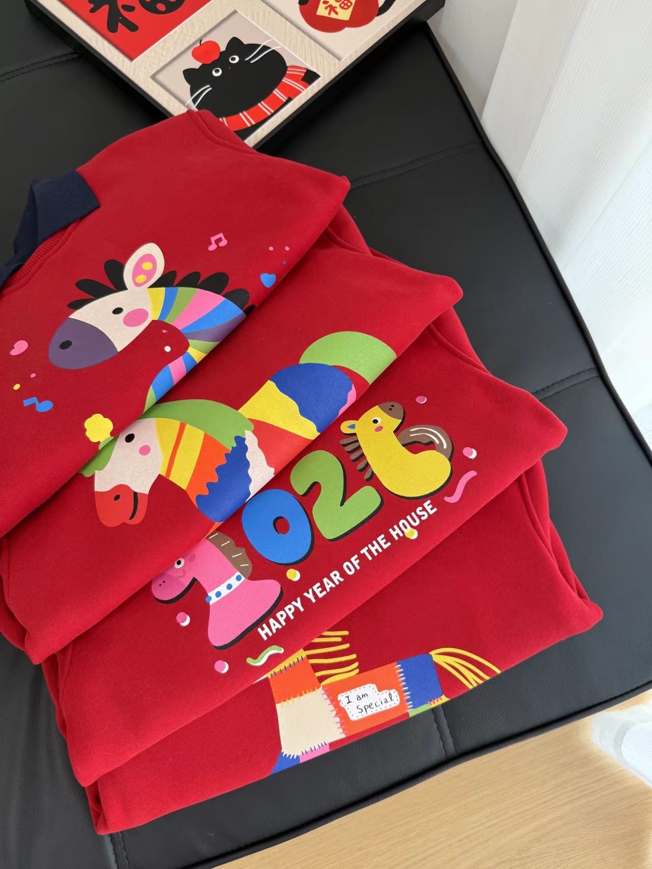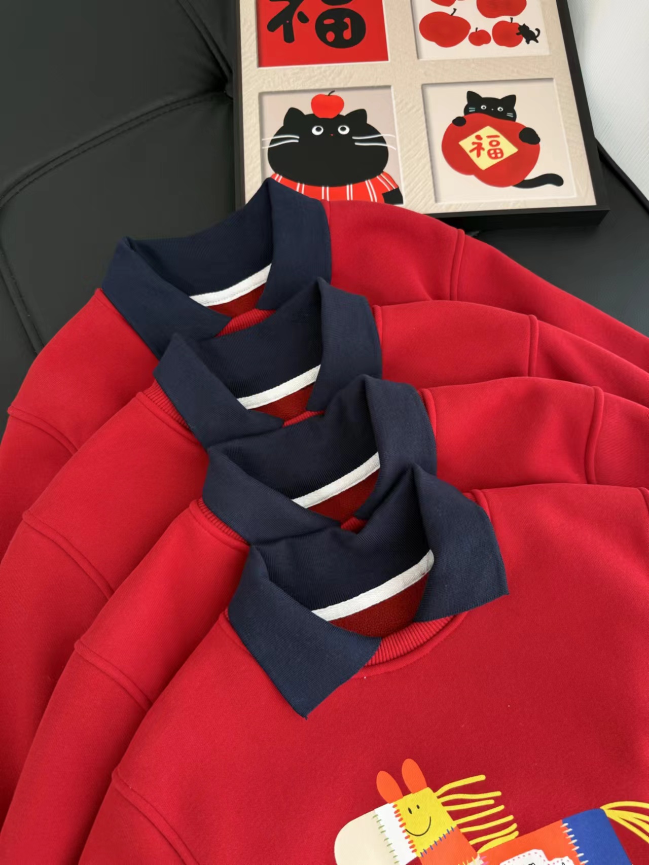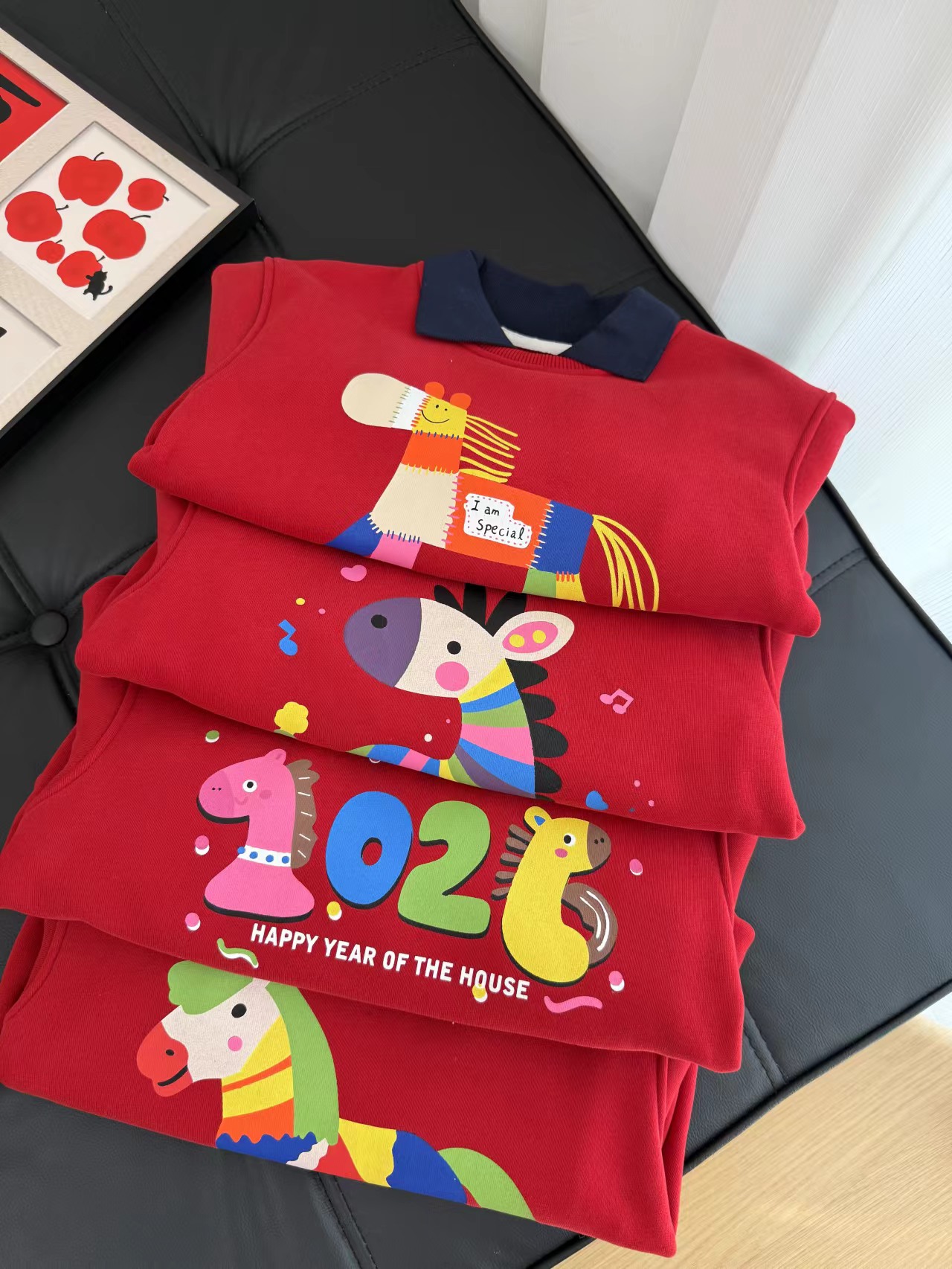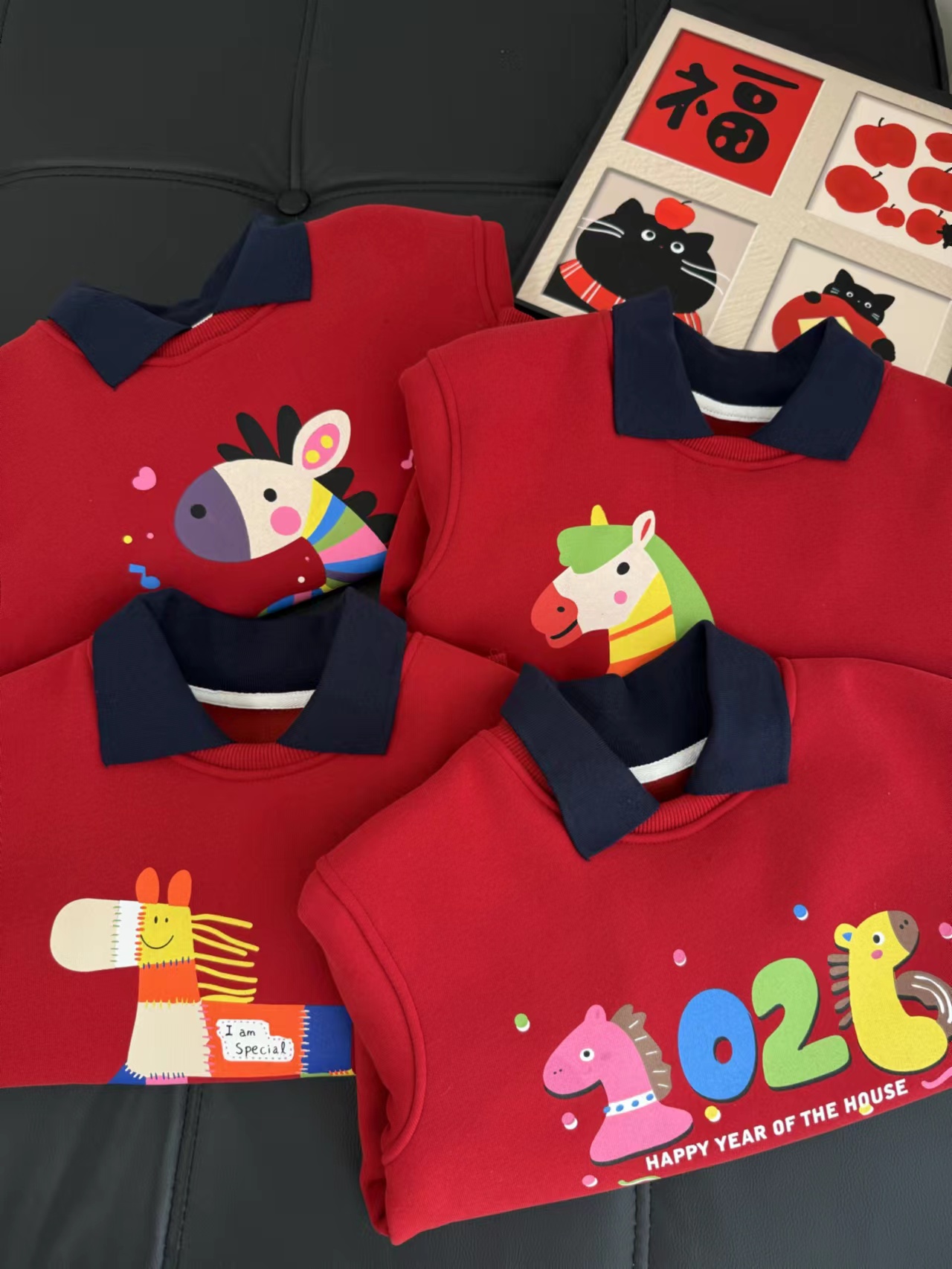 F011370浓浓中国年氛围拿捏住!小马印花内里夹绒软糯保暖儿童红色卫衣