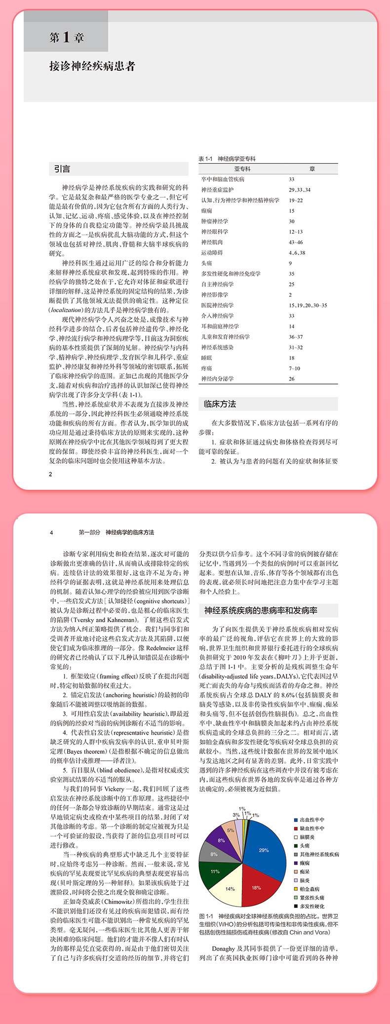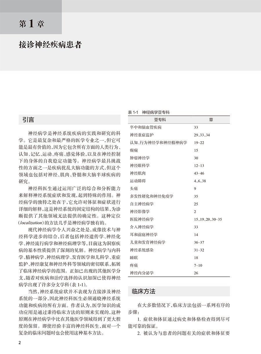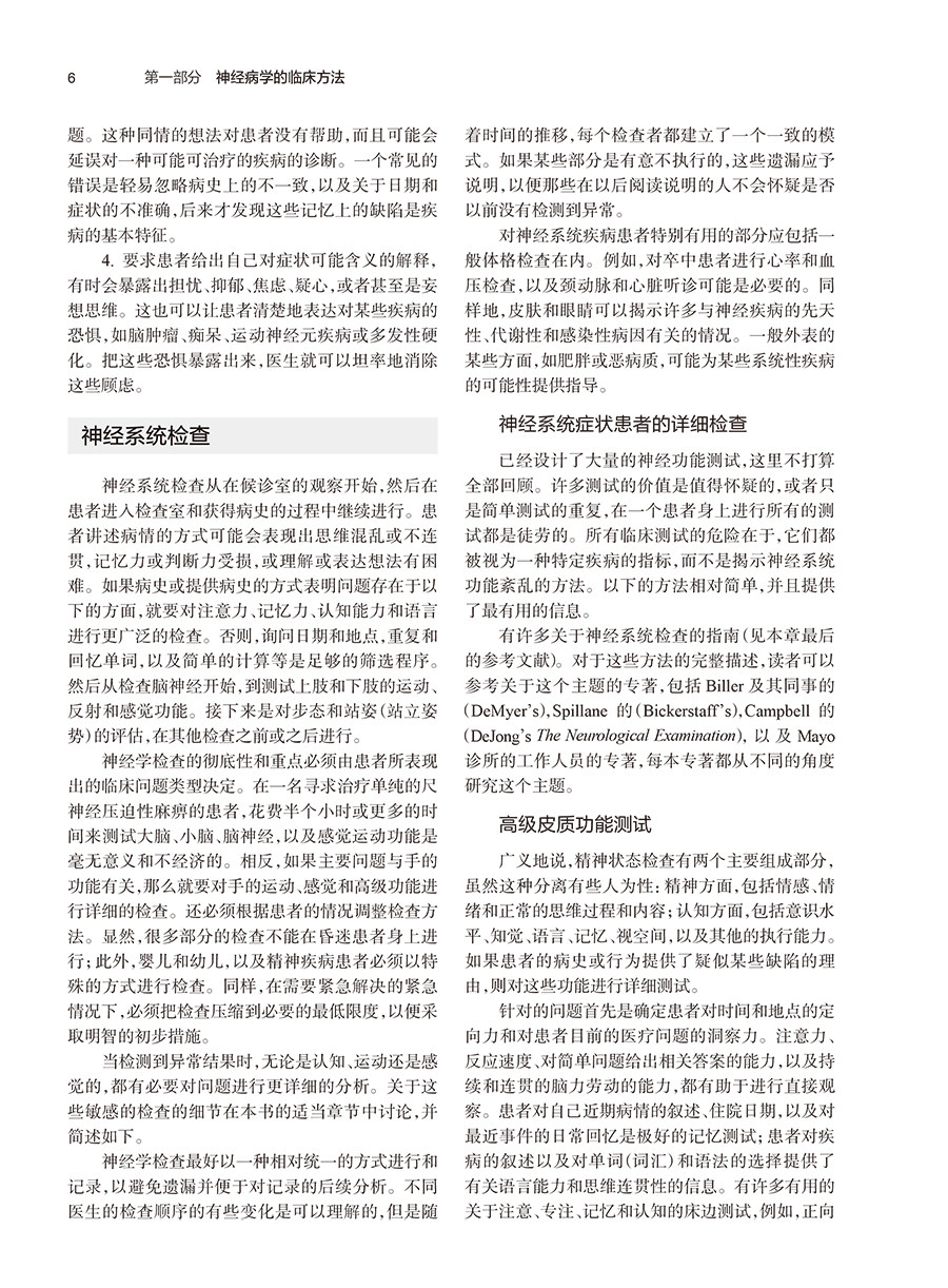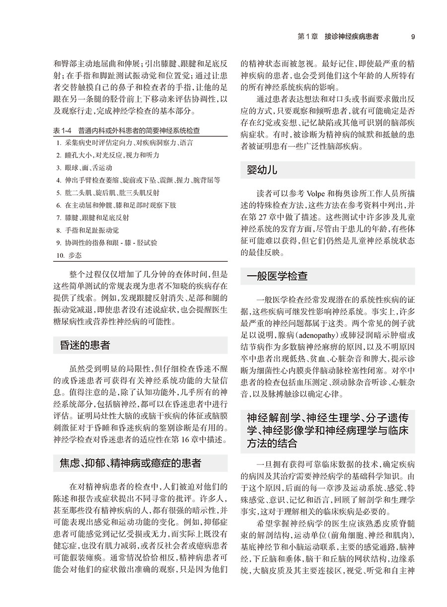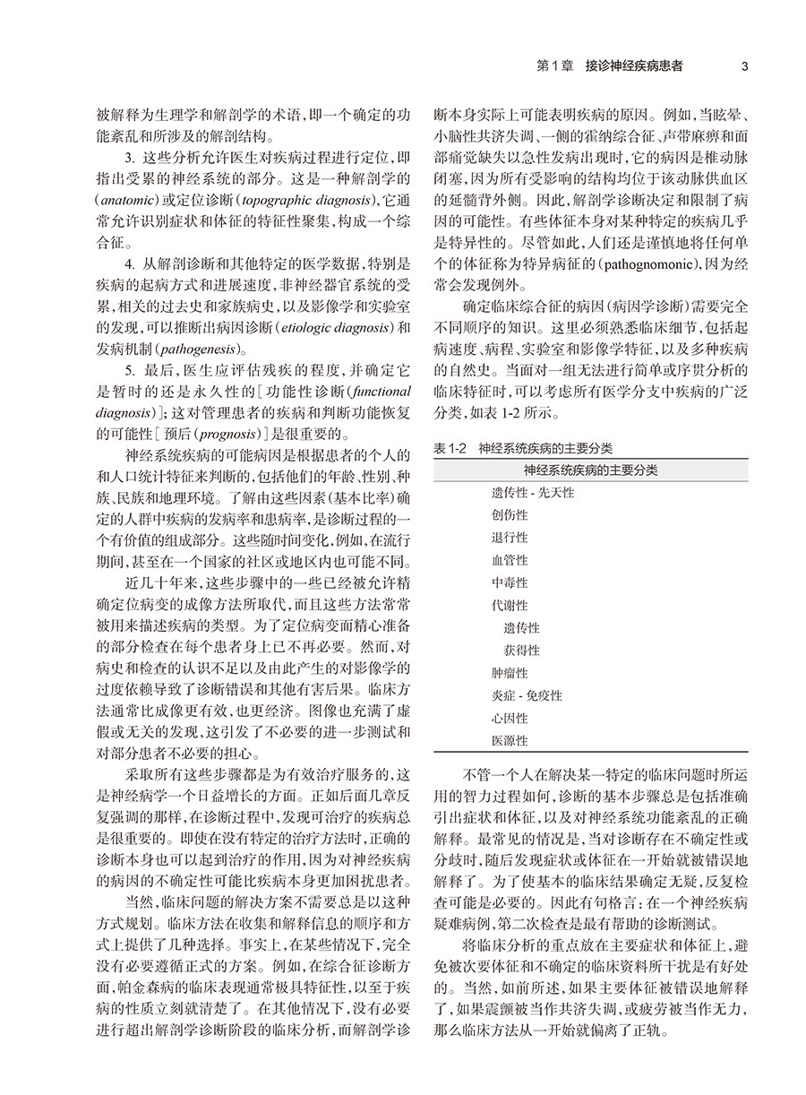 1.本书采用了Massachusetts总医院神经病学服务机构很早倡导的与传统的神经系统疾病举例法不同的分类方法,采用神经病的症状学或临床表现的方法来介绍疾病。这种由症状到综合征到疾病的排列强调了疾病演化的理性过程。在指导学生和住院医生的过程中,我们采用这种方法获得了很大成功。 2.本书特色:书中讨论了构成儿童神经病学核心的几个主题;并且以独立的章节讨论了年龄对神经系统的影响和年龄相关神经病(老年神经病学)。精神综合征和主要精神疾病在本书占有相当一部分内容,因为这些疾病在严格意义上讲是神经疾病的信念。更重要的应该承认,抑郁性疾病、神经官能症和怪癖的人格通常与很多内科疾病的表现方式相关。