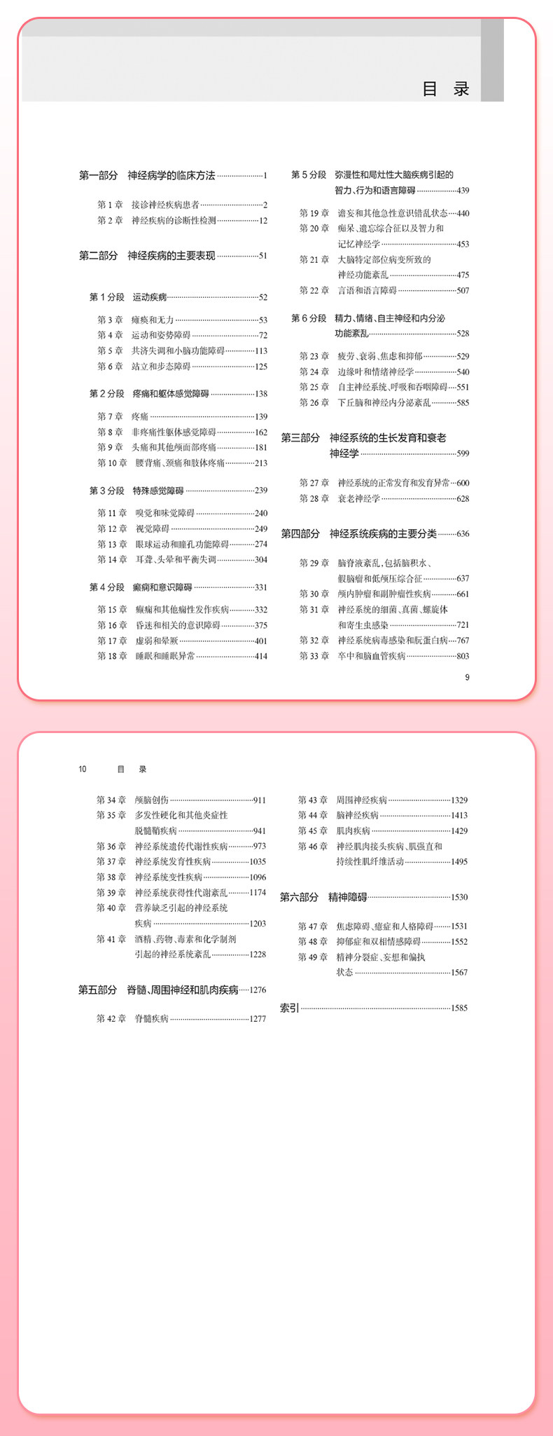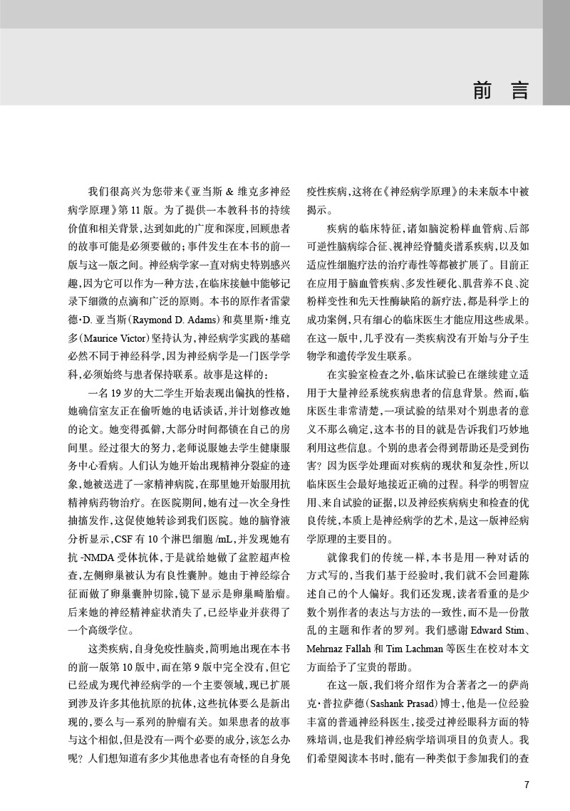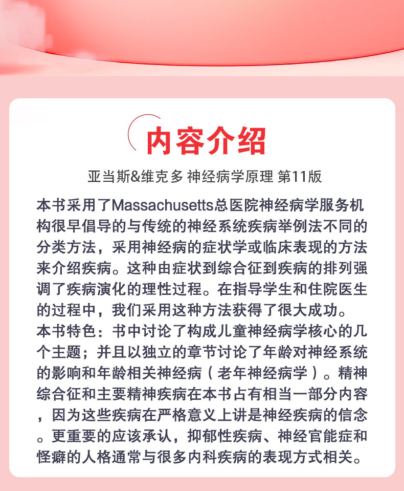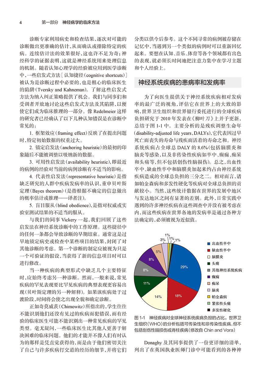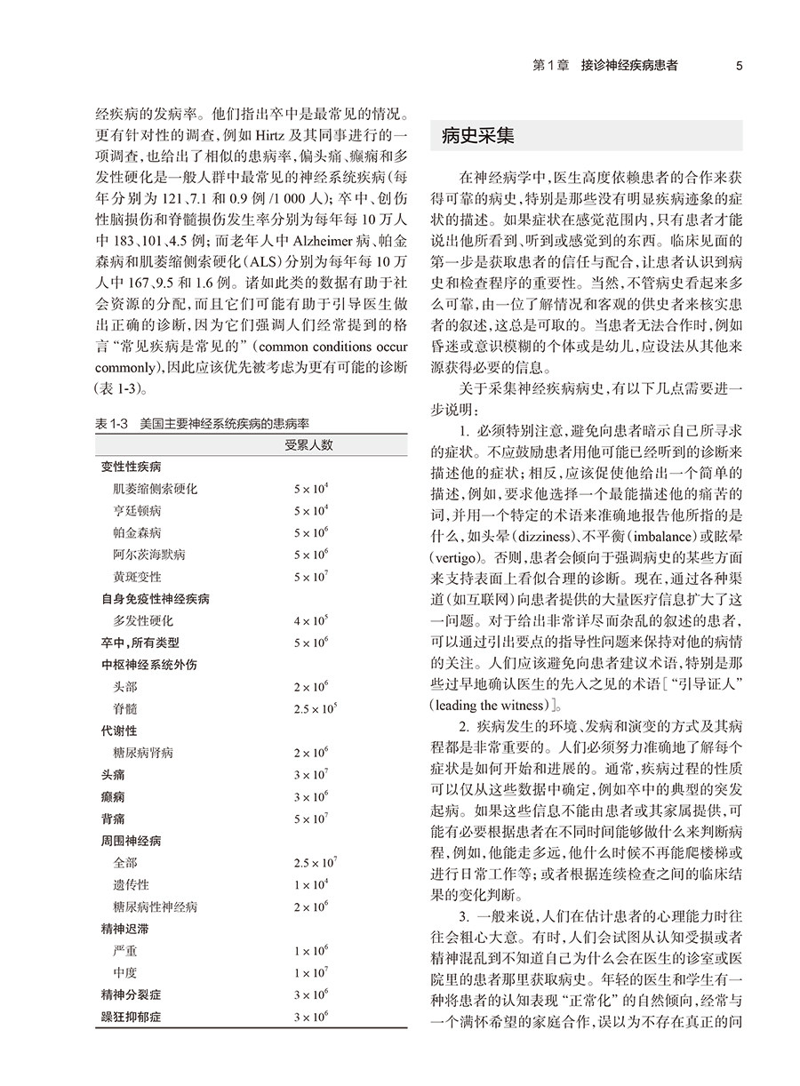 1.本书采用了Massachusetts总医院神经病学服务机构很早倡导的与传统的神经系统疾病举例法不同的分类方法,采用神经病的症状学或临床表现的方法来介绍疾病。这种由症状到综合征到疾病的排列强调了疾病演化的理性过程。在指导学生和住院医生的过程中,我们采用这种方法获得了很大成功。 2.本书特色:书中讨论了构成儿童神经病学核心的几个主题;并且以独立的章节讨论了年龄对神经系统的影响和年龄相关神经病(老年神经病学)。精神综合征和主要精神疾病在本书占有相当一部分内容,因为这些疾病在严格意义上讲是神经疾病的信念。更重要的应该承认,抑郁性疾病、神经官能症和怪癖的人格通常与很多内科疾病的表现方式相关。