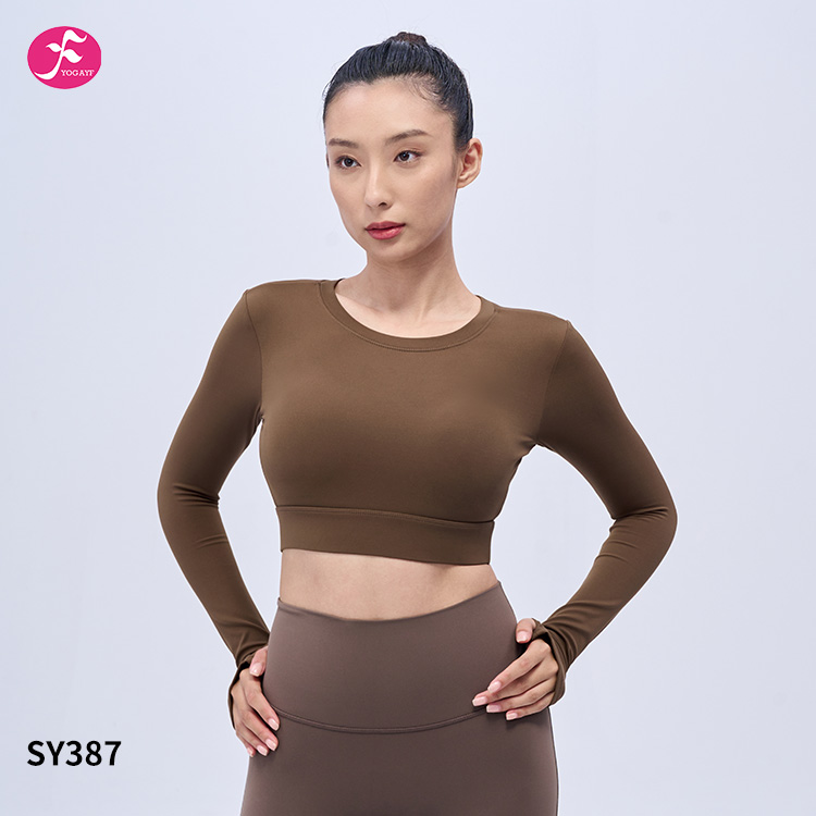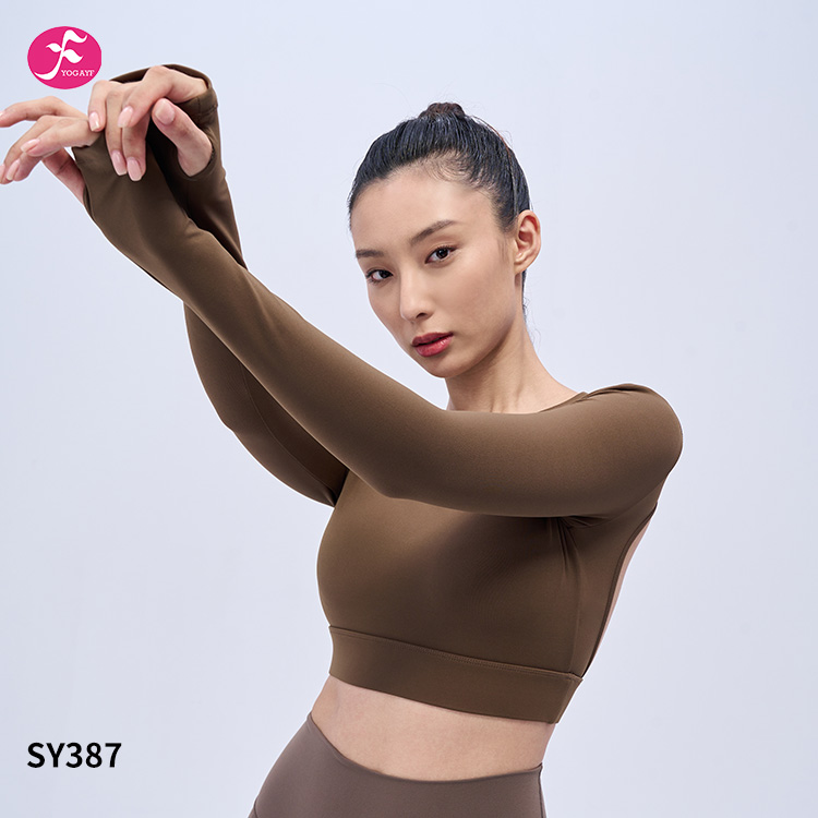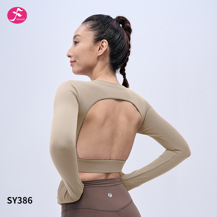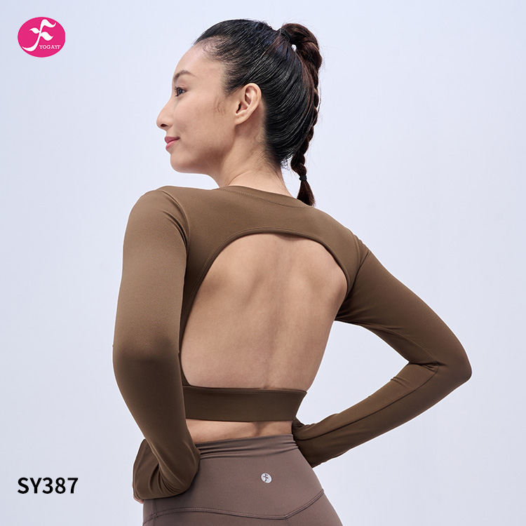 一梵新款短款紧身背部镂空自带活动水滴杯胸垫长袖上衣三色 黑色 卡其色 橄榄绿