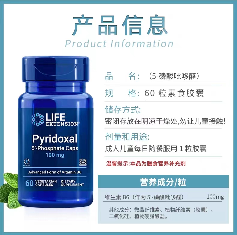 沿寿LIFE EXTENSION Pyridoxal 5'-Phosphate Caps 100mg(维生素B6)60粒