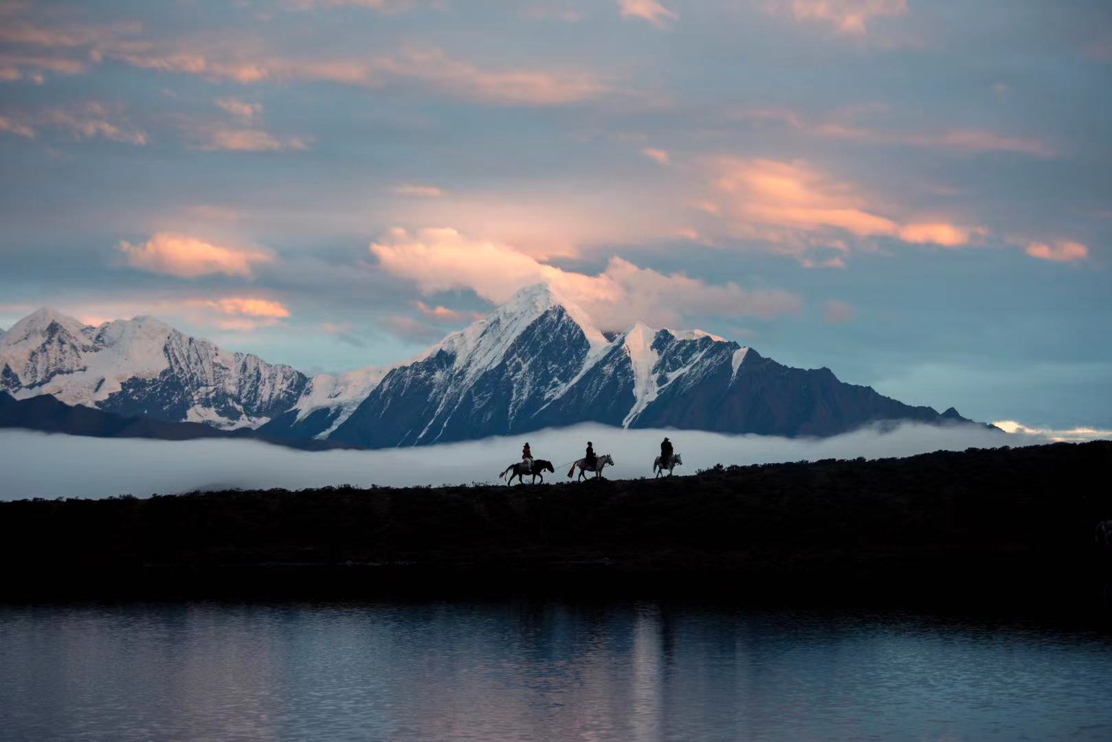 日落时分,贡嘎山的倒影在湖面显现出来
